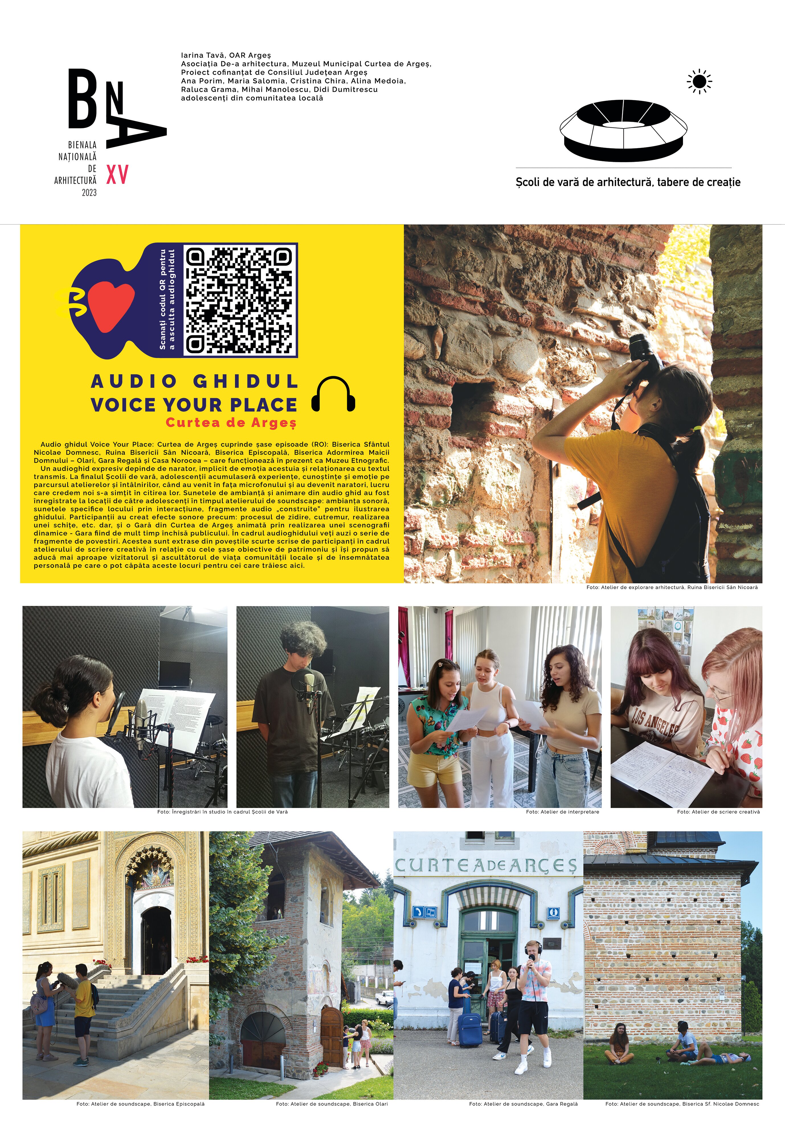 Școala de vară Voice Your Place: Curtea de Argeș se concentrează asupra comunității, apartenenței și valorificării mediul construit, prin realizarea unui audio ghid narat de adolescenți despre arhitectura de patrimoniu din orașul lor. Obiectivul ghidului audio este să devină o unealtă social-pedagogică ce implică adolescenții într-un proces ludic, dar conștient de explorare, aprofundare și apreciere a patrimoniului. Ca promotori ai patrimoniului și ai locului lor natal, tinerii au avut un cadru unde să își dezvolte potențialul creativ și să fie membri implicați în comunitatea lor. Audio ghidul Voice Your Place: Curtea de Argeș cuprinde șase episoade: Biserica Domnească Sfântul Nicolae, Ruina Bisericii Sân Nicoară, Biserica Episcopală, Biserica Adormirea Maicii Domnului – Olari, Gara Regală și Casa Norocea – care funcționează în prezent ca Muzeu Etnografic. Proiectul Voice Your Place se adresează comunității locale prin tinerii participanți ai școlii de vară și promovarea clădirilor valoroase locale, dar și publicului larg prin produsul proiectului.