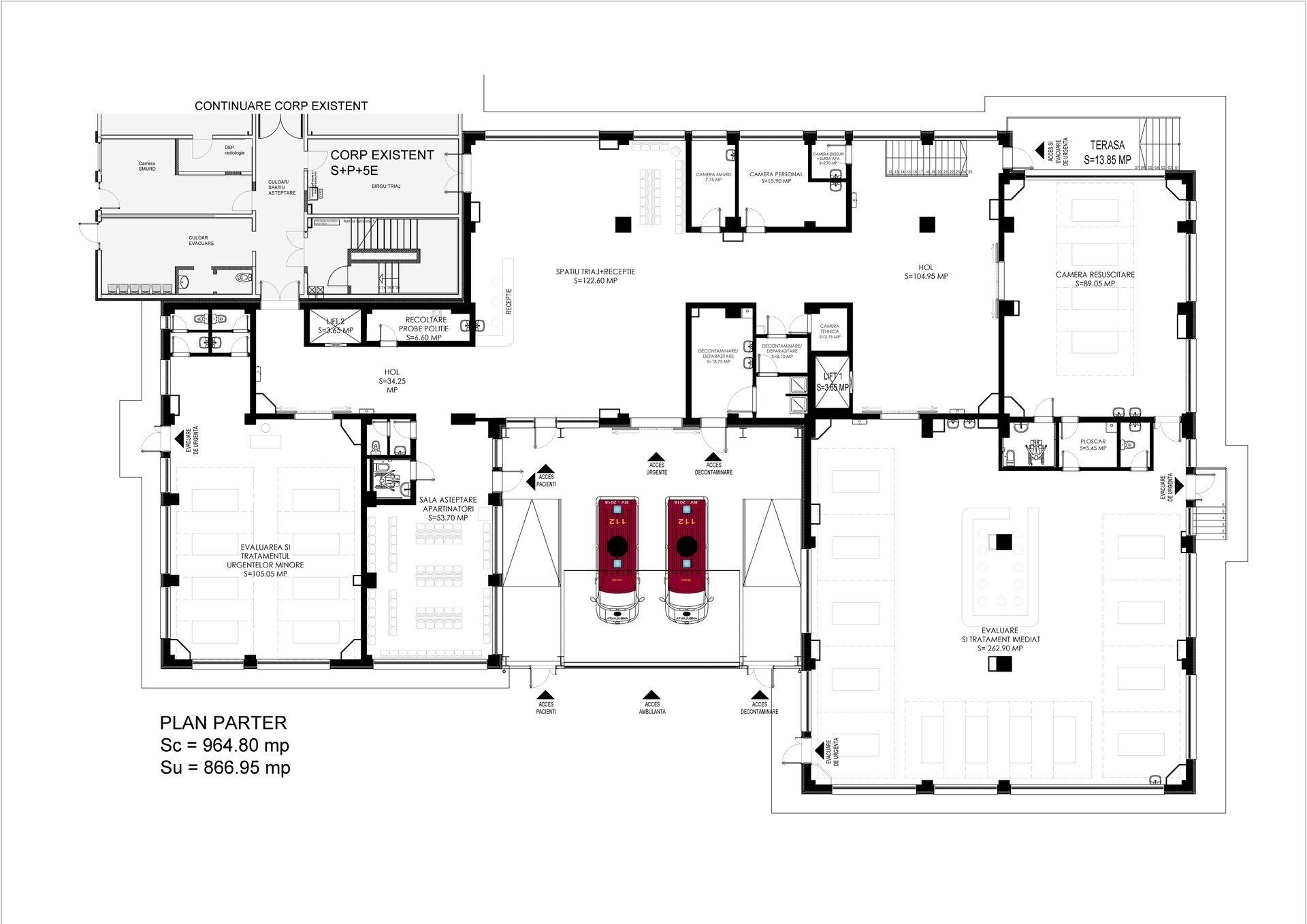 La nivelul parterului se vor gasi urmatoarele: hol de acces cu doua intrari (o intrare pentru pacientii transportati cu ambulanta si o intrare pentru cei deplasabili), spatiu triaj+receptie, camera resuscitare, evaluare si tratament imediat, grupuri sanitare, holuri, ploscar, spatii pentru decontaminare/deparazitare (cu acces direct din exterior), camera pentru SMURD, camera personal, camera de recoltare probe biologice pentru Politie, spatiu pentru evaluare si tratament imediat (pentru urgentele majore), camera tehnica, spatiu pentru evaluarea si tratamentul urgentelor minore, sala de asteptare pentru apartinatori.