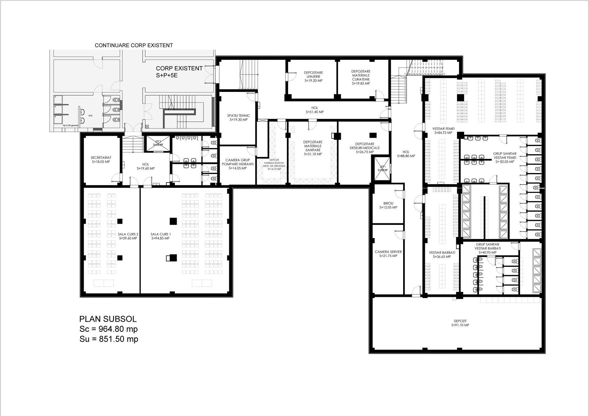 La nivelul subsolului se vor gasi urmatoarele: doua sali de curs destinate intalnirilor colective ale personalului UPU si instruirii personalului si a rezidentilor, grupuri sanitare pentru personalul medical, vestiare pentru personalul medical, spatii depozitare, holuri, secretariat, spatiu rezerva, camera server, birou, anexa, spatiu tehnic.