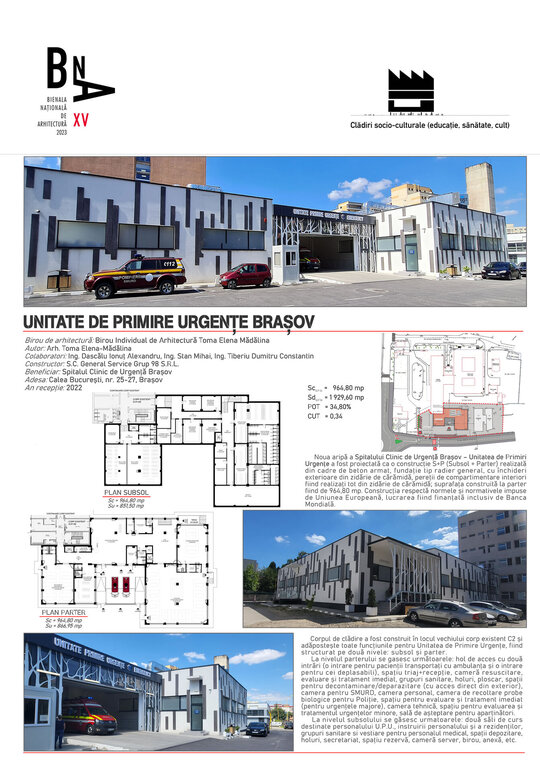 Noua aripa a Spitalului Municipal Brasov – sectia Primiri Urgente a fost proiectata ca o constructie S+P (Subsol + Parter) realizata din cadre de beton armat, fundatie tip radier general, cu inchideri exterioare din zidarie de caramida, peretii de compartimentare interiori fiind realizati tot din zidarie de caramida, iar suprafata construita la parter este de 964,80 mp.