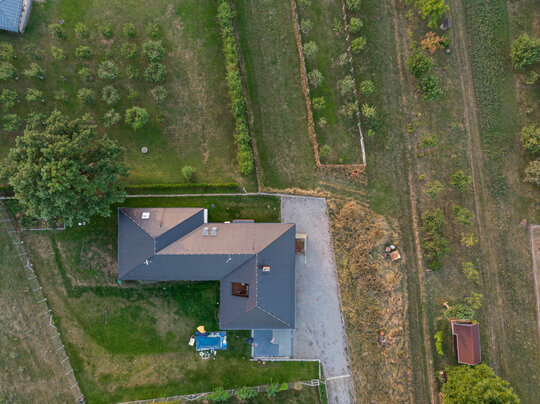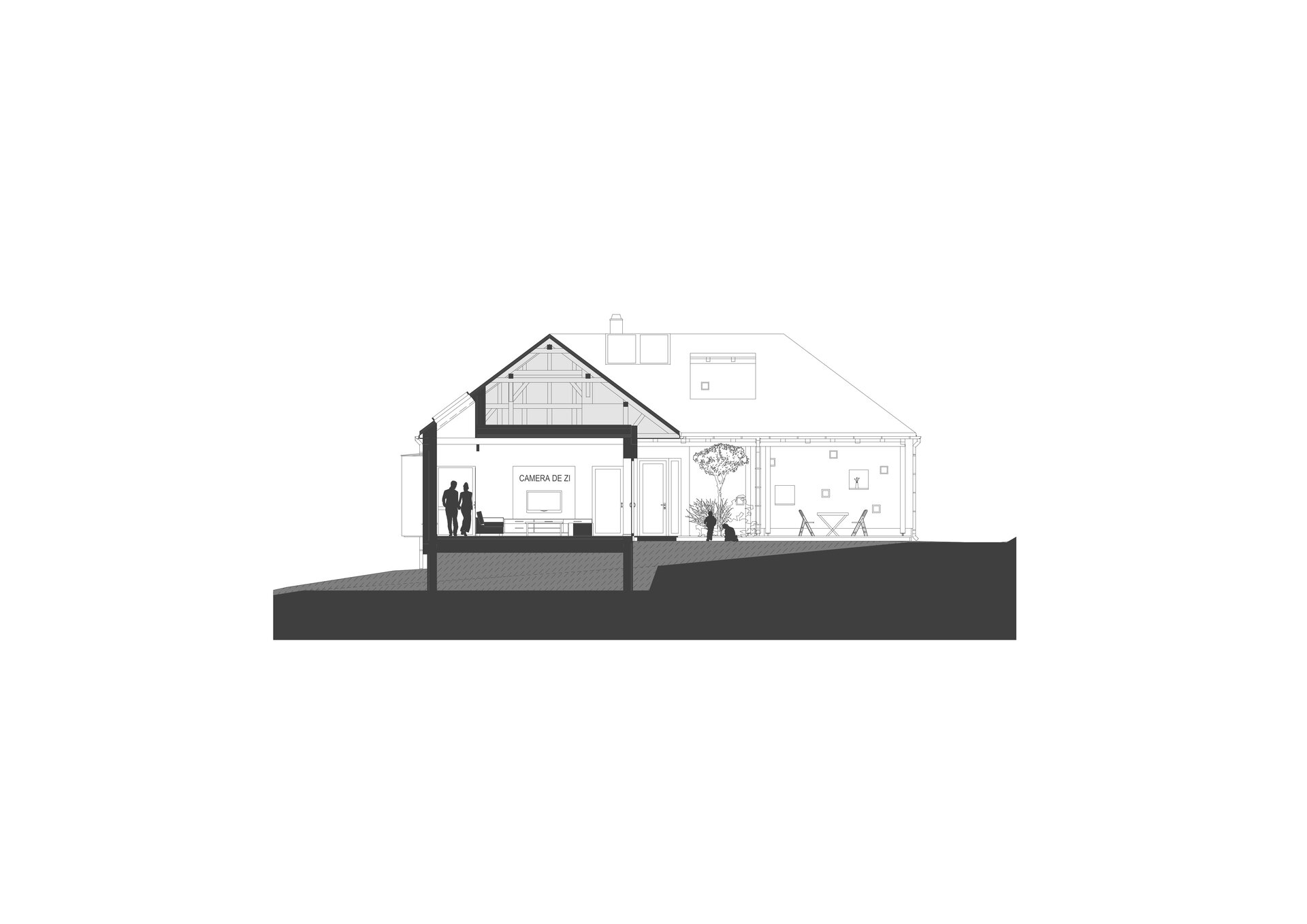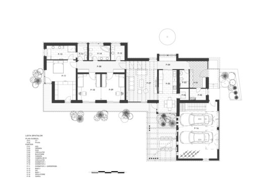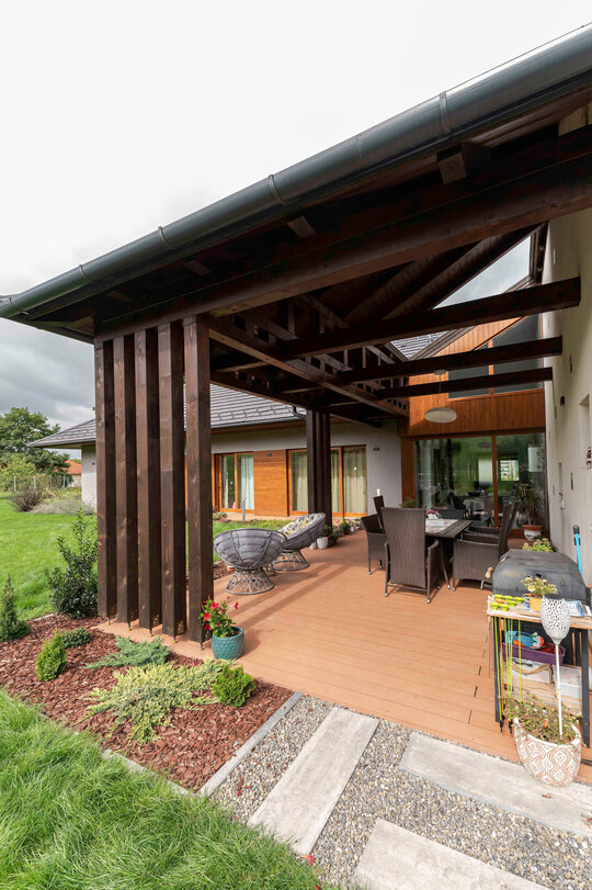Planimetria în L definește locul principal în curte, terasa acoperită, care are o legătură vizuală și către cer și către locul de luat masa. Dormitoarele de asemenea au legătură directă cu curtea, accesele fiind protejate de o streașină largă. Aceasta este inspirată din arhitectura vernaculară a zonei. Reinterpretând prispa tradițională am creat o zonă de tranziție care pe lângă protejarea casei de efecte meteorologice creează o trecere fluidă între spațiile interioare și exterioare.