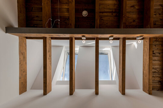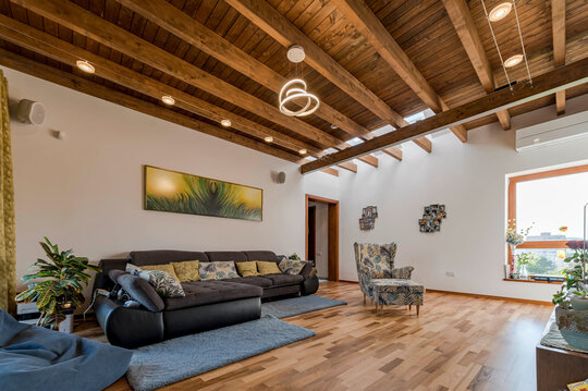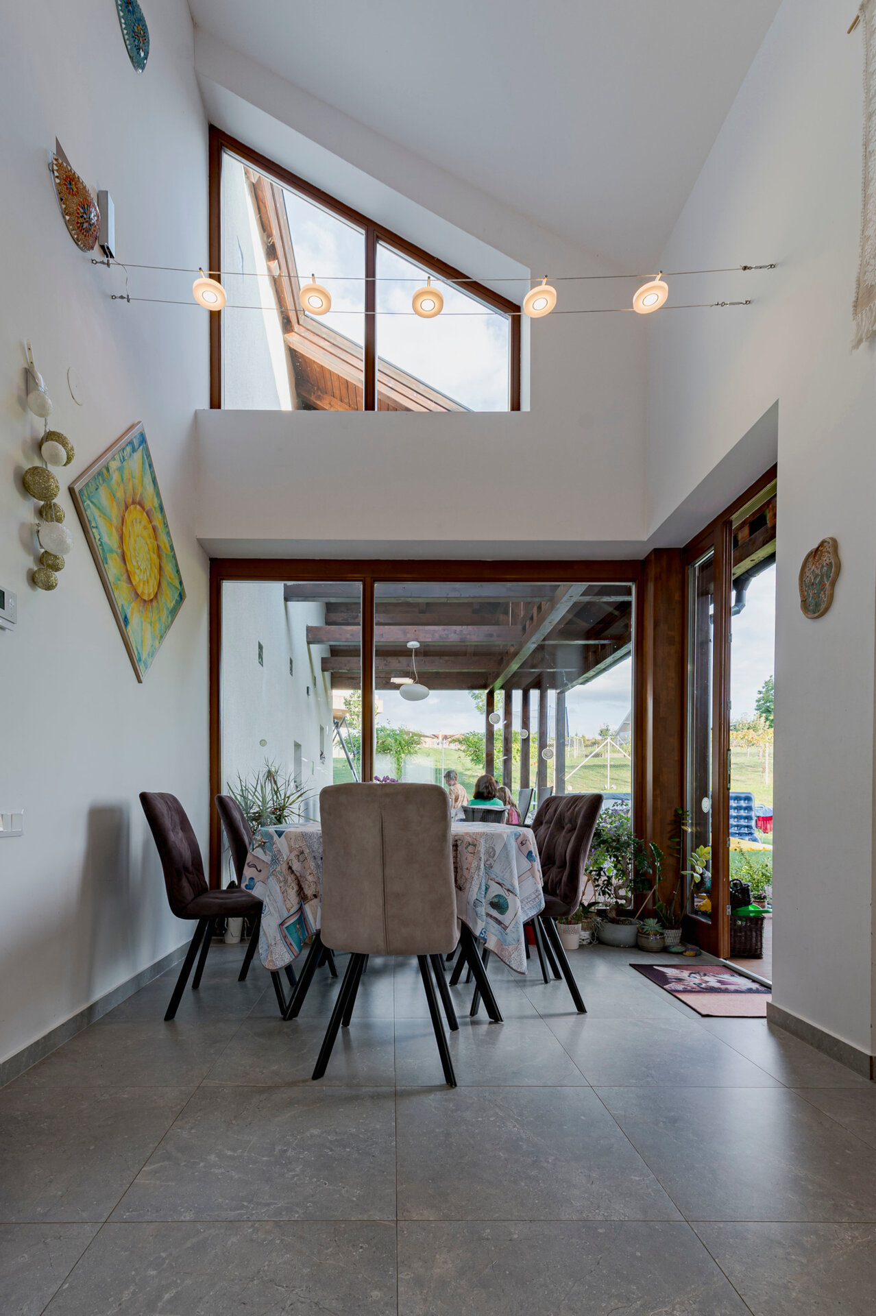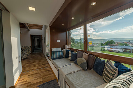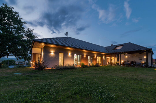 Lumina naturală este prezentă în casă prin suprafețele vitrate verticale sau în panta acoperișului, iar vitrajele pe lângă vederile către împrejurimi contribuie semnificativ la atmosfera generală a casei.