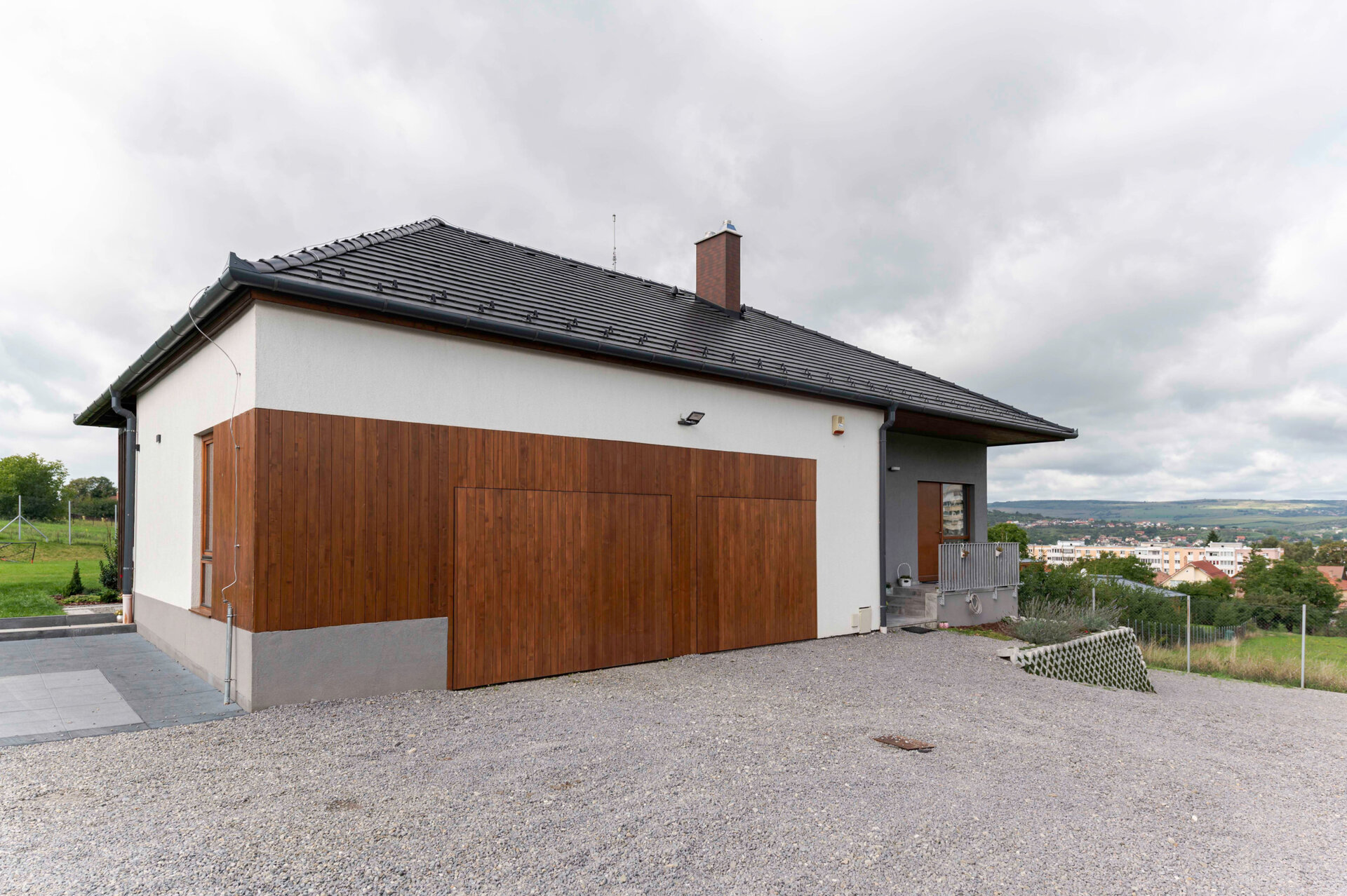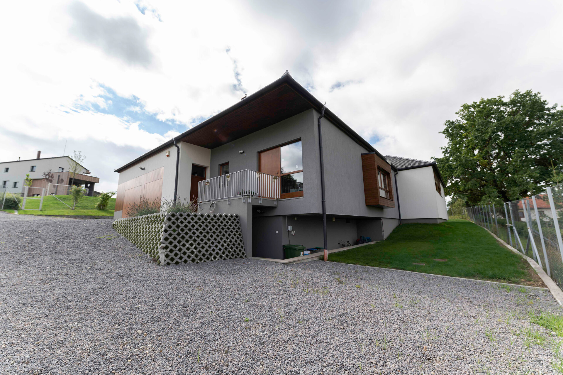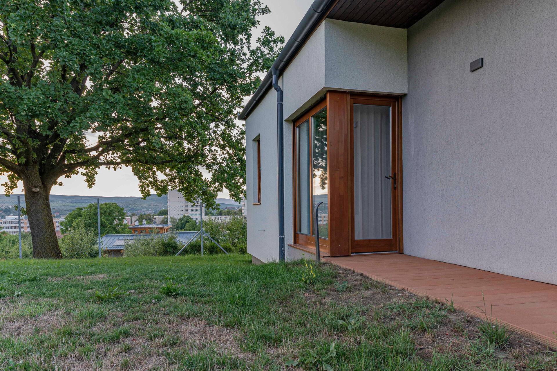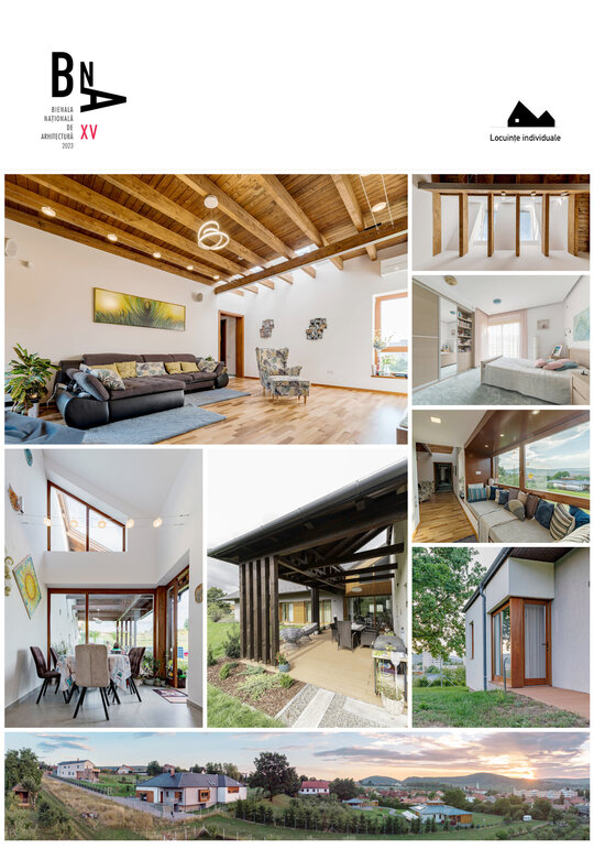 Pentru încadrarea subtilă a locuinței în peisajul natural și cel construit sunt folosite materiale și texturi naturale, cum ar fi lemn și tencuială cu nuanțe monocrome.