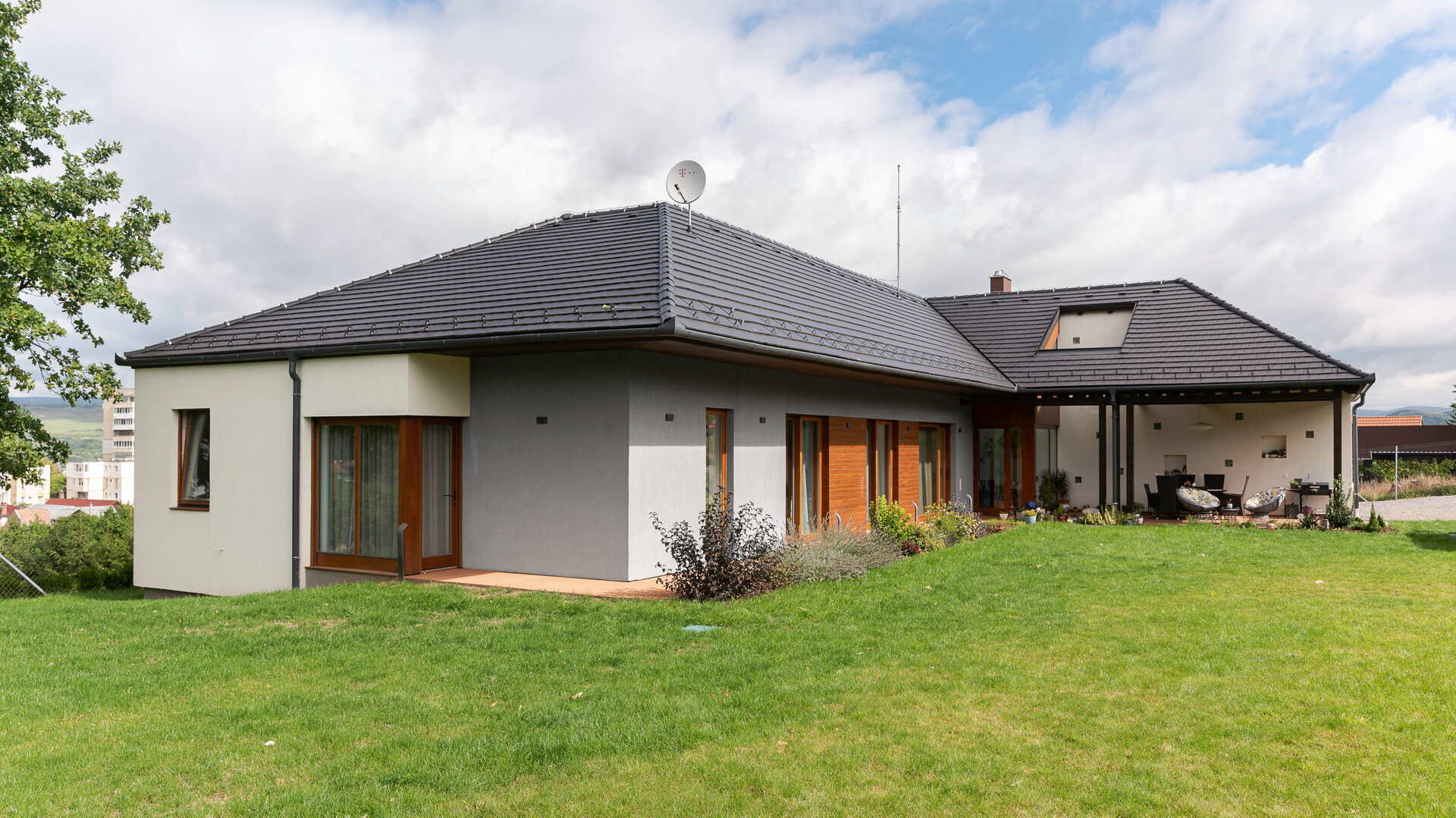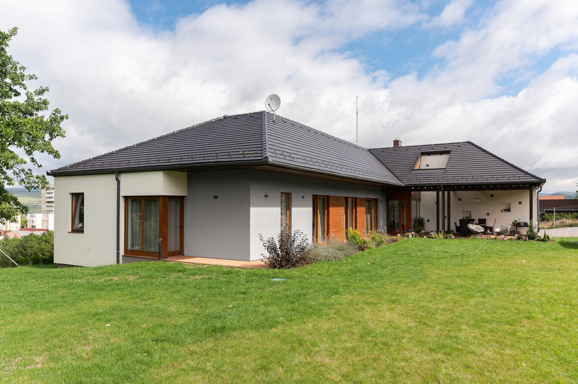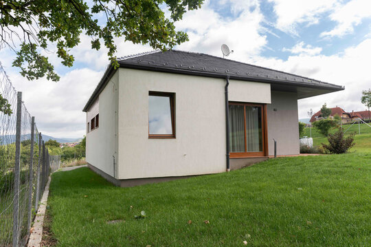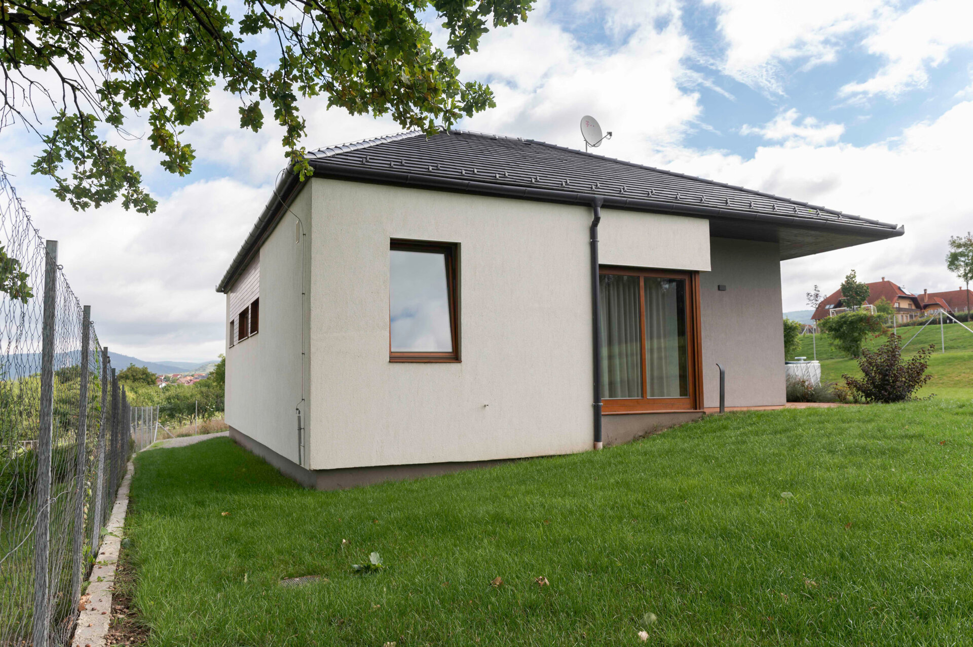 Pentru încadrarea subtilă a locuinței în peisajul natural și cel construit sunt folosite materiale și texturi naturale, cum ar fi lemn și tencuială cu nuanțe monocrome.