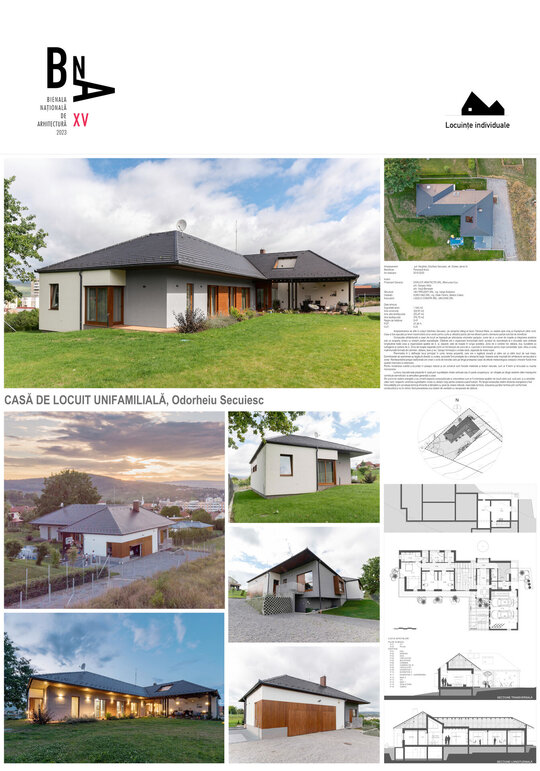 Compoziția arhitecturală a casei de locuit se bazează pe articularea volumelor garajului, zonei de zi, a zonei de noapte și integrarea acestora sub un acoperiș simplu cu streșini parțial supralărgite. Clădirea are o organizare funcțională clară: accesul se racordează la o circulație care străbate longitudinal toată casa și organizează spațiile de zi, și, separat, cele de noapte în lungul acesteia. Zona de zi conține hol, debara, duș, bucătărie cu sufragerie și camera de zi. Zona de noapte separată printr-un hol-tampon de zona de zi, cuprinde 2 dormitoare pentru copii comandate, baie, oficiu și suita matrimonială formată din dormitor, debara, baie și wc. Garajul formează o unitate clară, separată de restul casei.