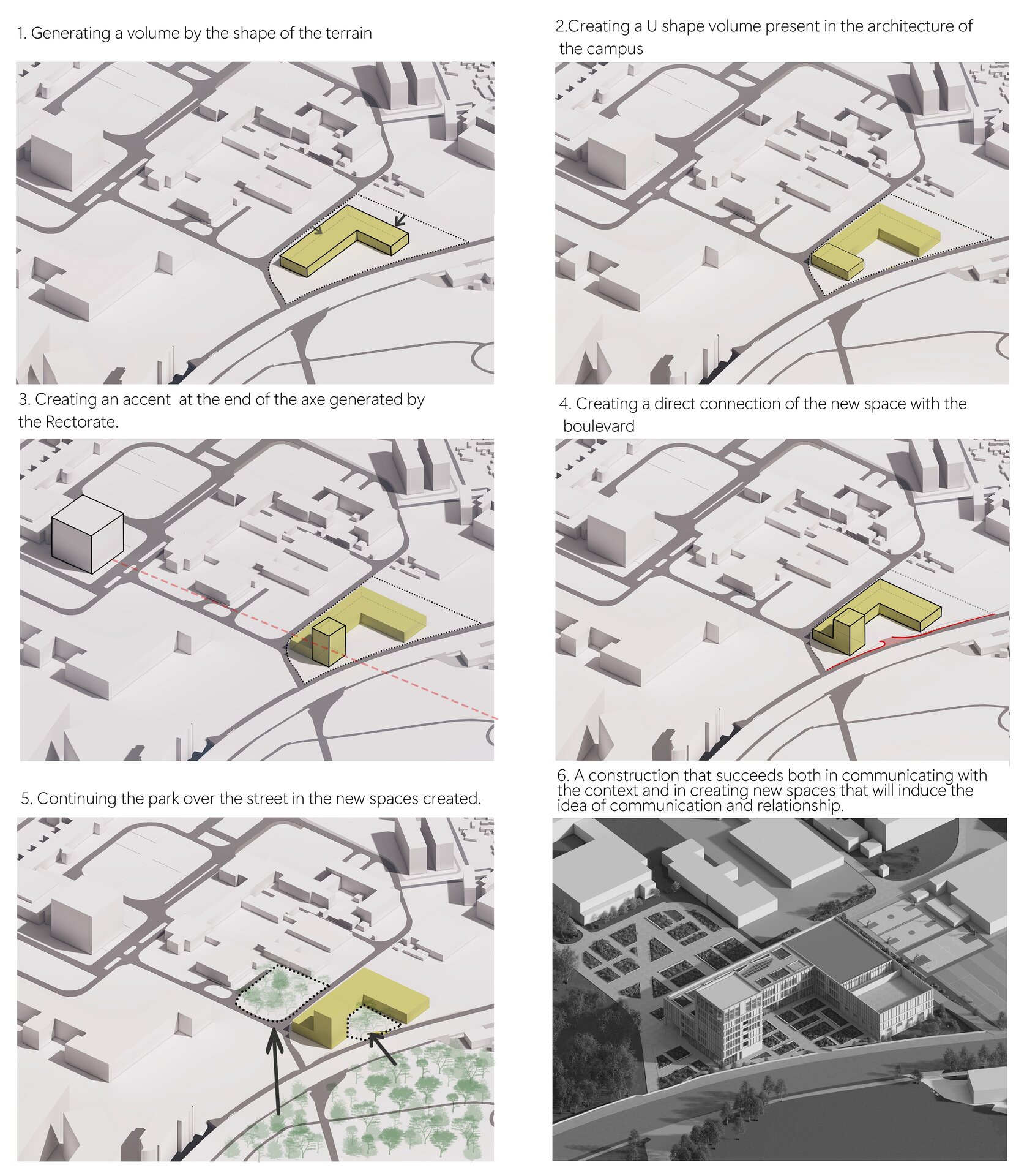 În următorii câțiva ani, universitatea intenționează să extindă întregul campus, aducând în primul rând toate facultățile din locația inițială a Universității Politehnice ( de pe strada Gh. Polizu ) în campusul actual pentru completarea ansamblului, în urma nevoilor fiecărei facultăți, începând cu cea de transport. În prezent, nu își poate conduce clasele la capacitate maximă din cauza lipsei de spațiu și a sălilor moderne pentru a găzdui noile tehnologii în domeniu. Scopul proiectului este de a crea un spațiu modern care să poată găzdui toți studenții Facultății de Transport, cu posibilitatea ca unele spații să poată fi utilizate de alte facultăți. Deși fiecare clădire are propriile sale caracteristici, ceea ce o face unică și recunoscută în campus, lucrează împreună și împărtășesc anumite caracteristici care reușesc să contureze un întreg unitar, cu un caracter specific, atât la nivelul zonei, cât și la nivelul orașului. Proiectul își propune să creeze un element nou care va face parte din această compoziție creată de Octav Doicescu în anii 60's, dar prezentând elementele sale caracteristice și definitorii. Clădirea propusă este situată în apropierea uneia dintre intrările în campus, dar nu a fost tratată ca una importantă, deci relația dintre spațiul bulevardului și zona campusului este aproape inexistentă, este necesară o schimbare. Relația clădirii cu parcul de vis este importantă, deoarece conexiunea există deja la altitudinea campusului printr-un pasaj subteran.Scopul proiectului este de a continua parcul în spațiul universitar pentru a crea un front stradal mai omogen. Prin forma aleasă, o grădină urbană este creată cu o legătură directă cu bulevardul. Acest aranjament este continuat în campus, plasând noua clădire într-un context foarte natural, specific clădirilor din campus, acestea fiind aproape ca pavilioane într-un parc.Permeabilitatea parterului ajută această relație a orașului cu campusul și face ca întregul spațiu să fie mult mai primitor, atât pentru studenți, cât și pentru profesori și vizitatori.Luminatorul are atât rolul de a dinamiza spațiul, cât și de a crea o atmosferă caldă, lumească, favorabilă studiului. Clădirea gestionează atât integrarea în contextul campusului, cât și în fața străzii, devenind în același timp un nou simbol al zonei.