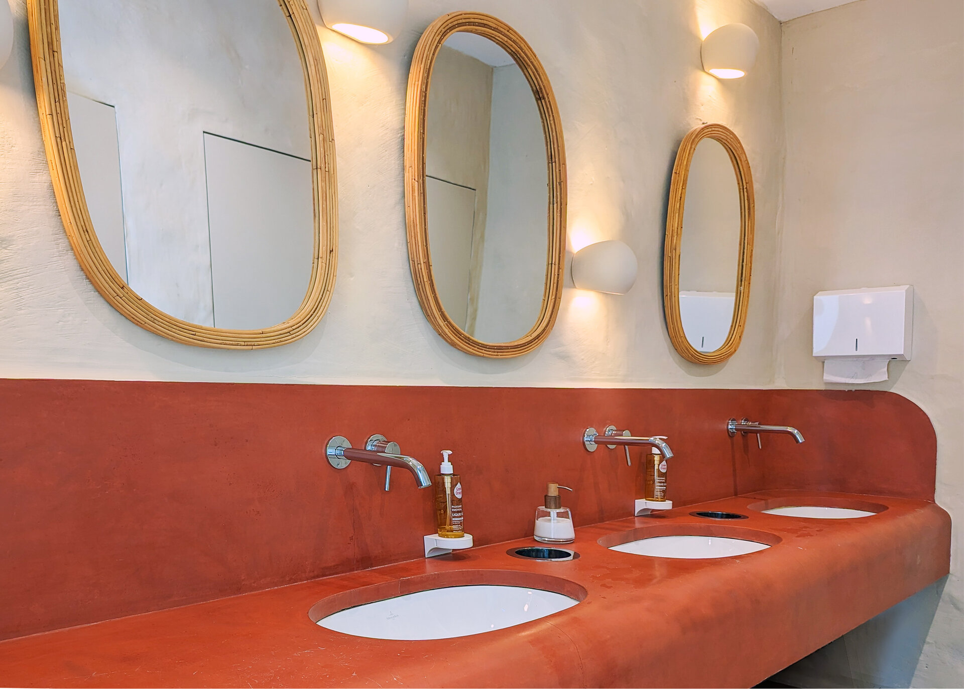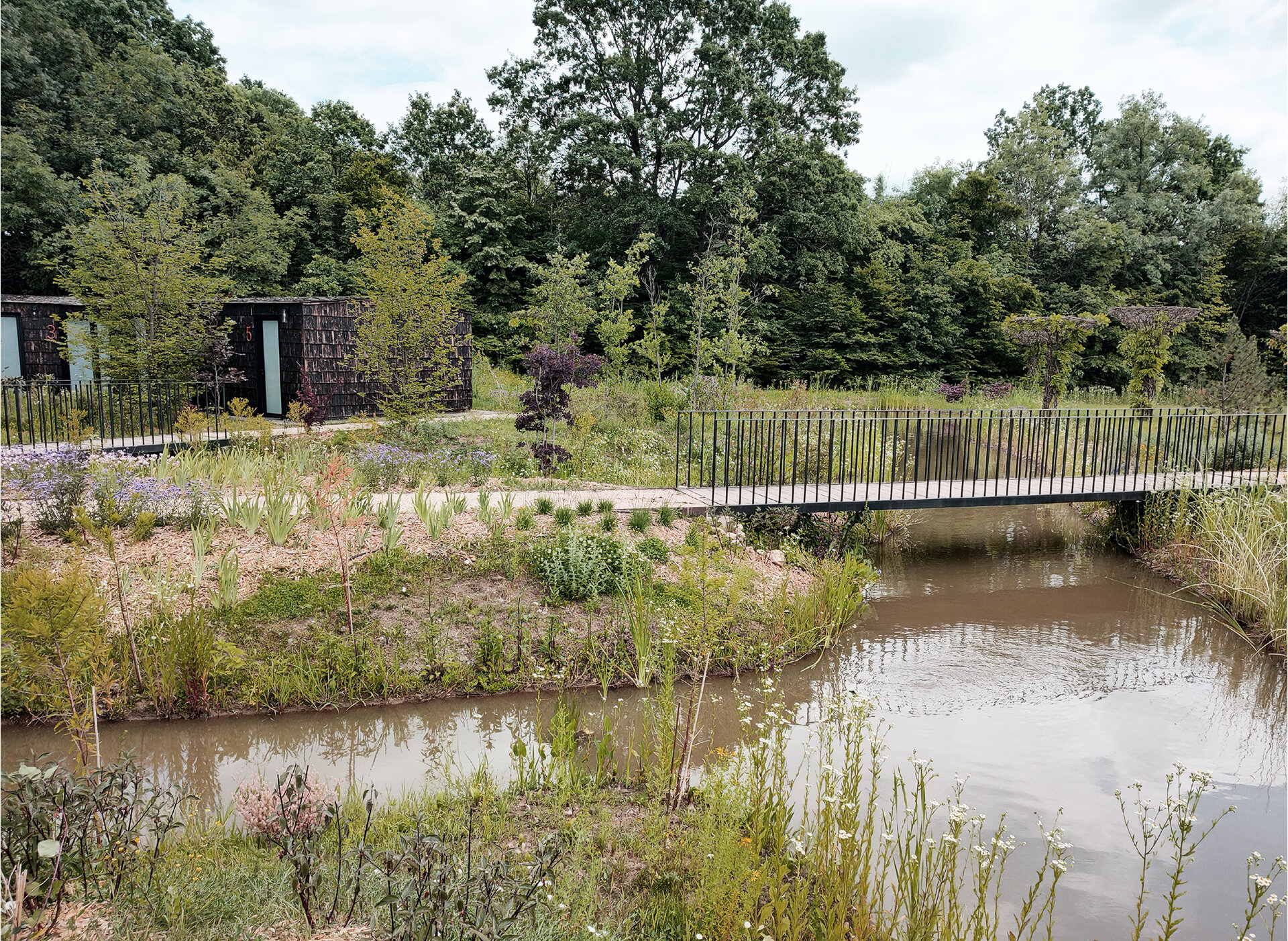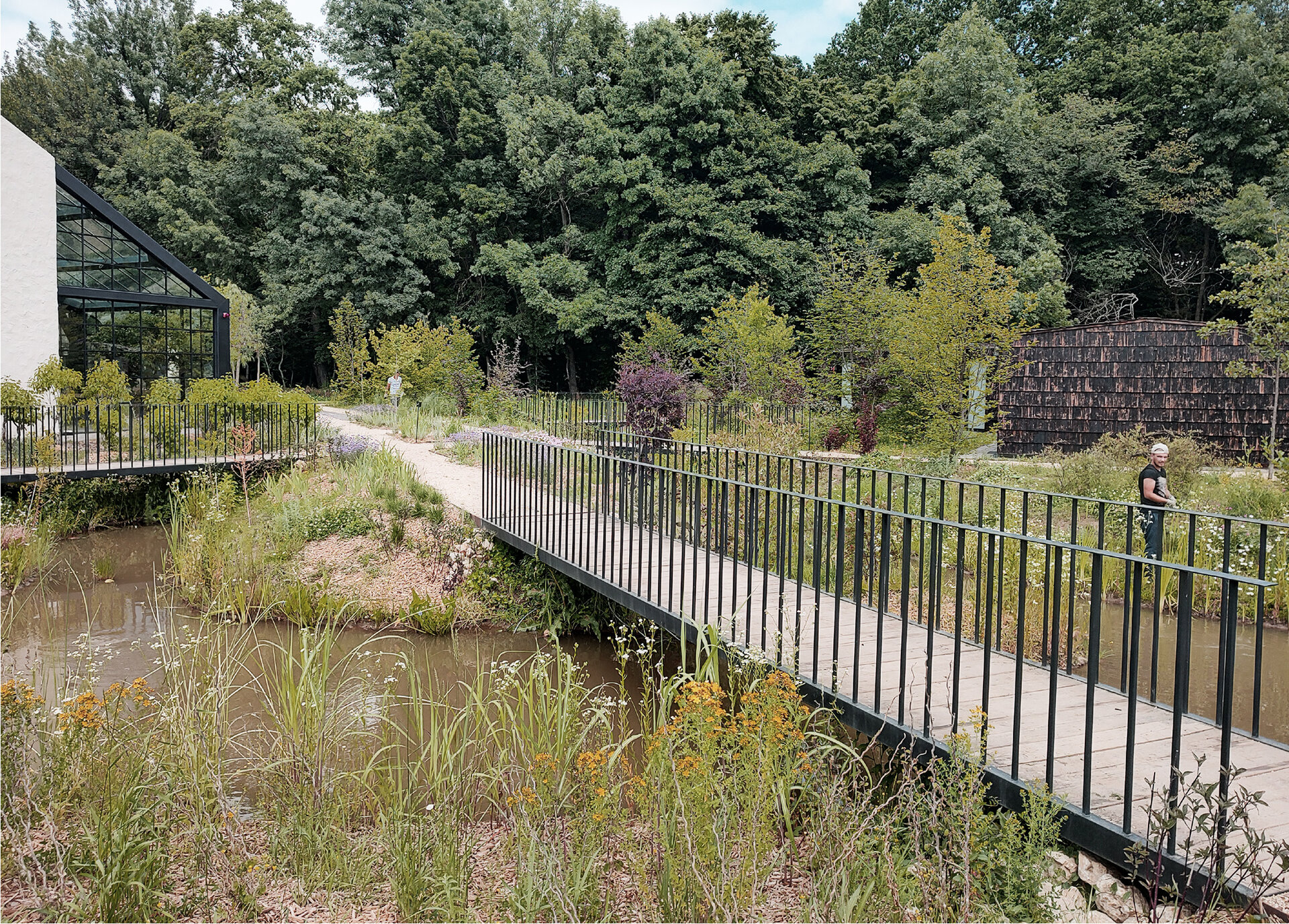 Pavilioanele sunt legate între ele de alei care se pierd în pădure și care se lățesc în anumite zone, creând suprafețe mai mari, prelungiri ale spaților interioare. Un fir de apă cu drenaj natural înconjoară de asemenea clădirile, oferind ochiuri de apă și traversări pe poduri metalice. Texturile diferite ale aleilor sunt date de dozajele diferite ale acelorași materiale: pământ, pietriș și nisip. Locurile de parcare sunt și ele ascunse în meandrele drumului, printre diverse pâlcuri de copaci plantați. În ansamblul său, proiectul peisajer combină plantațiile propuse cu natura spontană, o îmbinare care a dat roade la foarte scurt timp de la plantare.