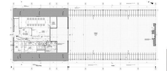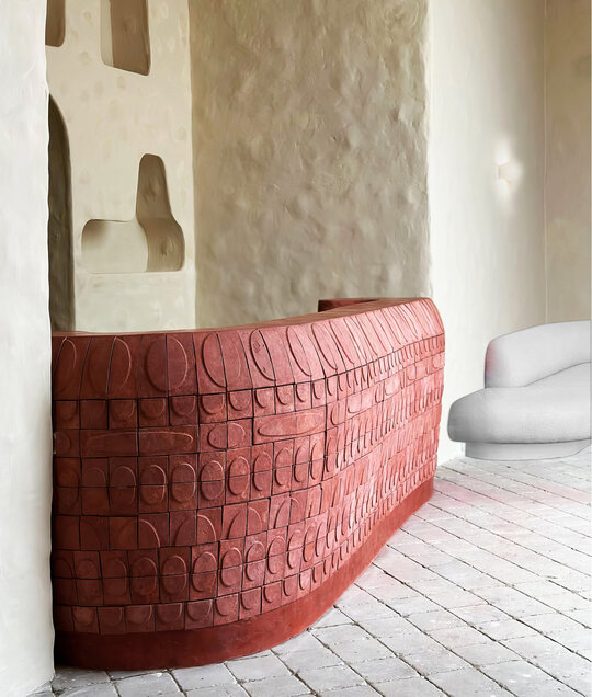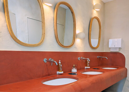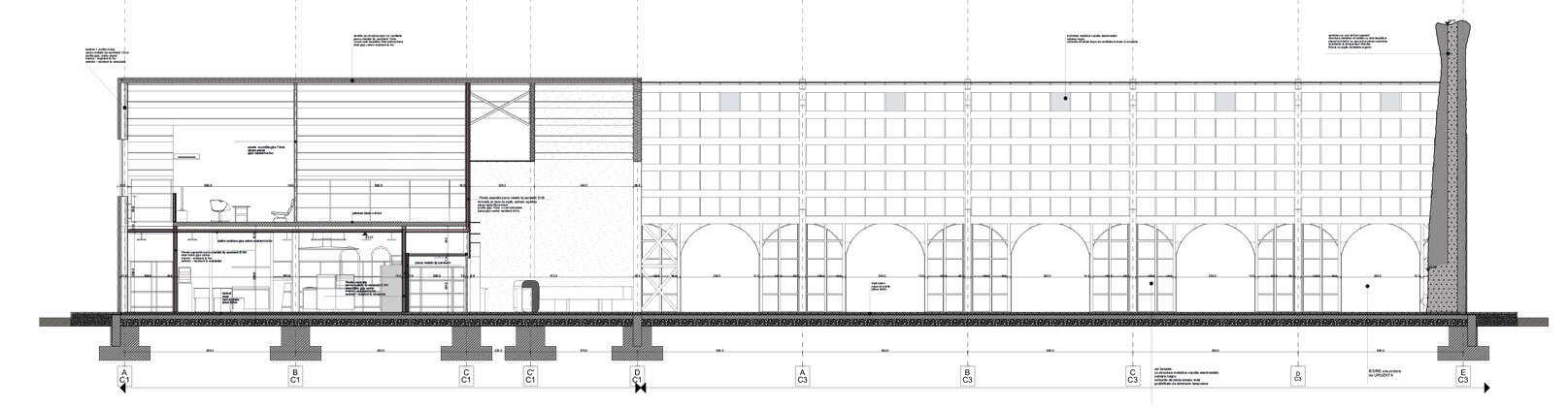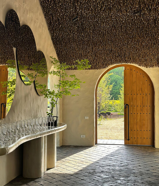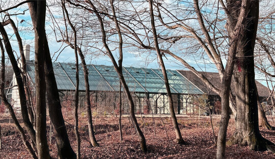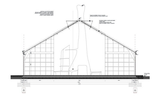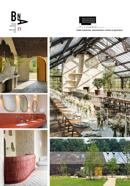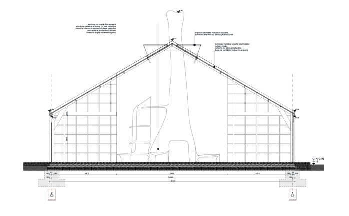 Orangeria, corpul principal, este alcătuită dintr-o zonă largă și deschisă, complet transparentă, cu structura metalică vizibilă (cu o deschidere de 17m fără stâlpi interiori)- partea multifuncțională- și o zonă plină- pentru utilități. La exterior, zonele pline au fost fie finisate cu tencuială de argilă brută, fie acoperite cu șiță arsă la fața locului. La interior, în zona serei, singura zonă de plin este cea a accentului vertical, șemineul tencuit. La capătul opus se află un accent de culoare și textură, sub forma unui bar de teracotă.