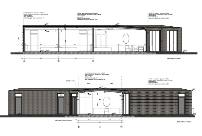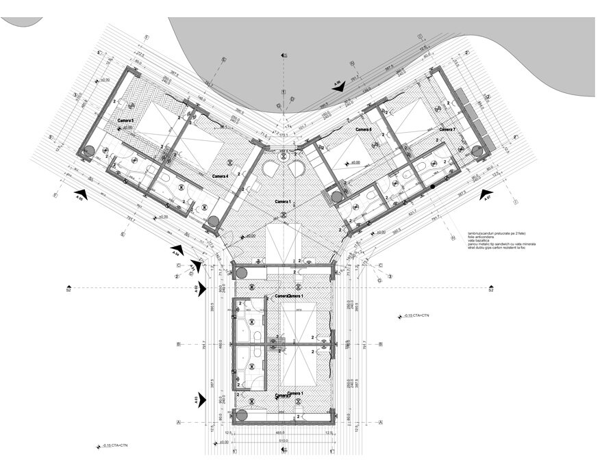 Corpul de cazare, minimal, este unul trilobat- cu trei paralelipipede echidistante finisate complet cu șiță, pierzându-se astfel în cromatica contextului.