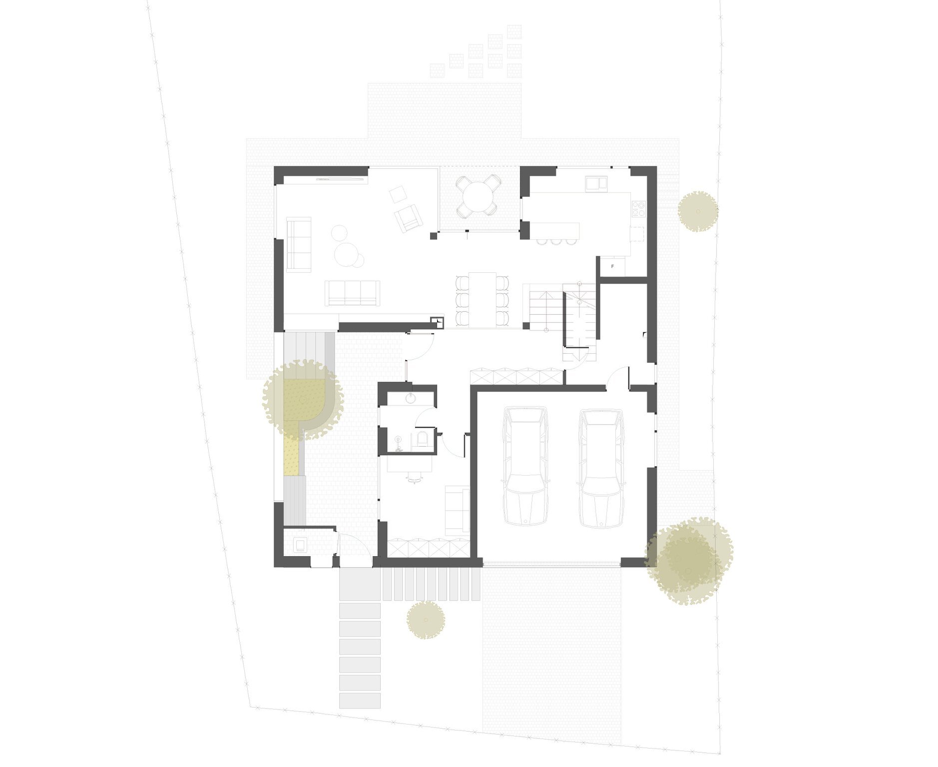 Volumele locuinței se așează în mod organic pe topografia terenului. Diferența de nivel a generat dispunerea spațiului interior pe patru semi-nivele, îmbunătățind comunicarea între toate spațiile clădirii prin intermediul scării, oferind un parcurs interior fluent și interesant, care invită să fie descoperit. La nivelul accesului din curtea din față se regăsesc un birou, o baie, garajul și spațiul ethnic. La nivelul grădinii din spate sunt amenajate bucătăria și un spațiu de zi generos, cu tavan înalt, care permite luminii să pătrundă dinspre 3 lături ale încăperii, precum și prin cele 2 luminatoare, generând un joc de lumini și umbre pe întreg parcursul zilei.