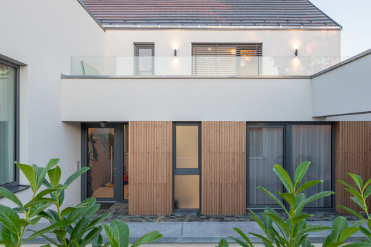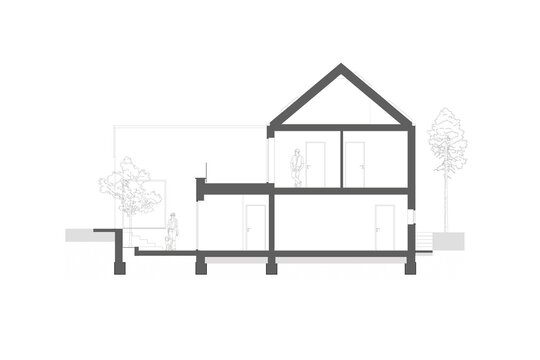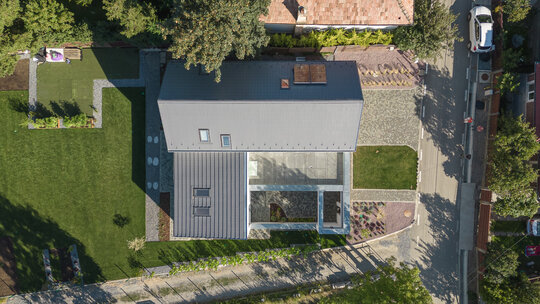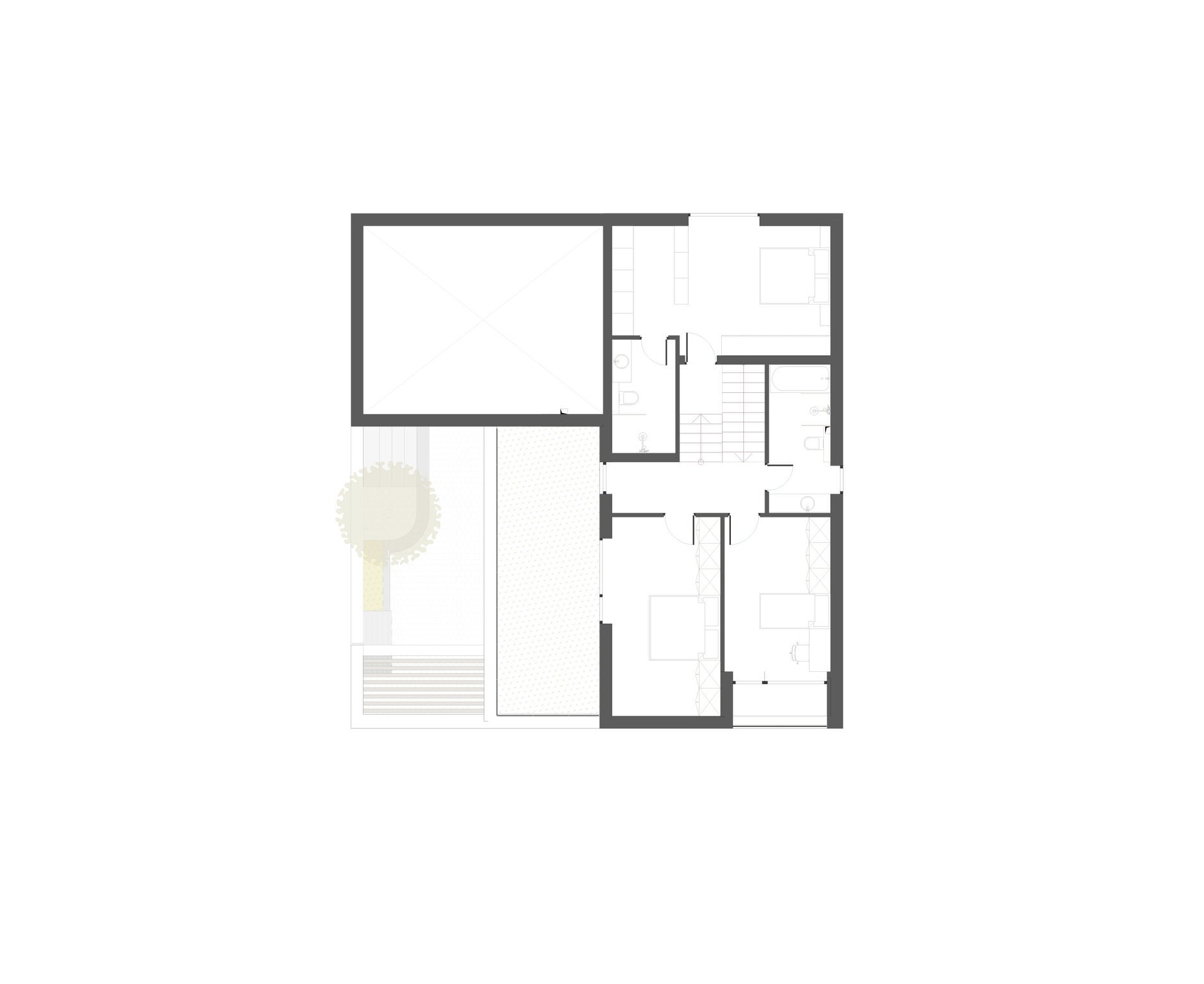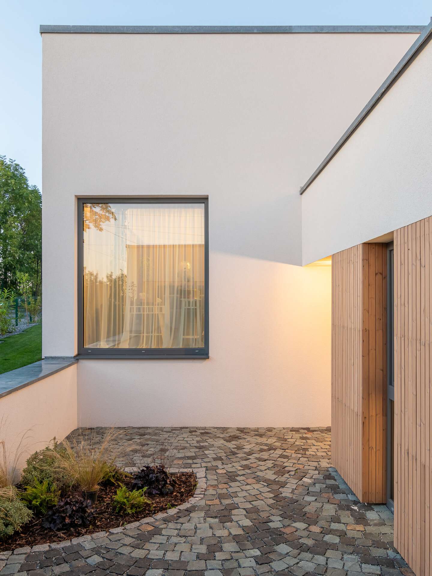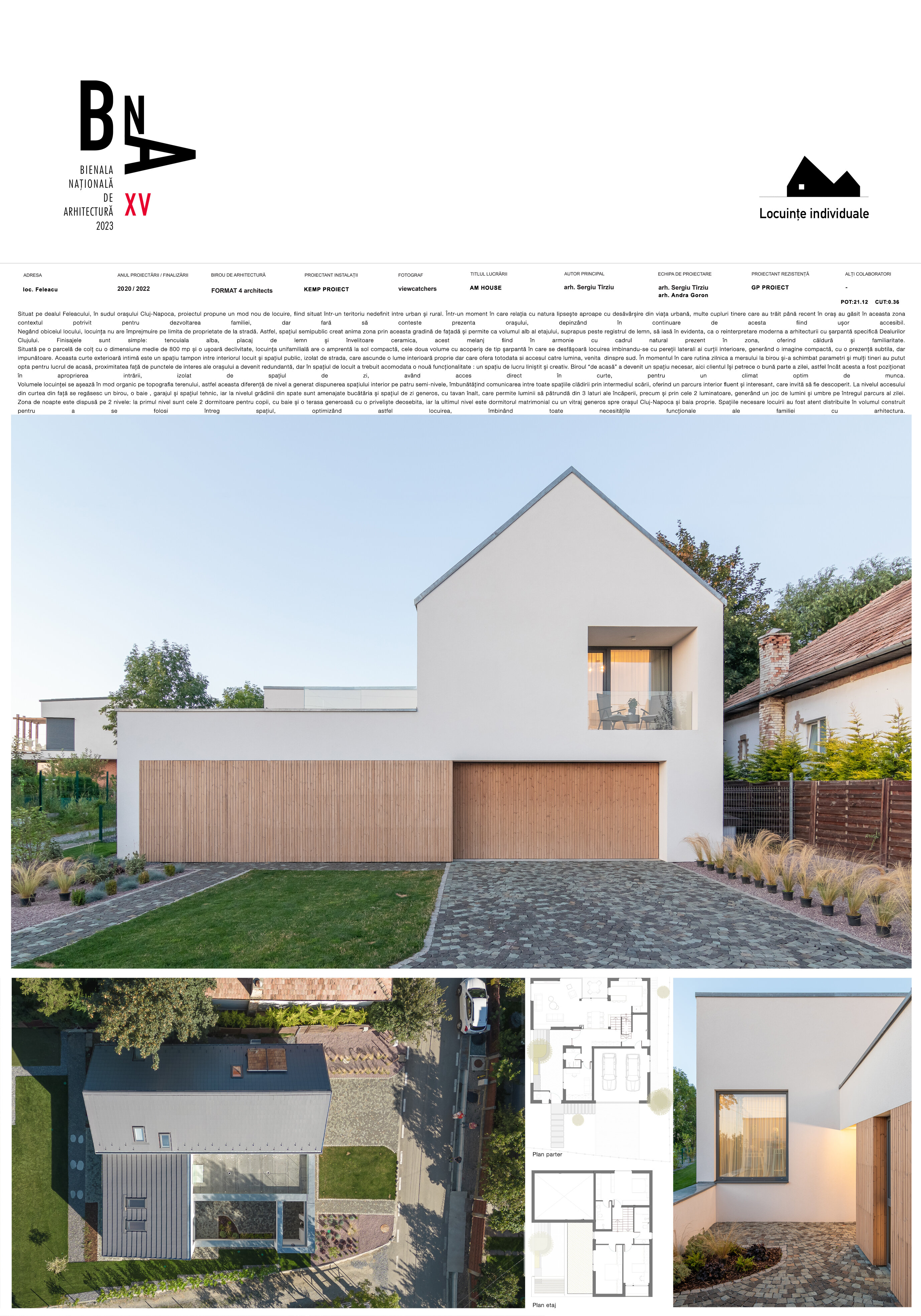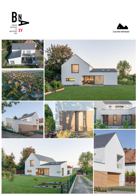Locuința unifamiliă este situată pe o parcelă de colț cu o dimensiune medie de 800 mp și o ușoară declivitate, având o amprentă la sol compactă. Cele două volume cu acoperiș de tip șarpantă, în care se desfășoară locuirea, se îmbină cu pereții laterali ai curții interioare, generând o imagine compactă, cu o prezență subtilă, dar impunătoare. Această curte exterioară, intimă, este un spațiu tampon între interiorul locuit și spațiul public, izolat de stradă, care ascunde o lume interioară proprie, dar care permite totodată și accesul luminii, venită dinspre sud. În momentul în care rutina zilnică a mersului la birou și-a schimbat parametrii și mulți tineri au putut opta pentru lucrul de acasă, proximitatea față de punctele de interes ale orașului a devenit redundantă, iar în zona de locuit a trebuit acomodată o nouă funcționalitate: un spațiu de lucru liniștit și creativ. Biroul “de acasă” a devenit un spațiu necesar unde clientul își petrece o bună parte a zilei. Astfel, acesta a fost poziționat în aproprierea intrării, izolat de spațiul de zi, având acces direct în curte pentru un climat optim de muncă.