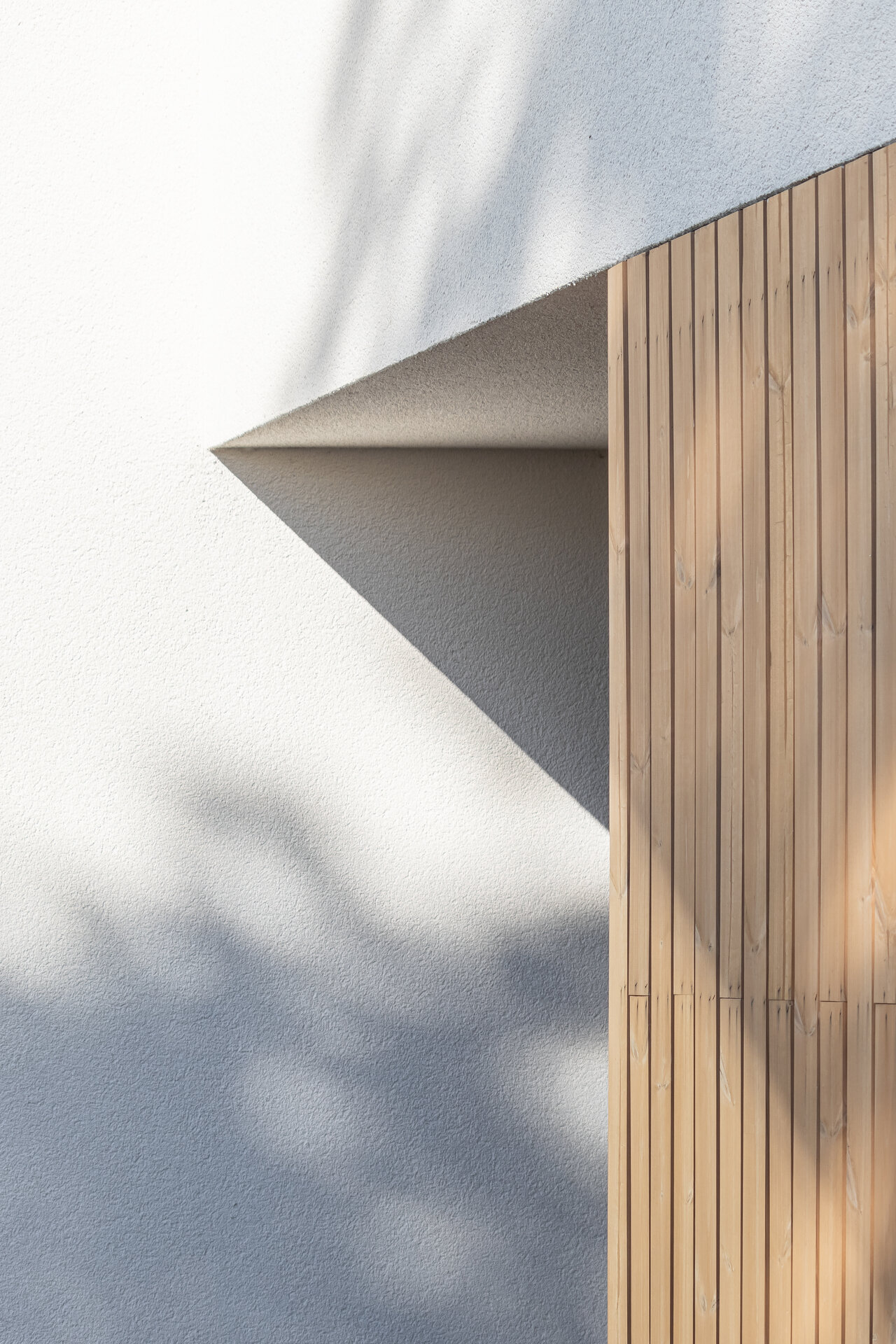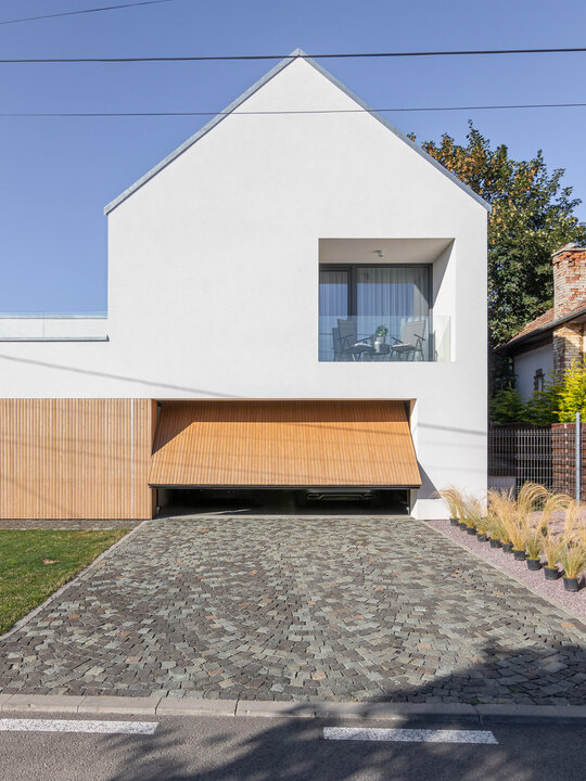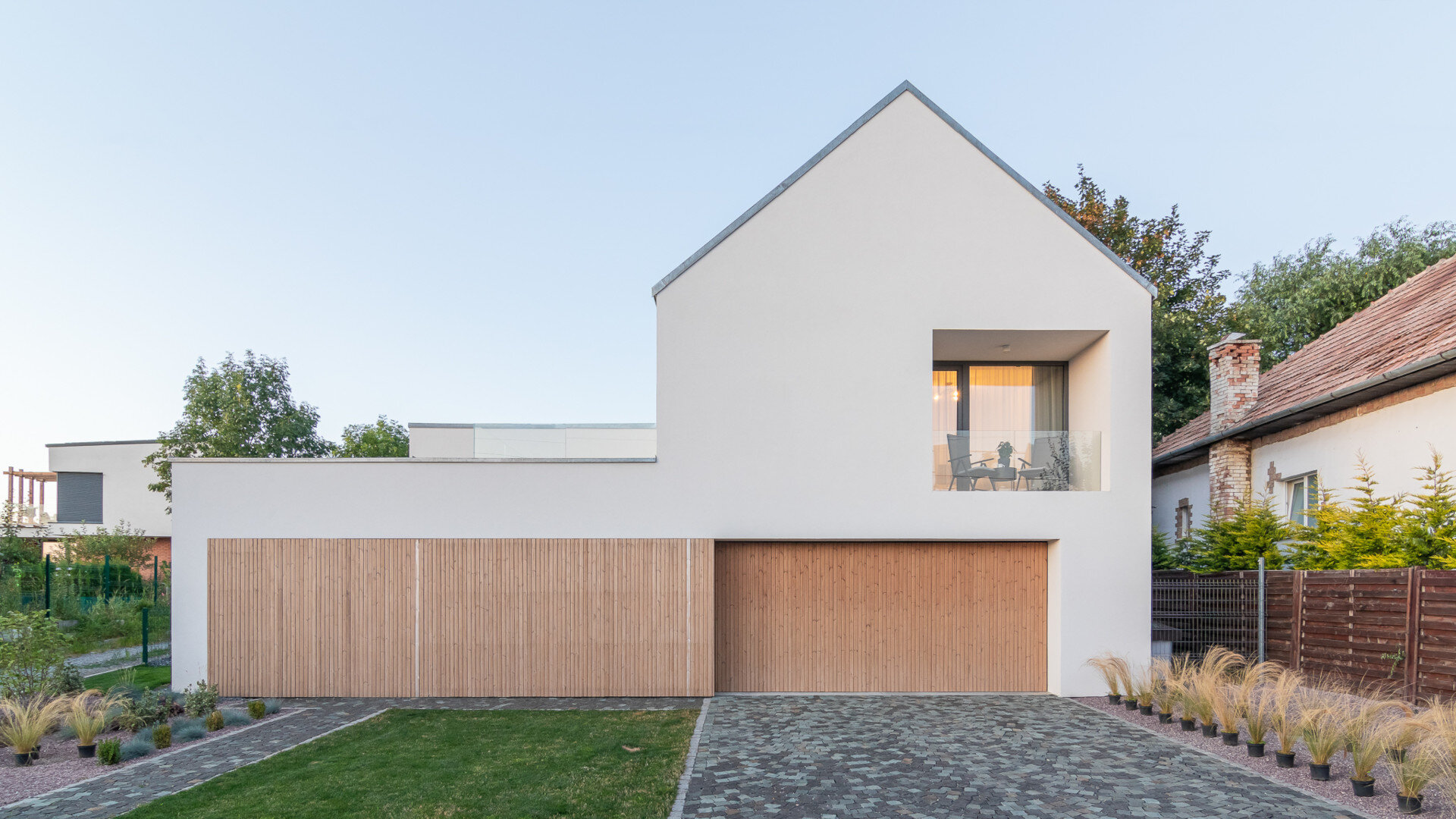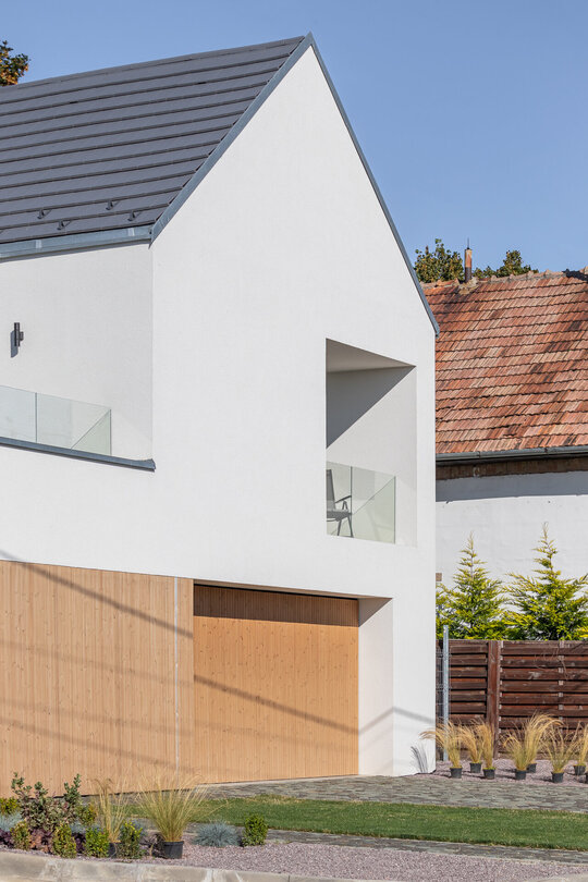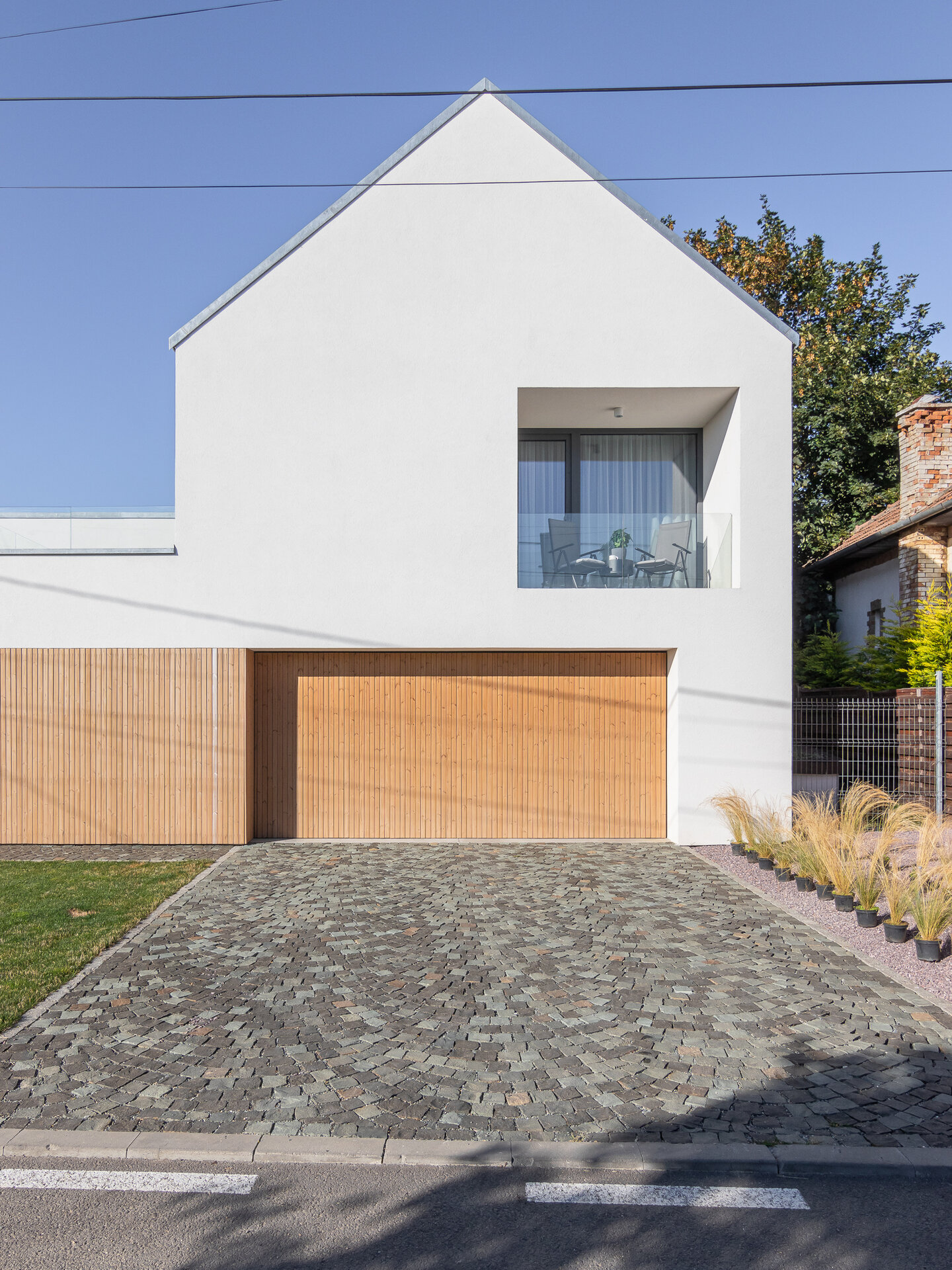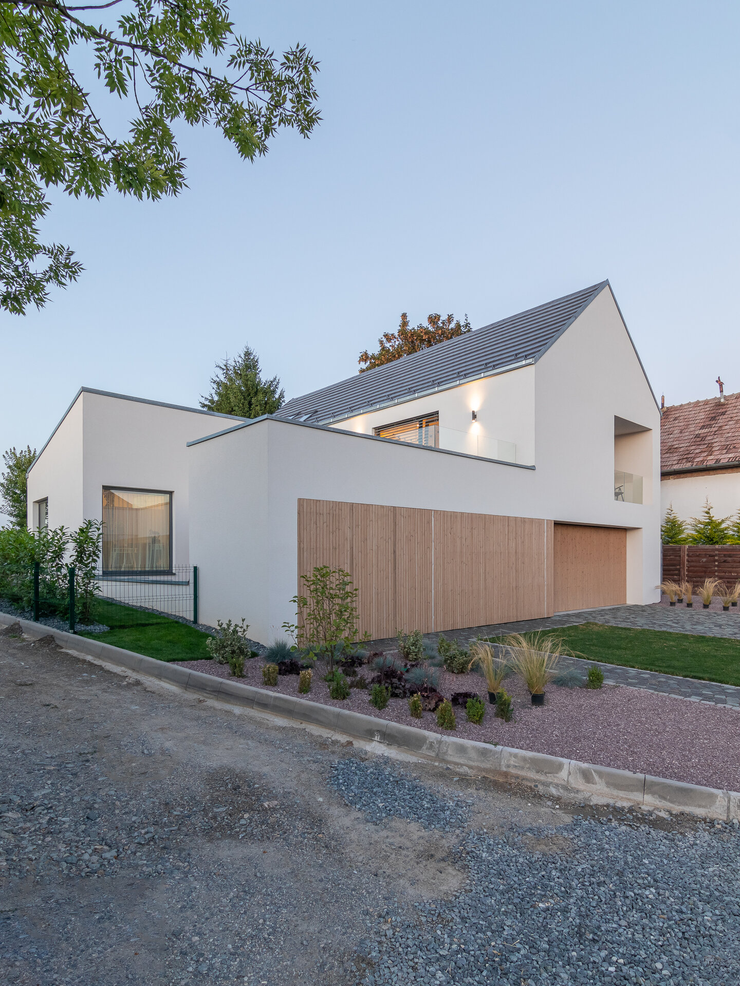 Negând obiceiul locului, locuința nu are împrejmuire pe limita de proprietate de la stradă. Astfel, spațiul semipublic creat animă zona printr-o grădină de fațadă. În același timp, evidențiază volumul alb al etajului, suprapus peste registrul de lemn ca o reinterpretare modernă a arhitecturii cu șarpantă, specifică Dealurilor Clujului. Finisajele sunt simple: tencuiala albă, placaj de lemn și învelitoare ceramică, acest melanj fiind în armonie cu cadrul natural prezent în zonă, oferind căldură și familiaritate.