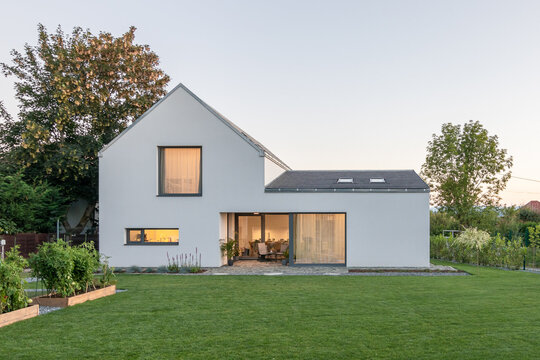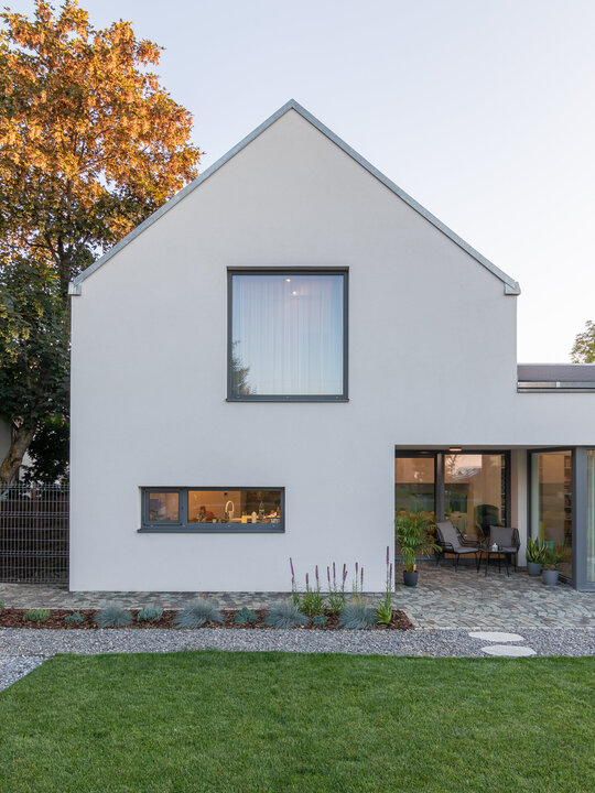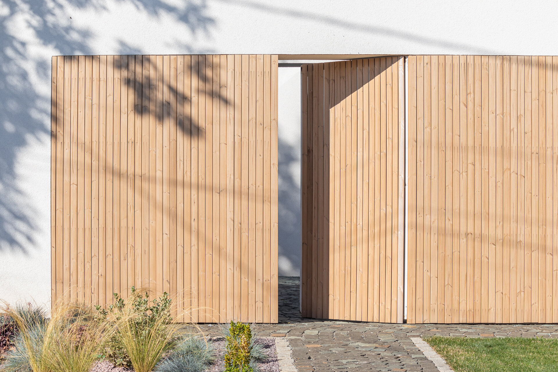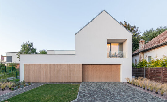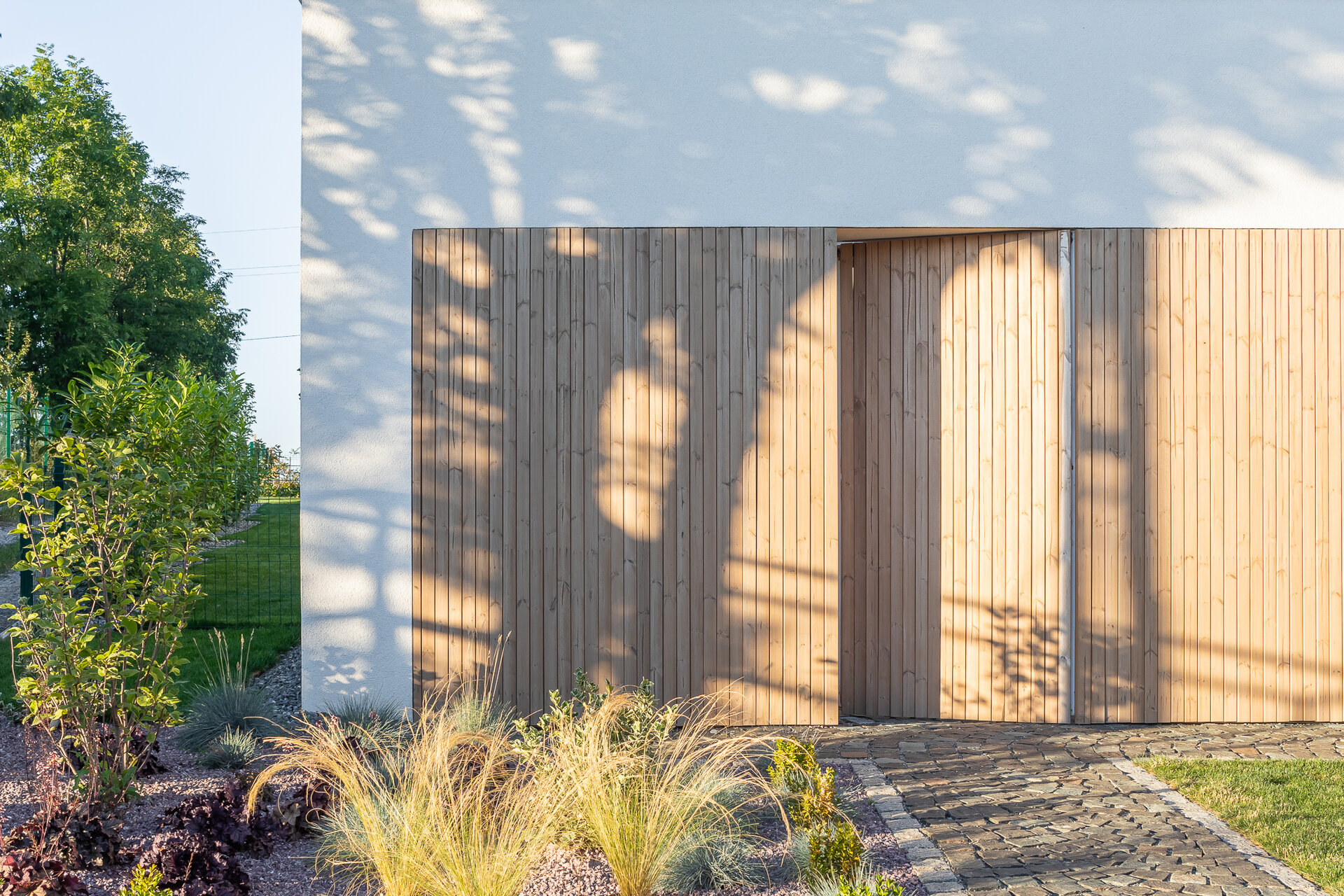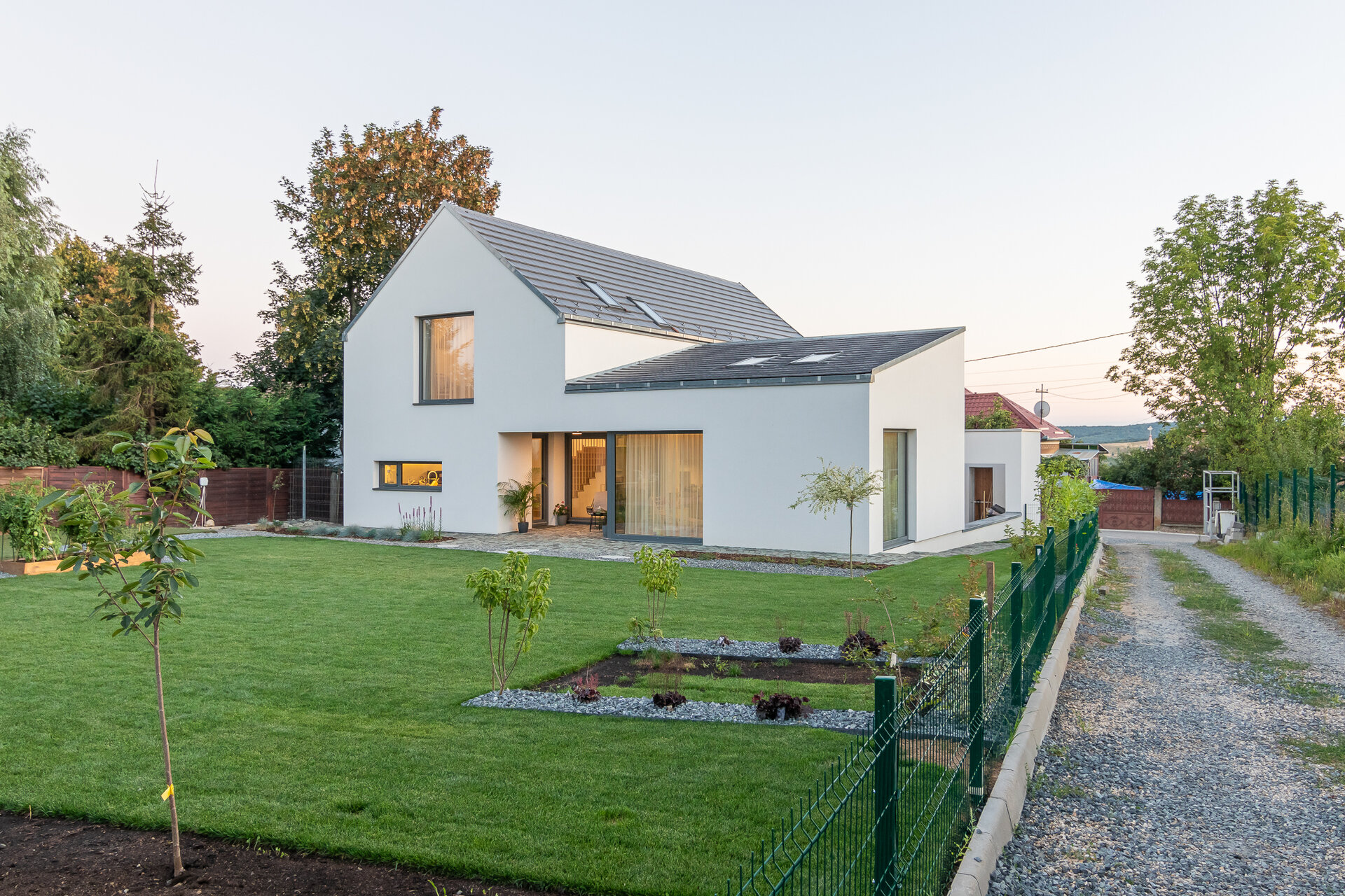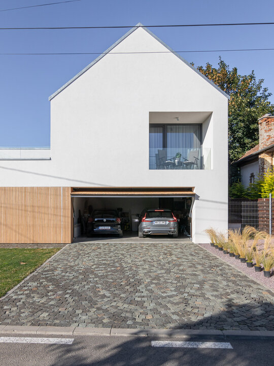Negând obiceiul locului, locuința nu are împrejmuire pe limita de proprietate de la stradă. Astfel, spațiul semipublic creat animă zona printr-o grădină de fațadă. În același timp, evidențiază volumul alb al etajului, suprapus peste registrul de lemn ca o reinterpretare modernă a arhitecturii cu șarpantă, specifică Dealurilor Clujului. Finisajele sunt simple: tencuiala albă, placaj de lemn și învelitoare ceramică, acest melanj fiind în armonie cu cadrul natural prezent în zonă, oferind căldură și familiaritate.