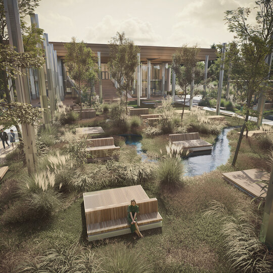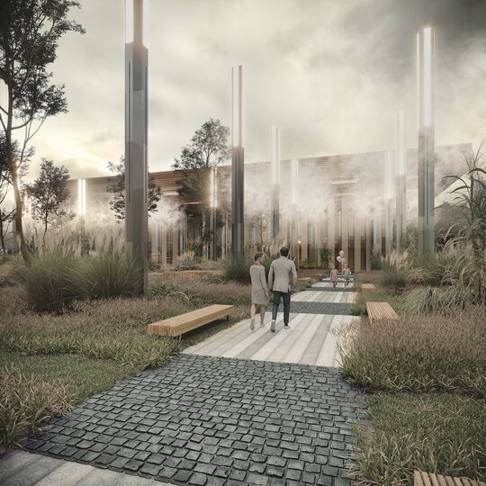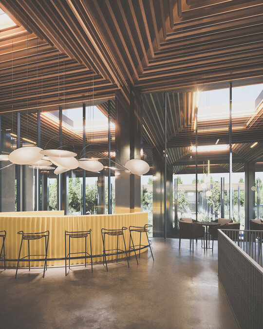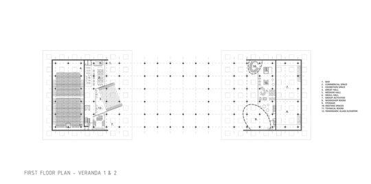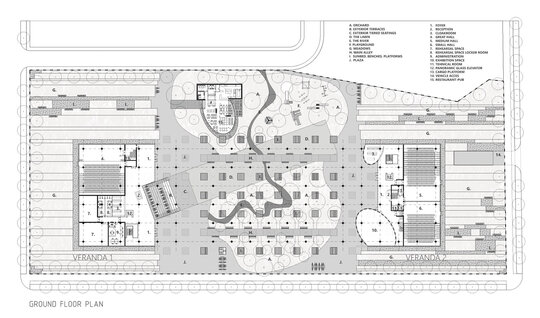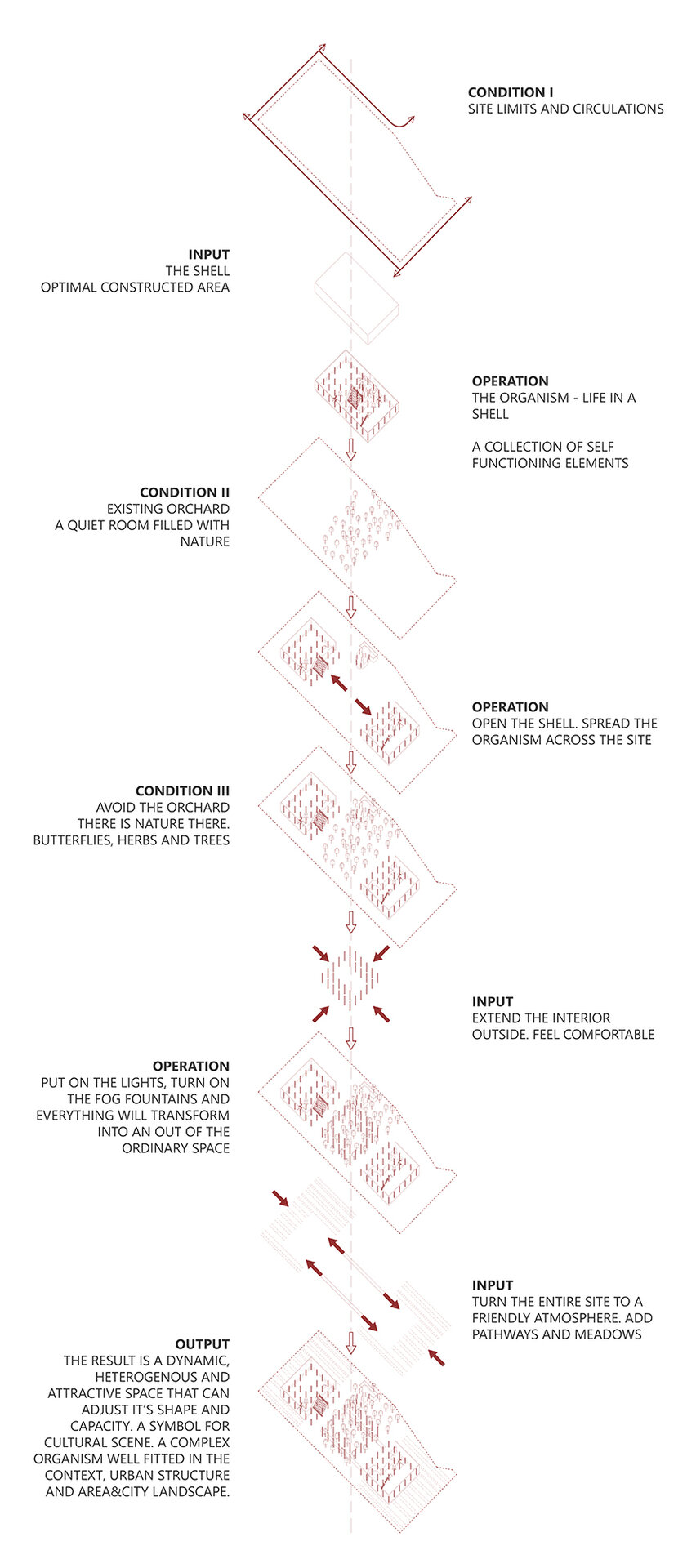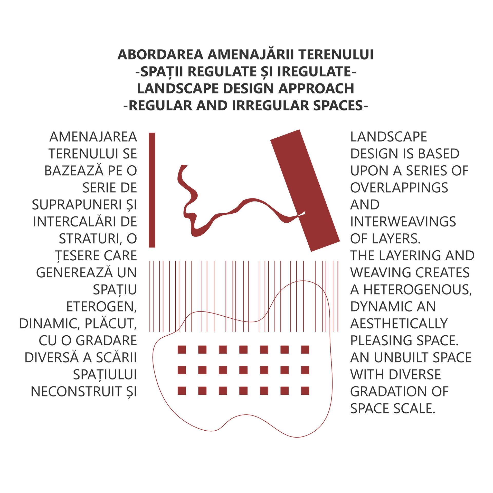 Astfel, cele două clădiri principale pot funcţiona independent sau împreună. Piaţetele din faţa clădirilor şi peluza centrală oferă posibilităţi alternative de utilizare a spaţiului. Restaurantul/pub este încorporat într-un foişor de gradină ca o unitate de sine stătătoare, dând ocazia oricărui operator de business să gestioneze independent activitatea. Desenul peisagistic se bazează pe o serie de suprapuneri şi împletiri de straturi. Stratificarea şi ţesutul creează un spaţiu eterogen, dinamic invitându-te la descoperire. E un spaţiu neconstruit cu diverse gradaţii de scară, fixat într-o matrice de colonade care oglindeşte și leagă vizual structura clădirilor.