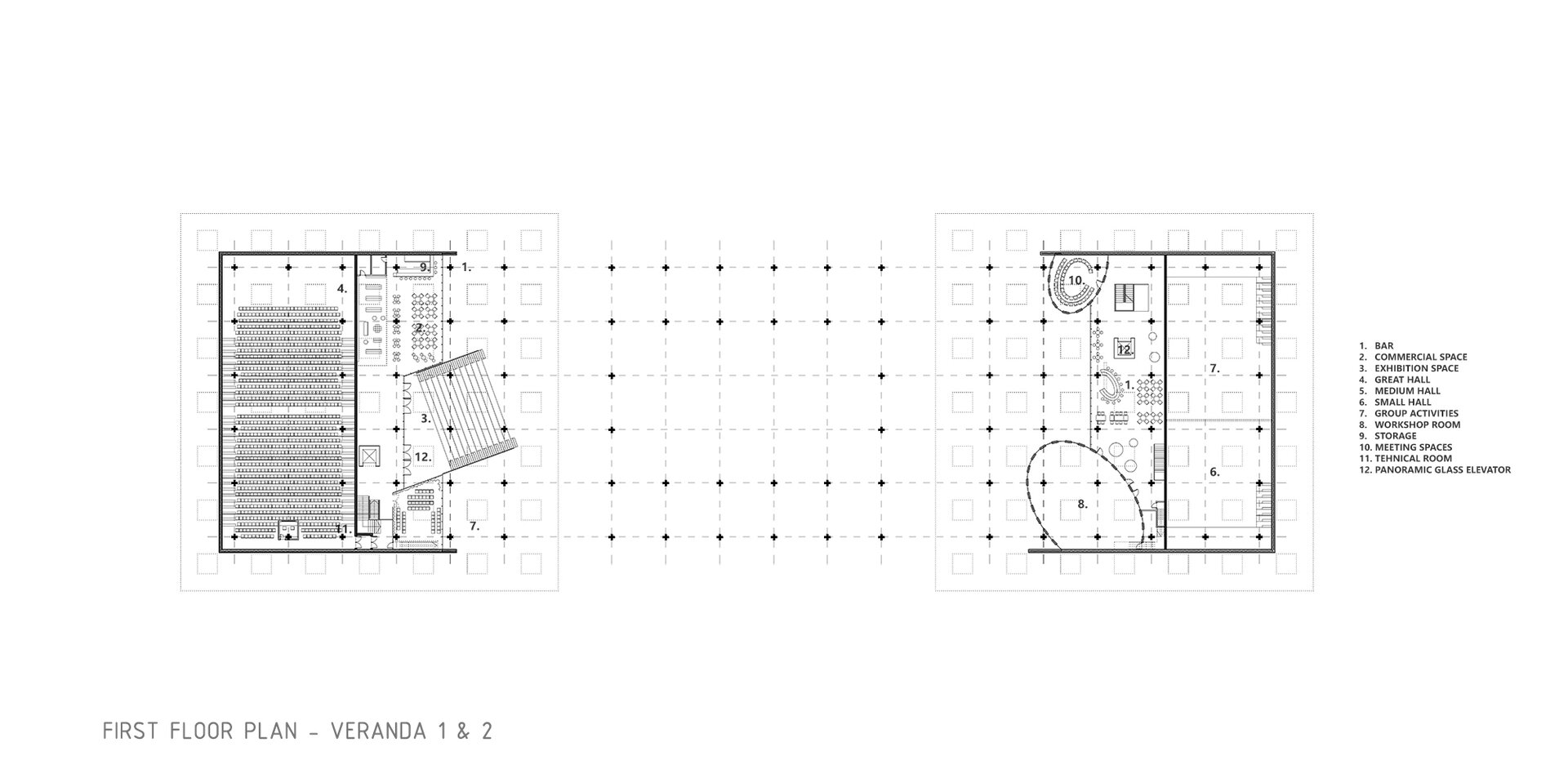 Structura spațial-funcțională a centrului este determinată de criteriul flexibilității, centrul dezvoltând un ansamblu cultural pluridisciplinar și plurifuncțional, capabil să își adapteze forma, capacitatea și disponibilitățile tehnico-funcționale, astfel încât să se poată desfășura și concerte, lansări de carte, expoziții, conferințe sau orice alte evenimente care ar contribui la îmbogățirea varietății și nu numai.