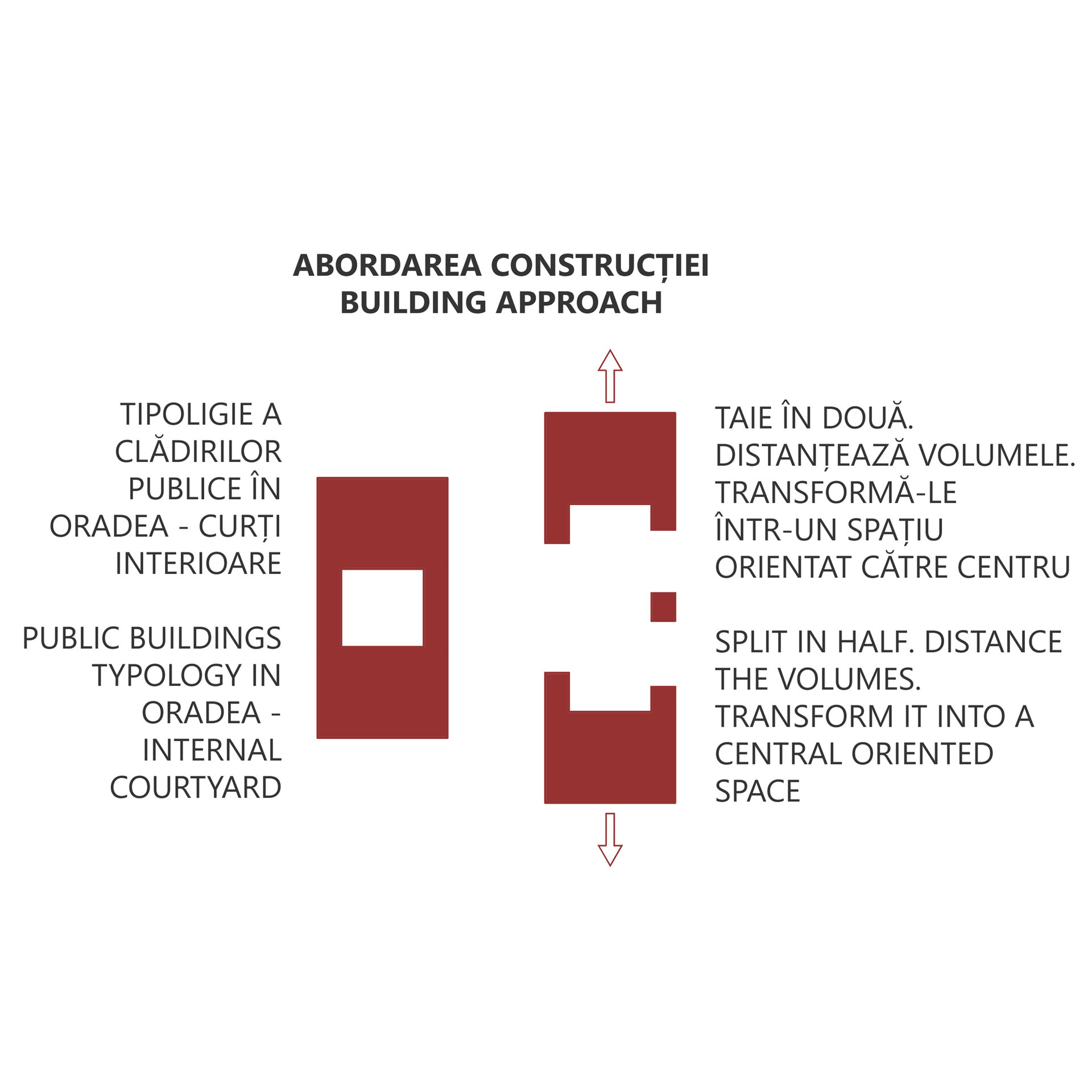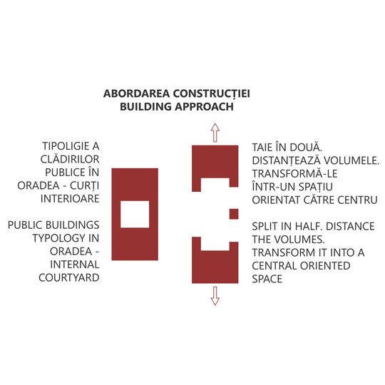 Noua propunere dacă ar trebui să se integreze locului nu poate decât sa fie și ea la o altă scară, parte a unei asemenea memorii iar tipologia amintită a curților să fie parte din noul context propus, dar nu una de curte închisă aşa cum este în oraş, ci una în care clădirea este împărţită în jumătate ce te invită să o petreci într-un spaţiu orientat central deschis.
