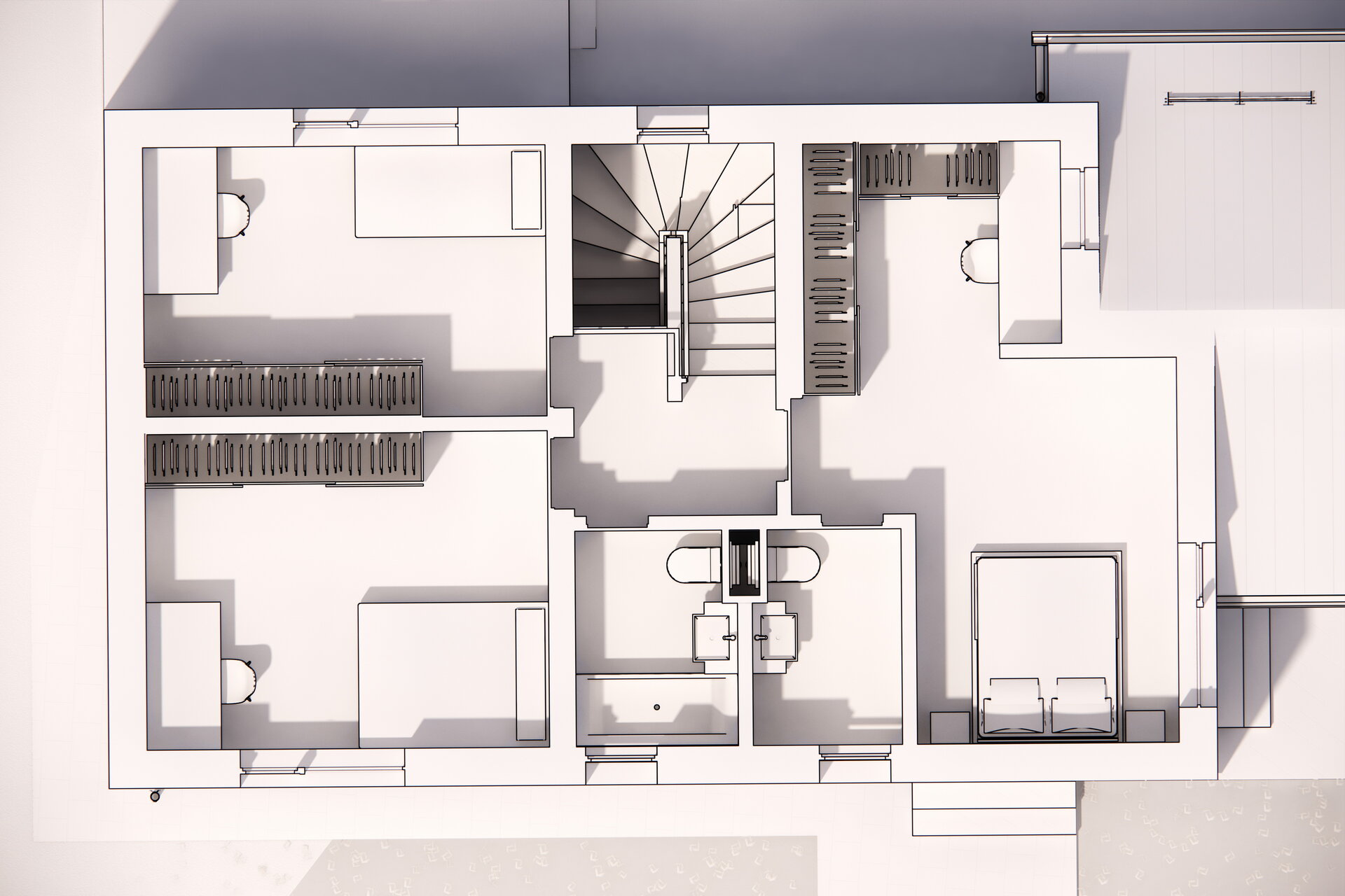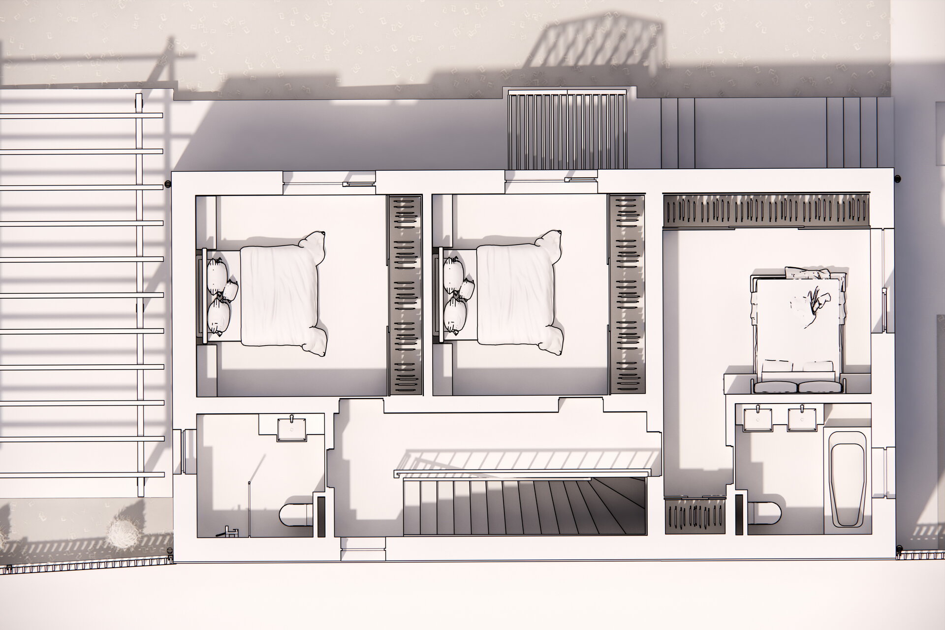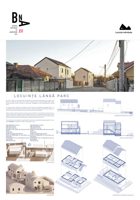 Astfel, misiunea noastră a fost să creăm un reper pentru comunitate prin intermediul a două locuințe individuale, ca două surori, adaptate cu grijă la topografia terenului, cu șarpantă în trepte și planșee jucate. Păstrarea amprentei locuinței existente a creat un pasaj vizual, de la locuința ”din deal” către coronamentul arborilor din parcul natural, aflat doar la câțiva zeci de metri mai la vale.