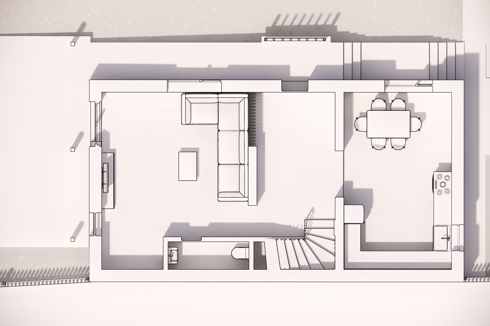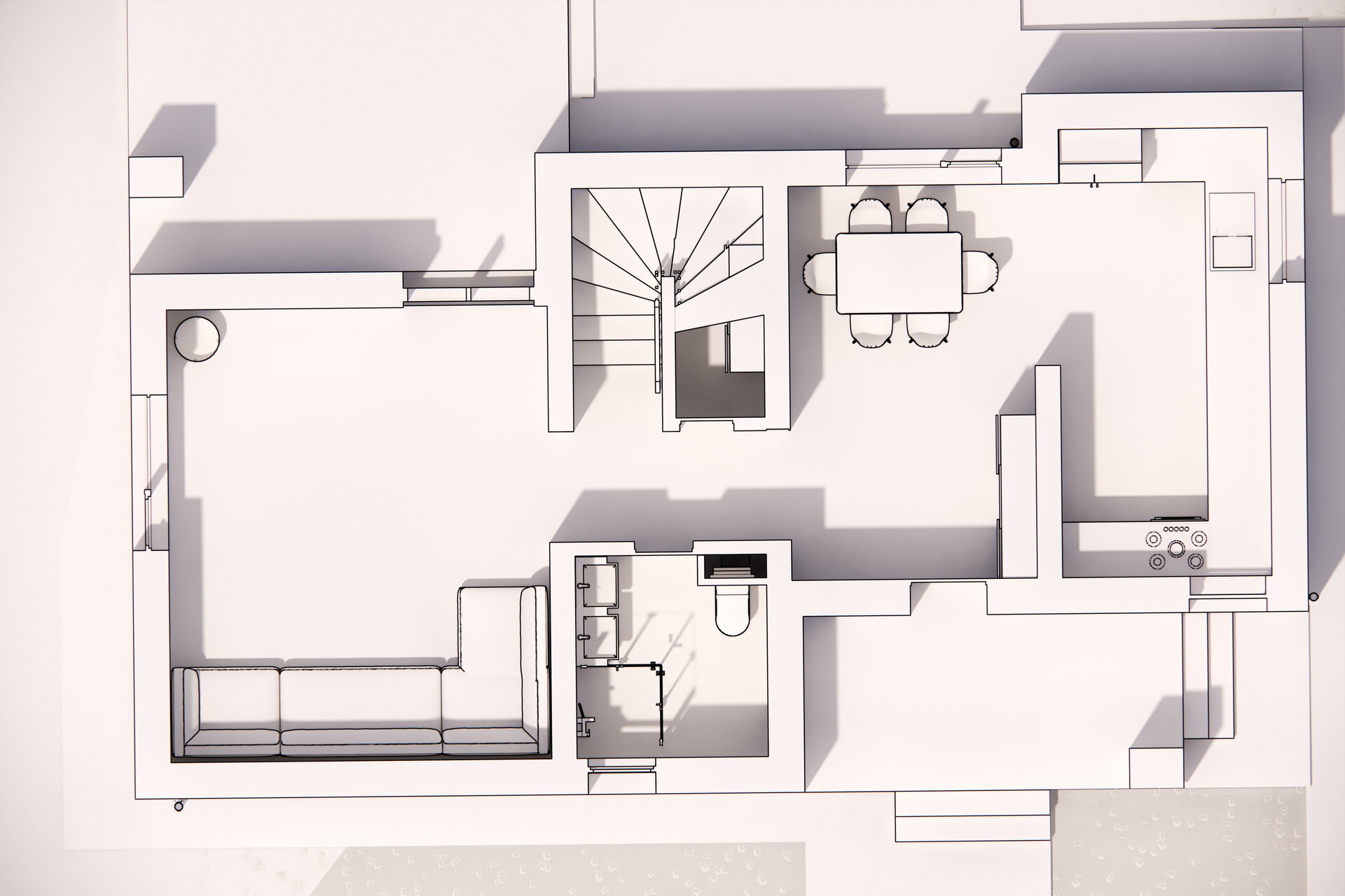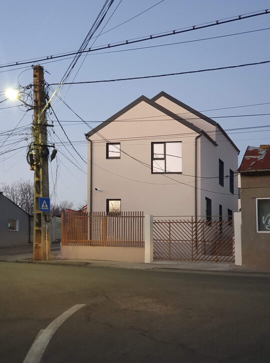 Un teren în pantă, cu o locuință parter în degradare, la intersecția a două străzi, într-un țesut urban pătruns de o arteră de trafic greu. Vechiul cartier "Protoșeni" a primit o șansă proaspătă, odată cu inaugurarea recentă a centurii ocolitoare a municipiului, recăpătându-și tihna esențială pentru zonă de locuit.