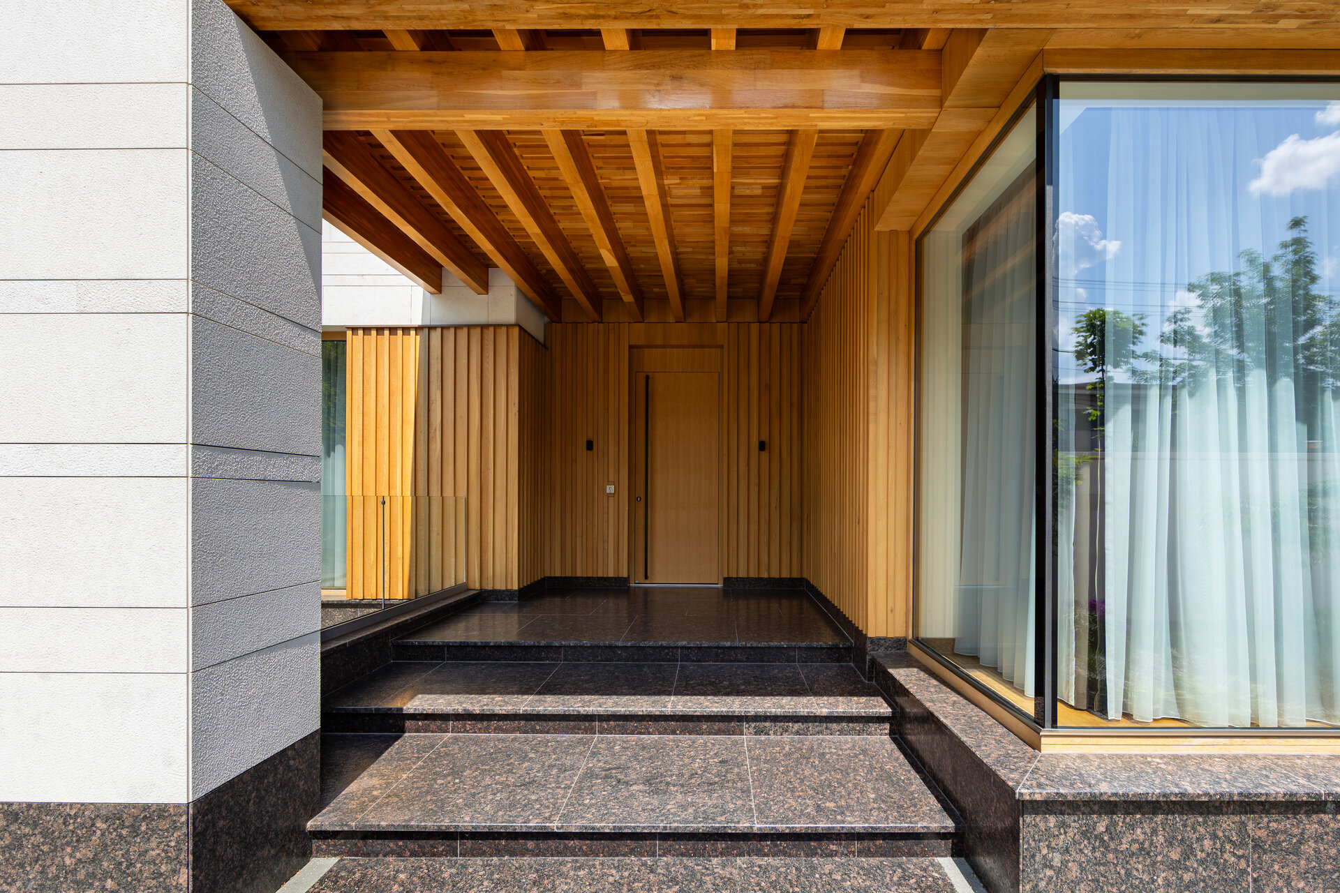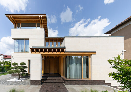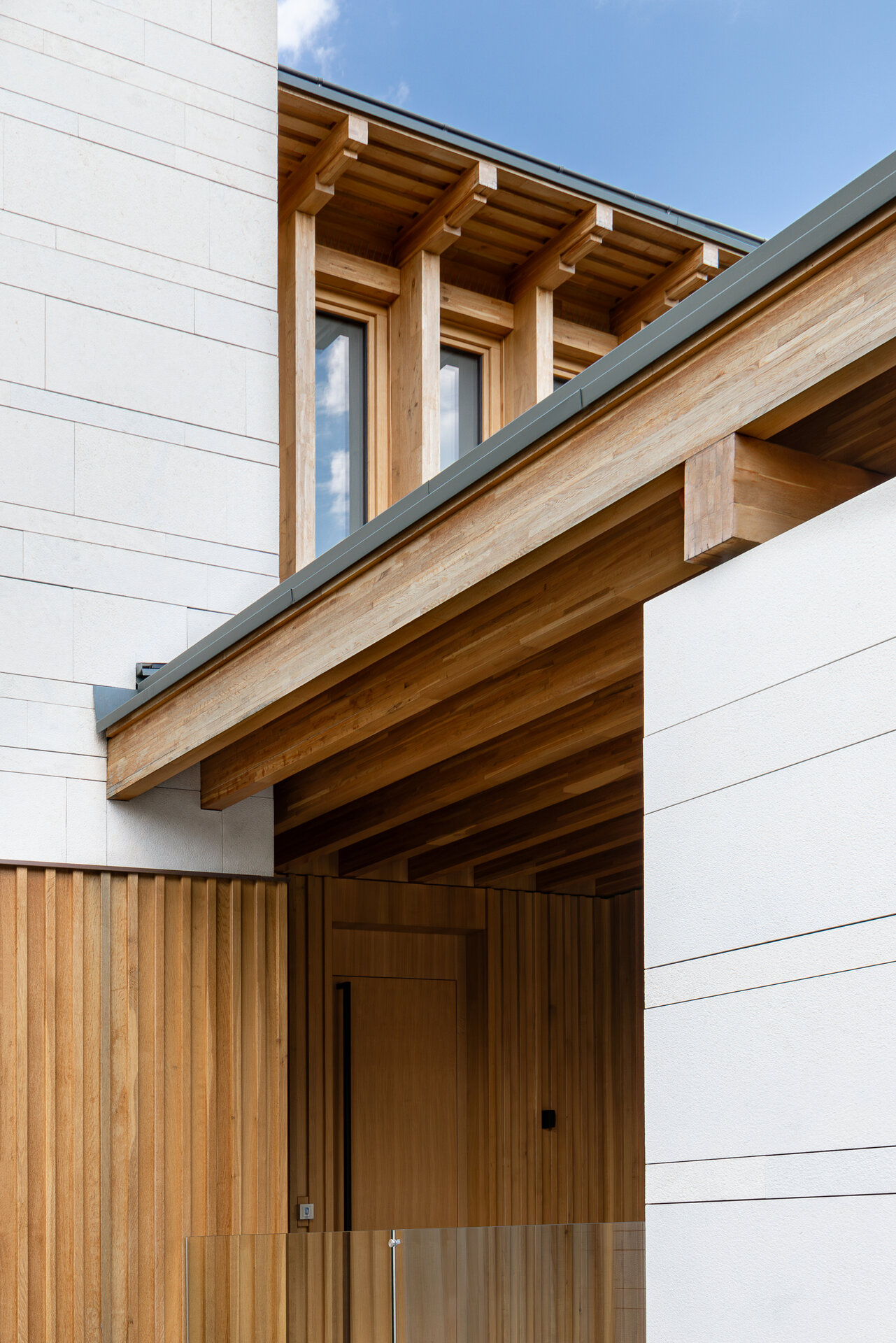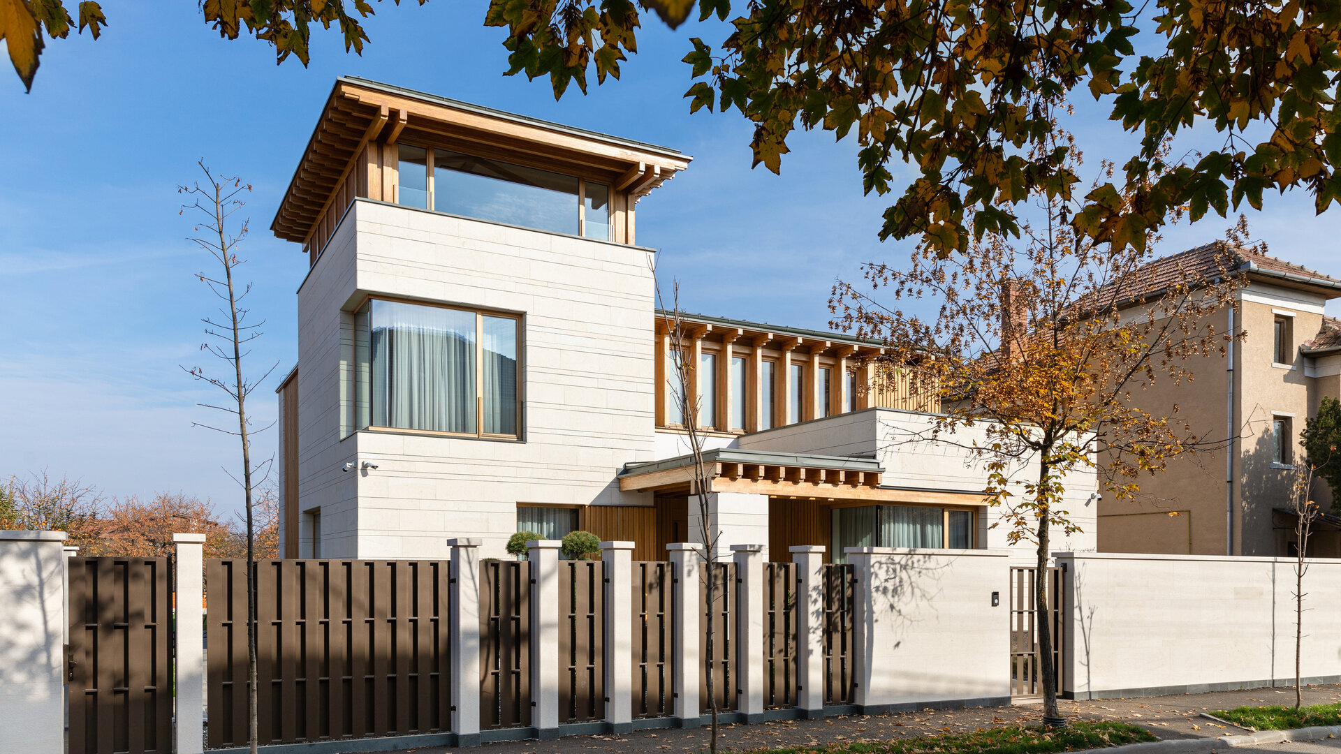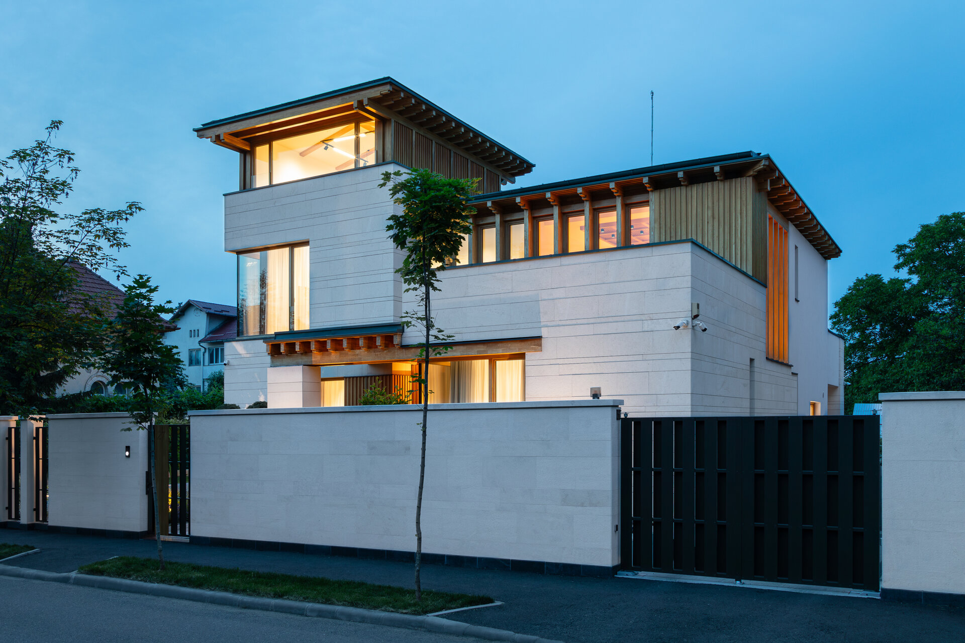 Revenind la fațadele casei, acestea sunt dominate de plăci de piatră naturală de dimensiuni variate, dispuse într-un ritm ordonat și bine proporționat. Soclul din granit de culoare închisă intră în opoziție cu piatra de culoare alba realizându-se un contrast interesant și atrăgator. Formele și liniile casei sunt simple și curate, evitându-se ornamentele și promovând o arhitectură sinceră. Ferestrele mari din sticlă sunt poziționate în locuri strategice pentru a maximiza lumina naturală și pentru a crea o legătură vizuală între interior și exterior, oferind senzația de spațiu și confort. Elementele din lemn natural ce se regăsesc pe fațade sunt orientate vertical pentru a contrasta liniile orizontale generate de placarea din piatră. Zona accesului principal este acoperită de o copertină din lemn stratificat de stejar, atent gândită, atât pentru a fi protejată împotriva intemperiilor cât și pentru marcarea accesului principal în casă. De asemenea, placările din lemn folosite și grinzile de lemn atent chertate care susțin copertina au rolul de a crea o atmosferă îmbietoare care te invită sa treci pragul spre spațiul interior. Conceptul accesului principal a fost preluat și la partea posterioară a casei unde în strânsă legătură cu curtea este o terasă amplă protejată de o copertină din lemn care este susținută de doi stalpi masivi placați cu piatră naturală. Dispunerea grinzilor chertate și stalpiilor de lemn, de la nivelul etajului și al mansardei, oferă armonie prin jocul de plin-gol oferit între materialitate și transparență. Pe de altă parte aceste elemente din lemn au rolul de a rupe masivitatea fațadei și de a delimita volumele clădirii, oferind astfel un efect de plutire părții superioare a volumetriei.