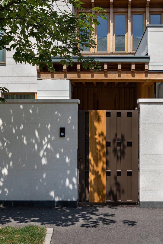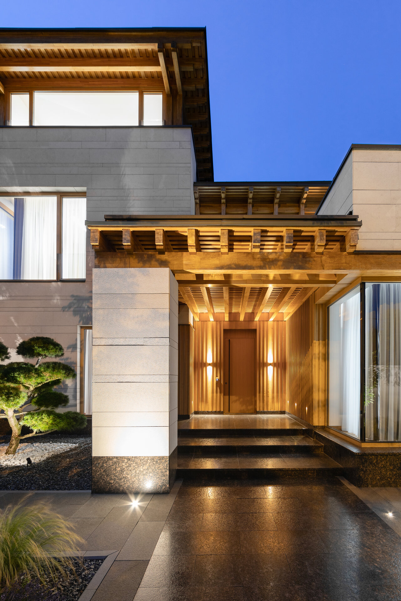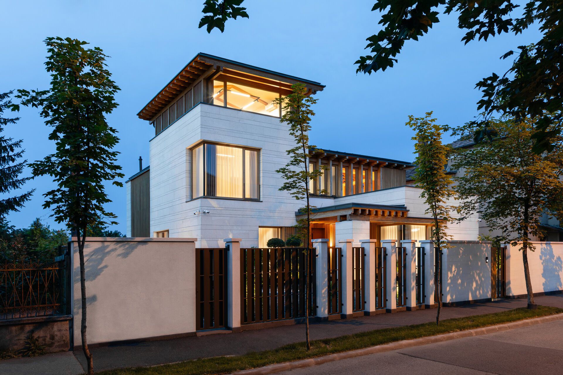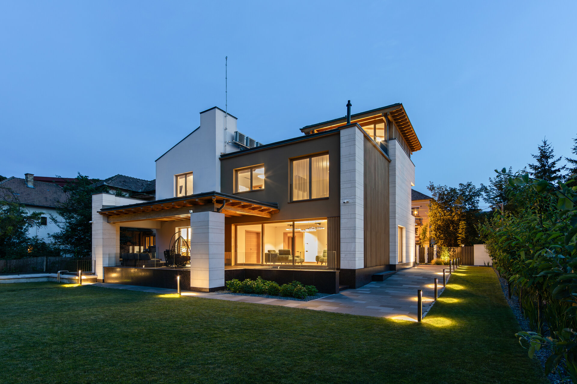 Revenind la fațadele casei, acestea sunt dominate de plăci de piatră naturală de dimensiuni variate, dispuse într-un ritm ordonat și bine proporționat. Soclul din granit de culoare închisă intră în opoziție cu piatra de culoare alba realizându-se un contrast interesant și atrăgator. Formele și liniile casei sunt simple și curate, evitându-se ornamentele și promovând o arhitectură sinceră. Ferestrele mari din sticlă sunt poziționate în locuri strategice pentru a maximiza lumina naturală și pentru a crea o legătură vizuală între interior și exterior, oferind senzația de spațiu și confort. Elementele din lemn natural ce se regăsesc pe fațade sunt orientate vertical pentru a contrasta liniile orizontale generate de placarea din piatră. Zona accesului principal este acoperită de o copertină din lemn stratificat de stejar, atent gândită, atât pentru a fi protejată împotriva intemperiilor cât și pentru marcarea accesului principal în casă. De asemenea, placările din lemn folosite și grinzile de lemn atent chertate care susțin copertina au rolul de a crea o atmosferă îmbietoare care te invită sa treci pragul spre spațiul interior. Conceptul accesului principal a fost preluat și la partea posterioară a casei unde în strânsă legătură cu curtea este o terasă amplă protejată de o copertină din lemn care este susținută de doi stalpi masivi placați cu piatră naturală. Dispunerea grinzilor chertate și stalpiilor de lemn, de la nivelul etajului și al mansardei, oferă armonie prin jocul de plin-gol oferit între materialitate și transparență. Pe de altă parte aceste elemente din lemn au rolul de a rupe masivitatea fațadei și de a delimita volumele clădirii, oferind astfel un efect de plutire părții superioare a volumetriei.