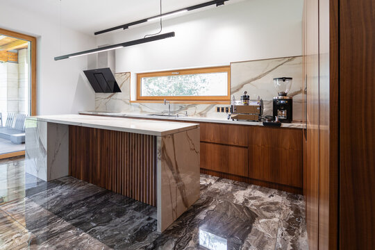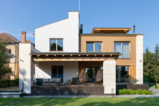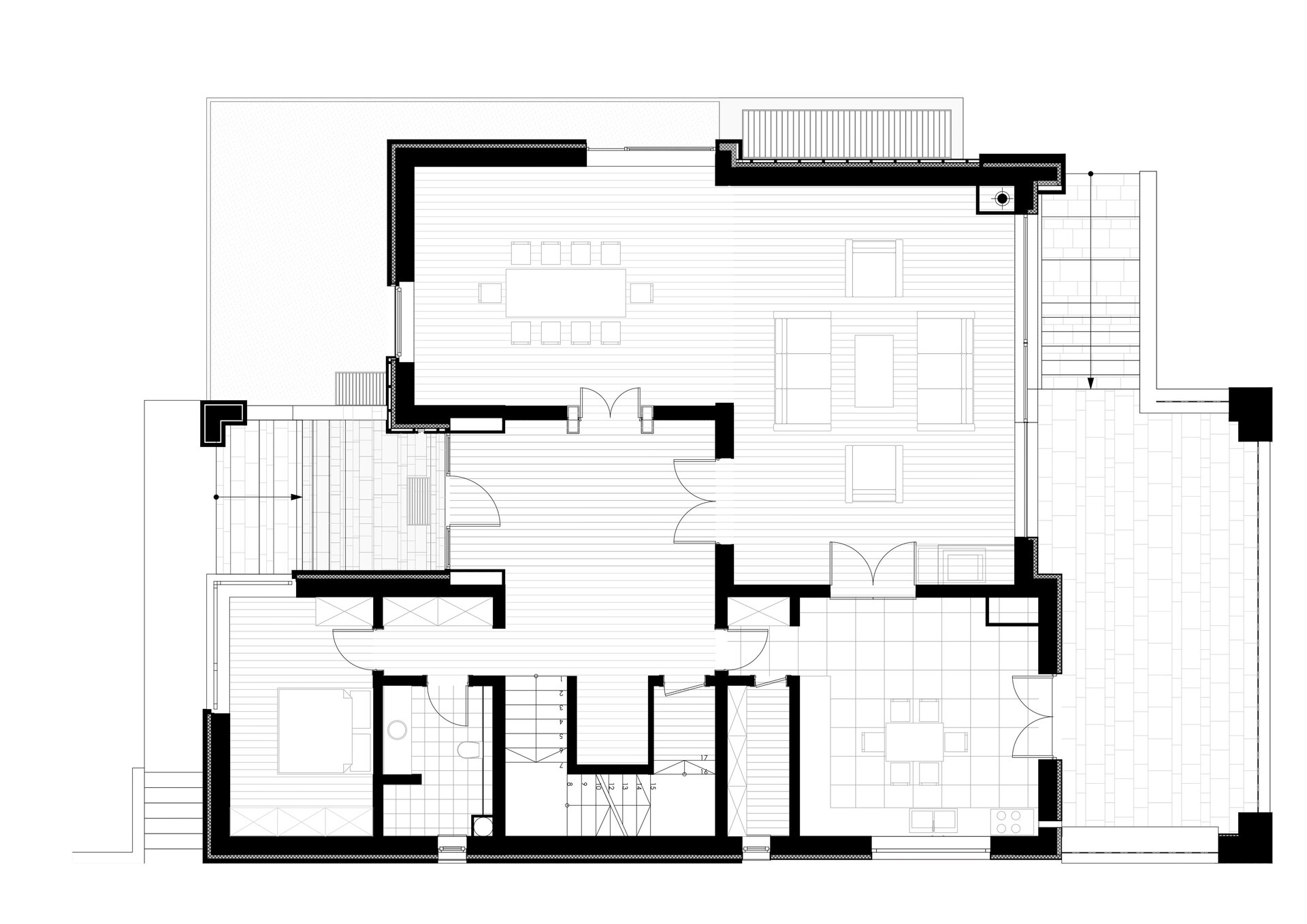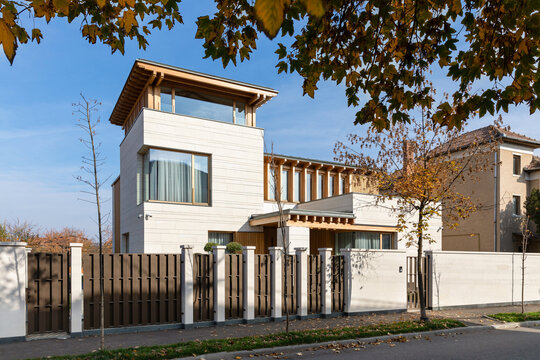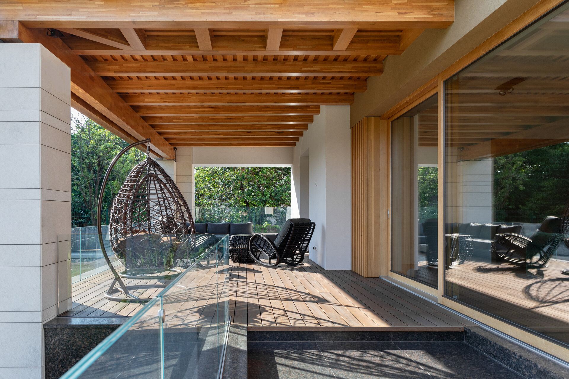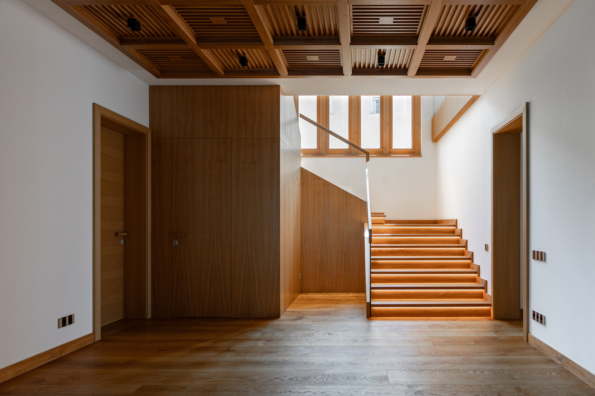 Revenind la fațadele casei, acestea sunt dominate de plăci de piatră naturală de dimensiuni variate, dispuse într-un ritm ordonat și bine proporționat. Soclul din granit de culoare închisă intră în opoziție cu piatra de culoare alba realizându-se un contrast interesant și atrăgator. Formele și liniile casei sunt simple și curate, evitându-se ornamentele și promovând o arhitectură sinceră. Ferestrele mari din sticlă sunt poziționate în locuri strategice pentru a maximiza lumina naturală și pentru a crea o legătură vizuală între interior și exterior, oferind senzația de spațiu și confort. Elementele din lemn natural ce se regăsesc pe fațade sunt orientate vertical pentru a contrasta liniile orizontale generate de placarea din piatră. Zona accesului principal este acoperită de o copertină din lemn stratificat de stejar, atent gândită, atât pentru a fi protejată împotriva intemperiilor cât și pentru marcarea accesului principal în casă. De asemenea, placările din lemn folosite și grinzile de lemn atent chertate care susțin copertina au rolul de a crea o atmosferă îmbietoare care te invită sa treci pragul spre spațiul interior. Conceptul accesului principal a fost preluat și la partea posterioară a casei unde în strânsă legătură cu curtea este o terasă amplă protejată de o copertină din lemn care este susținută de doi stalpi masivi placați cu piatră naturală. Dispunerea grinzilor chertate și stalpiilor de lemn, de la nivelul etajului și al mansardei, oferă armonie prin jocul de plin-gol oferit între materialitate și transparență. Pe de altă parte aceste elemente din lemn au rolul de a rupe masivitatea fațadei și de a delimita volumele clădirii, oferind astfel un efect de plutire părții superioare a volumetriei.