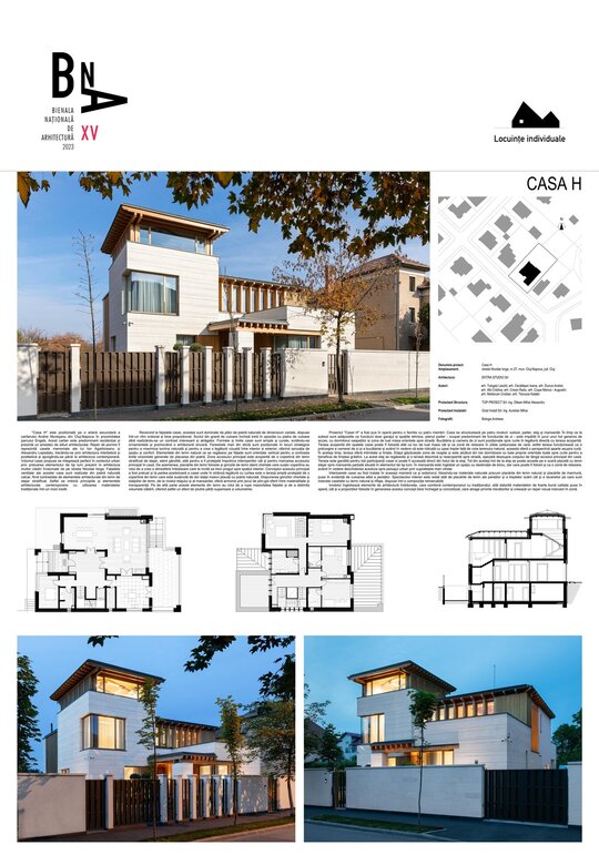 Casa H este pozitionată pe o arteră secundară a cartierului Andrei Mureșanu din Cluj-Napoca în proximitatea parcului Engels. Acest cartier este predominant rezidențial și prezintă un amestec de stiluri arhitecturale. Reper de pornire îl reprezintă casele memoriale ale lui Ion Agarbiceanu și Alexandru Lepedatu, trecându-se prin arhitectura interbelică și postbelică și ajungându-se până la arhitectura contemporană. Volumul casei propuse se integrează perfect în contextul urban prin preluarea elementului de tip turn prezent în arhitectura multor cladiri învecinate de pe strada Nicolae Iorga. Fațadele ventilate ale acestei case sunt realizate din piatră naturală calcar, fiind contrastate de elementele arhitecturale din lemn de stejar stratificat. Astfel se imbină principiile și elementele arhitecturale contemporane cu utilizarea materialelor tradiționale într-un mod inedit.