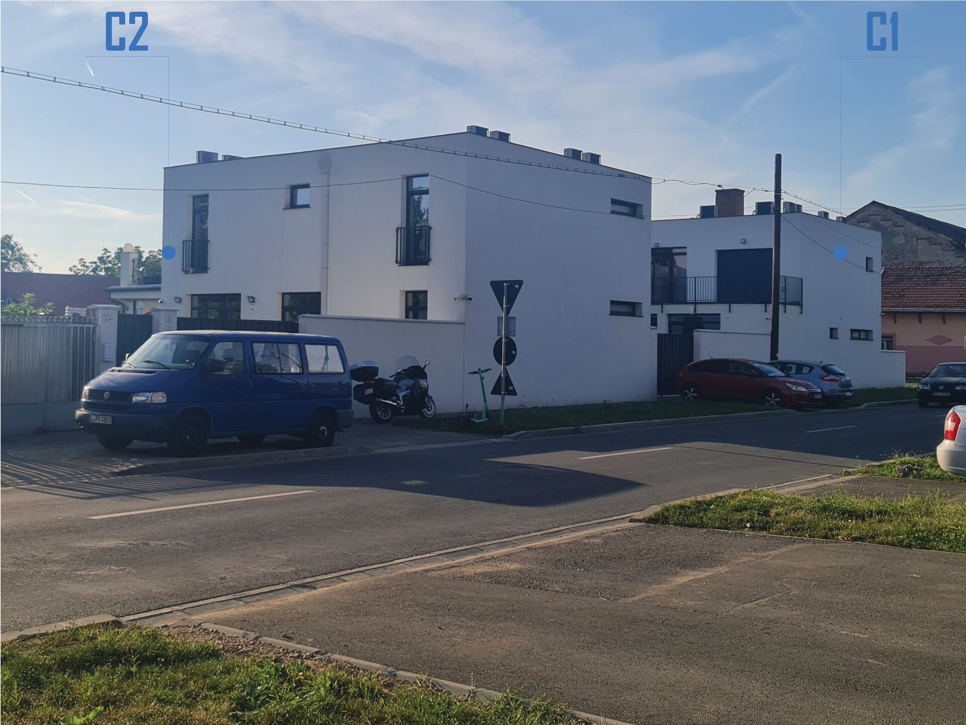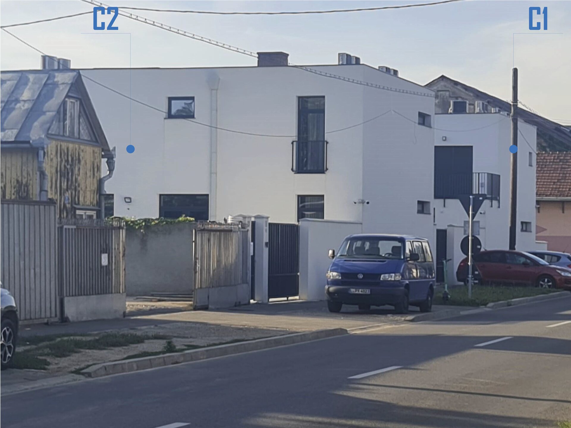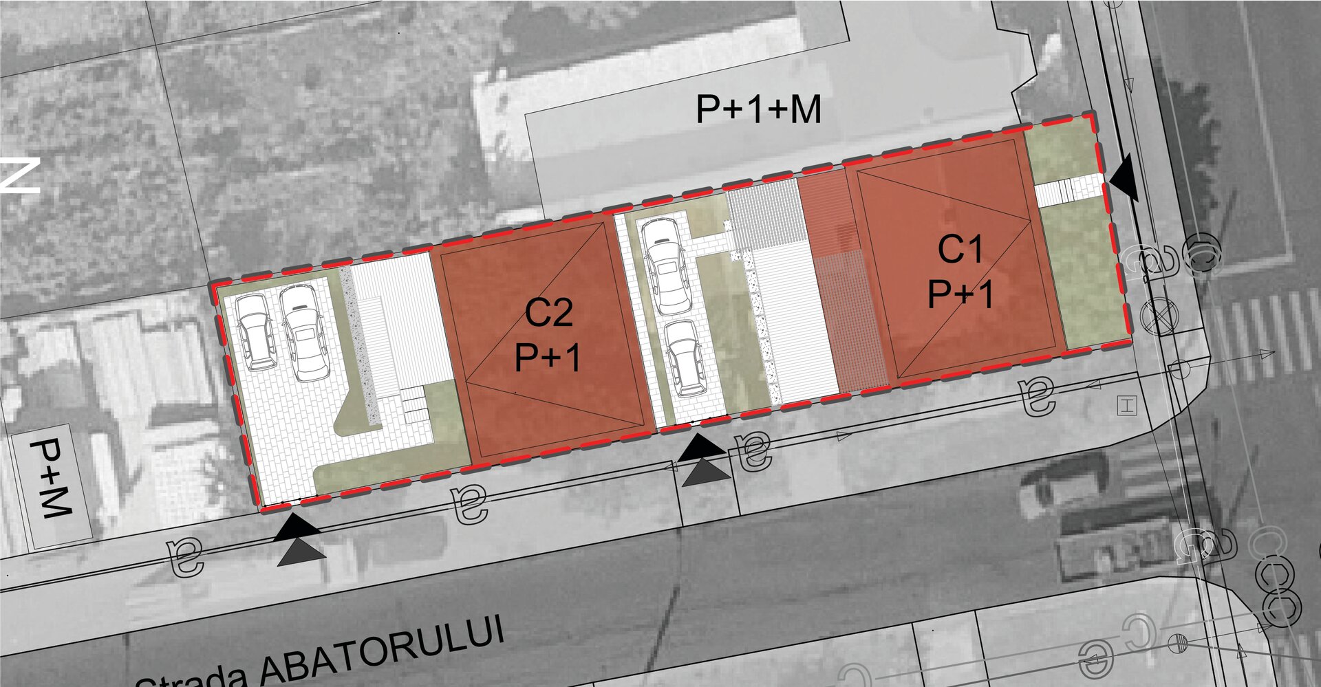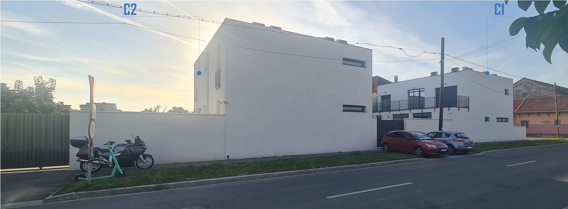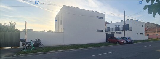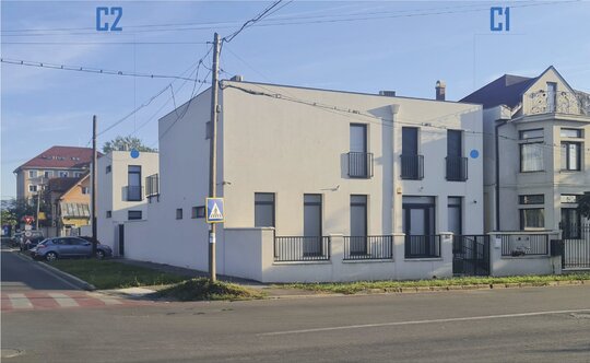 Constructia C2 destinata turismului – aparthotel, 6 camere – este plasata respectand aceleasi rigori: in retragere fata de str. Vladeasa (front 1, principal), respectiv in aliniament raportat la str. Abatorului (front 2, secundar), acoperind calcanul existent edificat pe proprietatea invecinata.