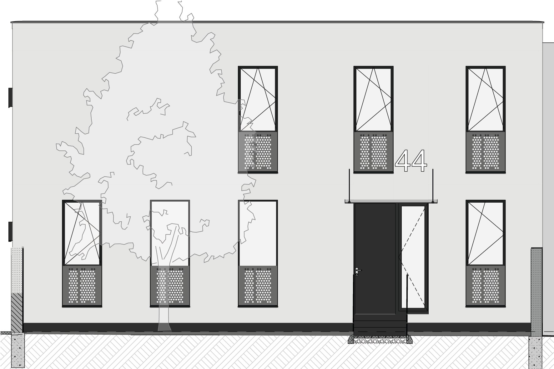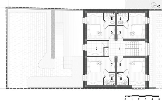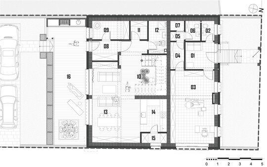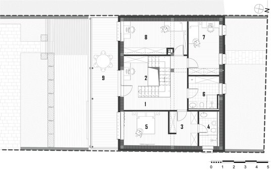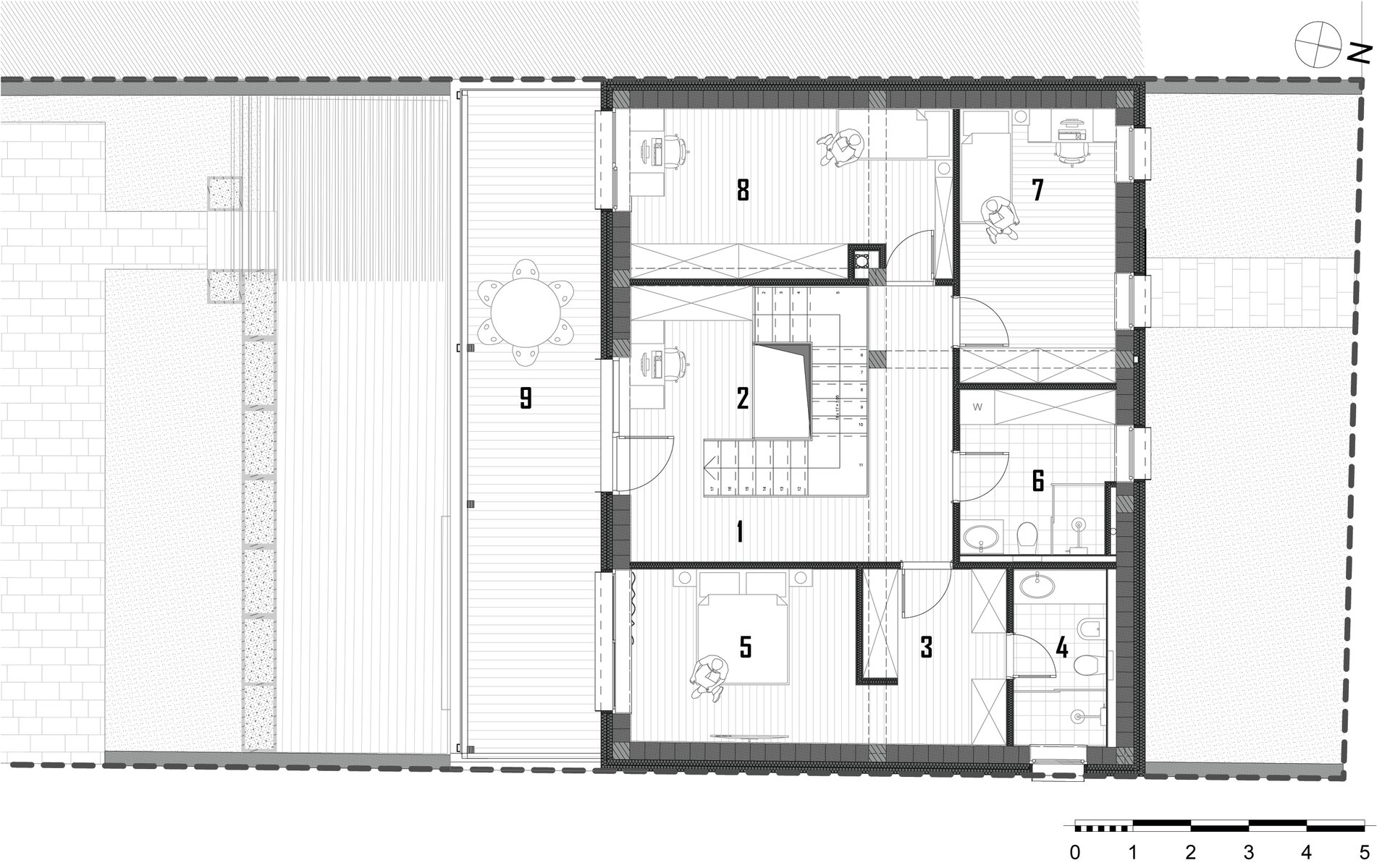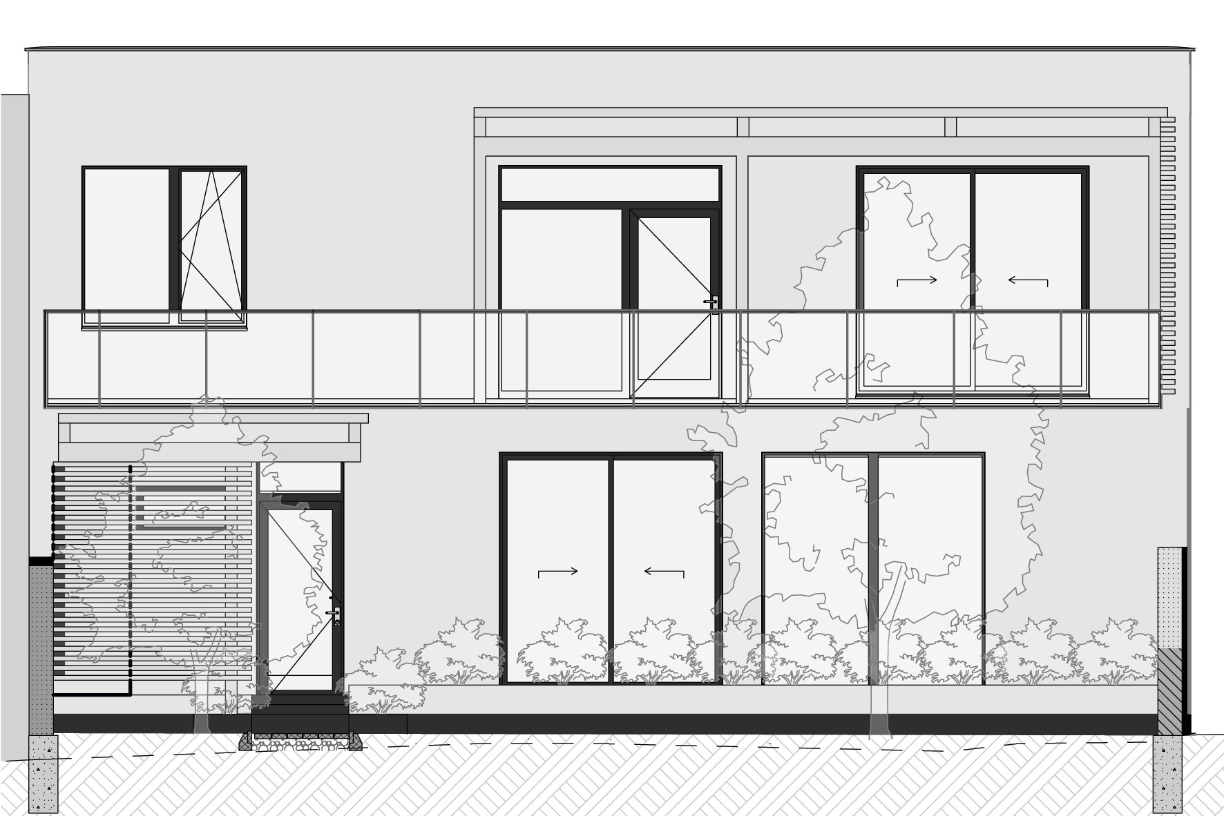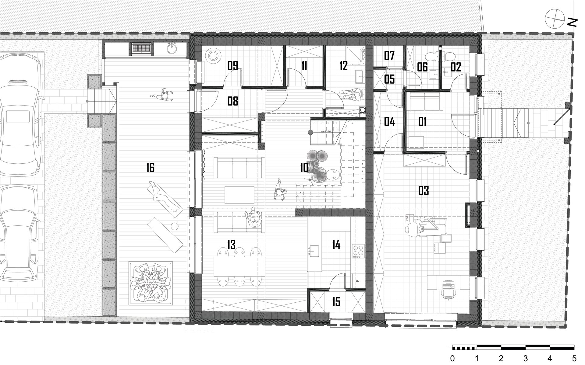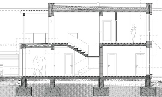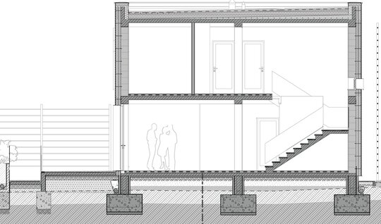 Accesul la spatiile destinate locuirii se realizeaza prin frontul 2. Parterul deserveste zona de acces, spatiile tehnice / depozitarea si zona de zi (bucataria, locul de luat masa si camera de zi – spatiu deschis). Etajul constructiei reprezinta zona destinata odihnei, adapostind dormitoarele. Suprafata utila aferenta locuirii este de 149,52 m2.