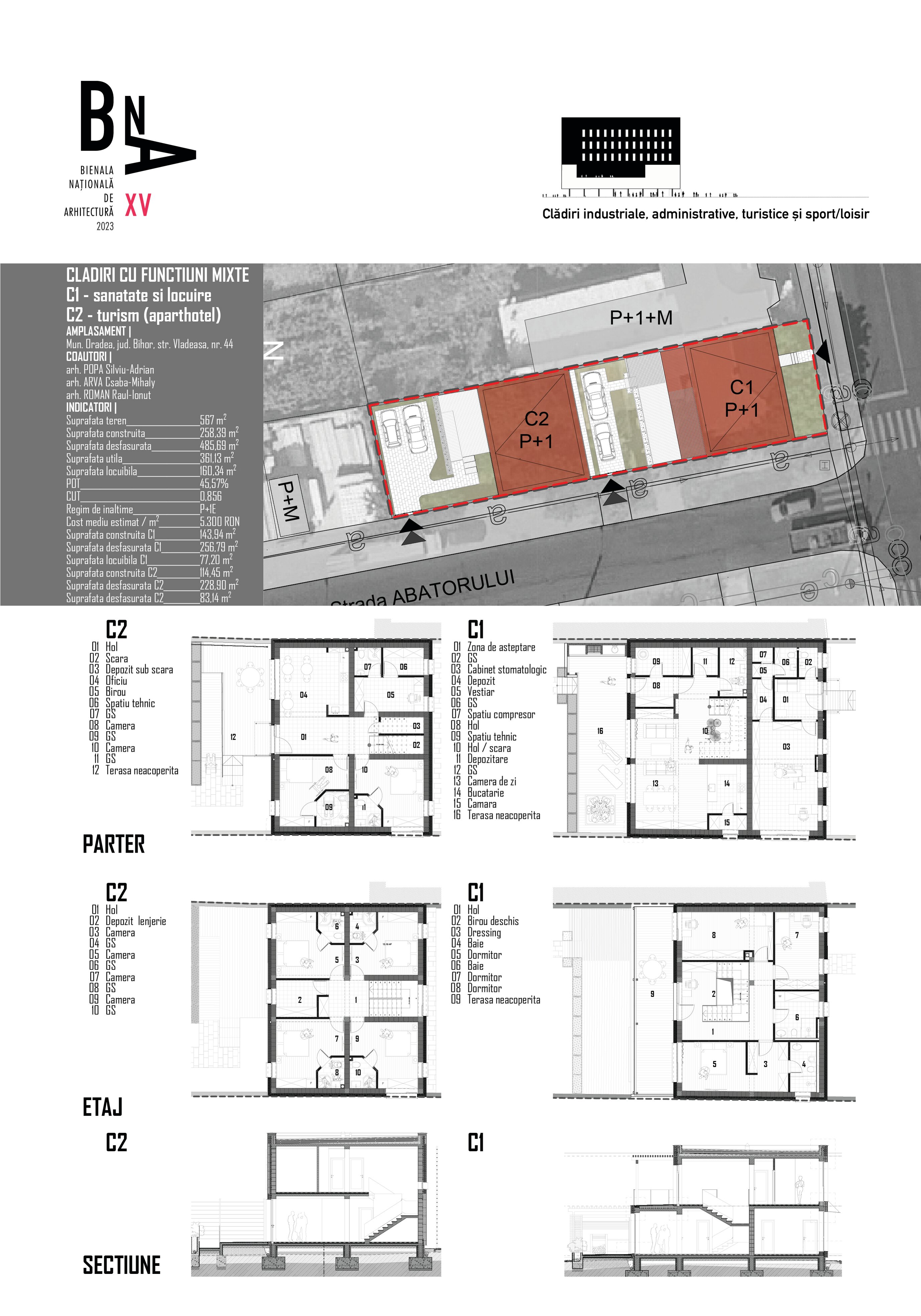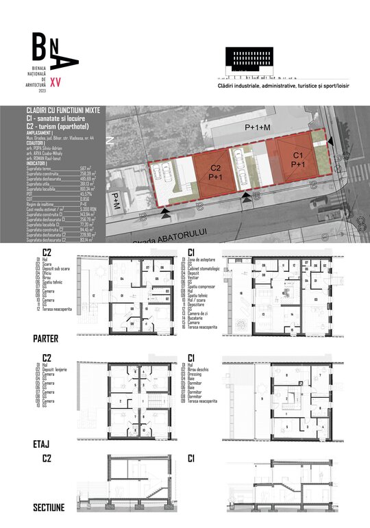 Tema program a constat in realizarea a doua cladiri cu functiuni diferite (una mixta – C1 – destinata serviciilor – sanatate – si locuirii, iar alta – C2 – destinata turismului – aparthotel) pe terenul aflat in proprietatea beneficiarilor, intr-un mod in care coexistenta lor pe aceeasi parcela sa nu determine animozitati la niciun nivel.