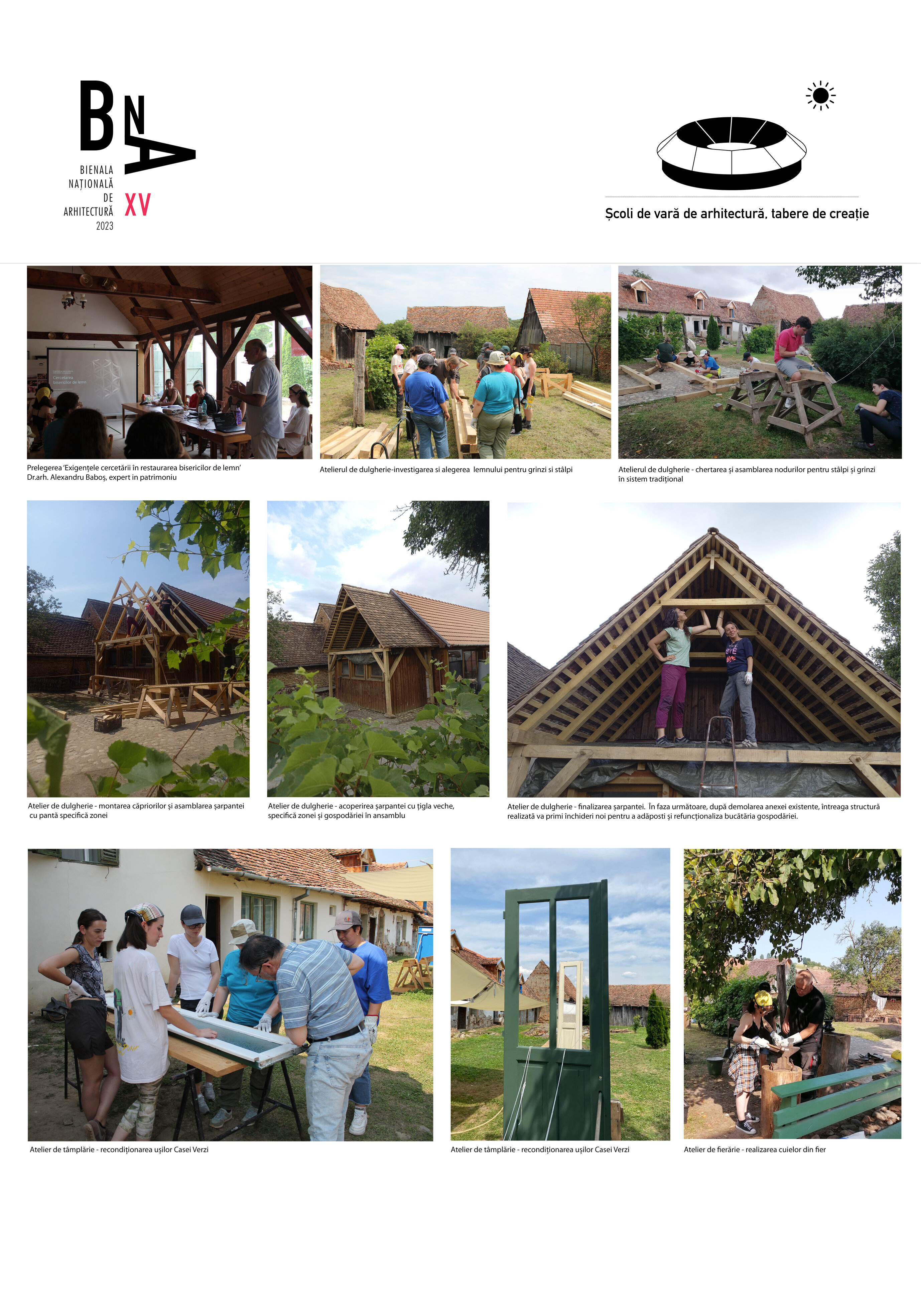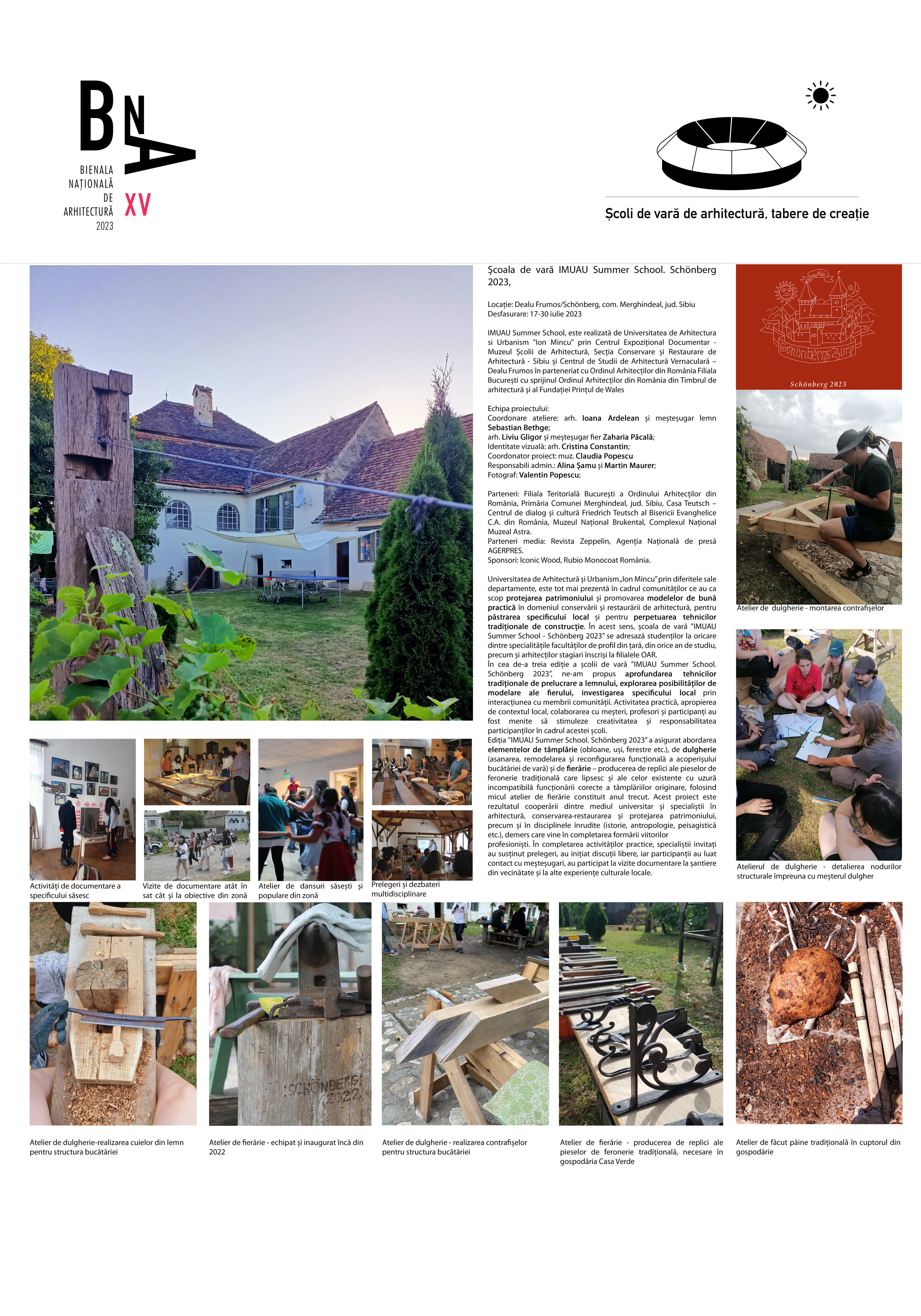 Universitatea de Arhitectură și Urbanism „Ion Mincu” prin diferitele sale departamente, este tot mai prezentă în cadrul comunităților ce au ca scop protejarea patrimoniului și promovarea modelelor de bună practică în domeniul conservării și restaurării de arhitectură, pentru păstrarea specificului local și pentru perpetuarea tehnicilor tradiționale de construcție. În acest sens, școala de vară ”IMUAU Summer School - Schönberg 2023” se adresază studenților la oricare dintre specialitățile facultăților de profil din țară, din orice an de studiu, precum și arhitecților stagiari înscriși la filialele OAR. În cea de-a treia ediție a școlii de vară ”IMUAU Summer School. Schönberg 2023”, ne-am propus aprofundarea tehnicilor tradiționale de prelucrare a lemnului, explorarea posibilităților de modelare ale fierului, investigarea specificului local prin interacțiunea cu membrii comunității. Activitatea practică, apropierea de contextul local, colaborarea cu meșteri, profesori și participanți au fost menite să stimuleze creativitatea și responsabilitatea participanților în cadrul acestei școli. Ediția ”IMUAU Summer School. Schönberg 2023” a asigurat abordarea elementelor de tâmplărie (obloane, uși, ferestre etc.), de dulgherie (asanarea, remodelarea și reconfigurarea funcțională a acoperișului bucătăriei gospodăriei) și de fierărie – producerea de replici ale pieselor de feronerie tradițională care lipsesc și ale celor existente cu uzură incompatibilă funcționării corecte a tâmplăriilor originare, folosind micul atelier de fierărie constituit anul trecut. Acest proiect este rezultatul cooperării dintre mediul universitar și specialiștii în arhitectură, conservarea-restaurarea și protejarea patrimoniului, precum și în disciplinele înrudite (istorie, antropologie, peisagistică etc.), demers care vine în completarea formării viitorilor profesioniști. În completarea activităților practice, specialiștii invitați au susținut prelegeri, au inițiat discuții libere, iar participanții au luat contact cu meșteșugari, au participat la vizite documentare la șantiere din vecinătate și la alte experiențe culturale locale.