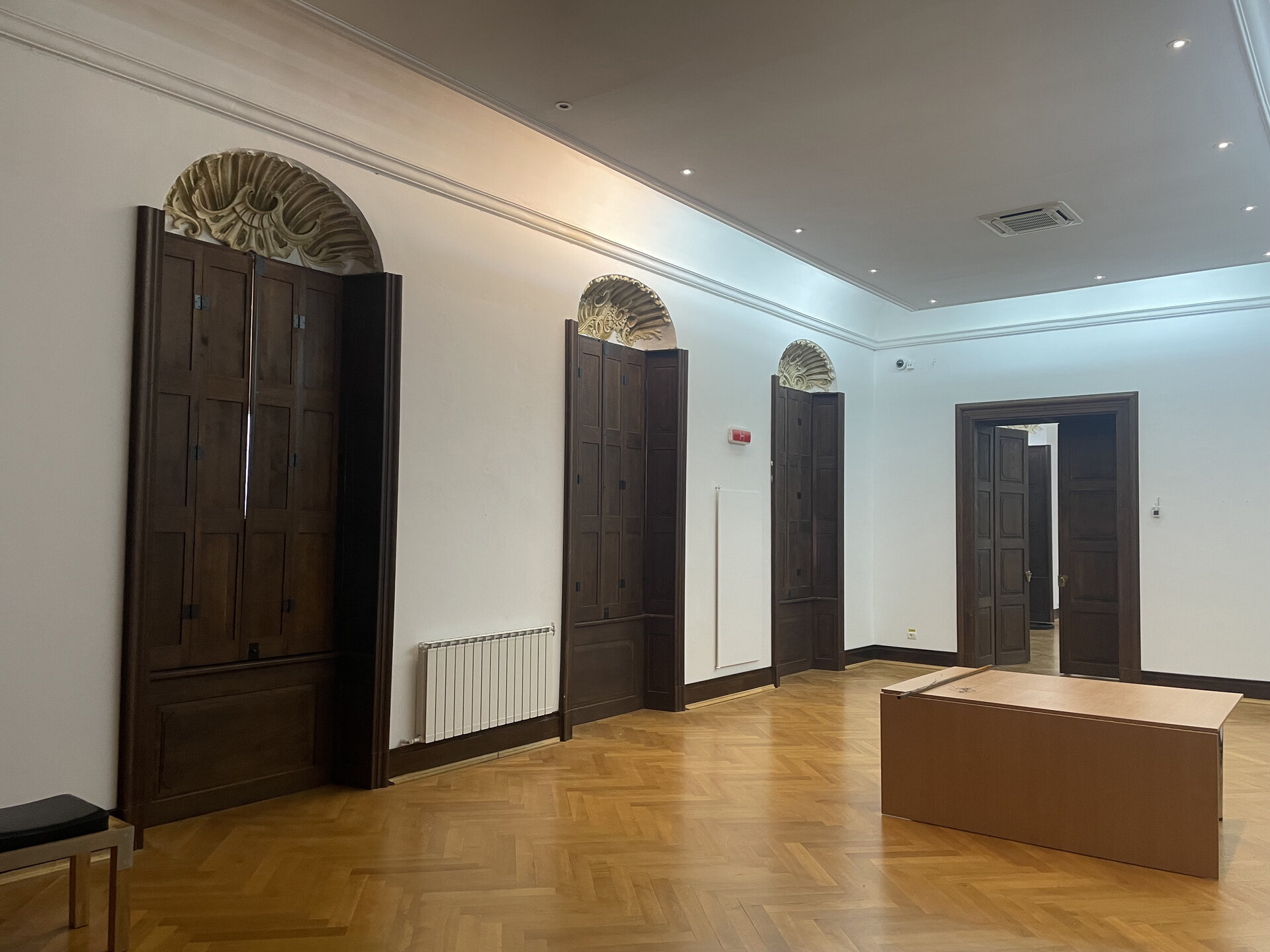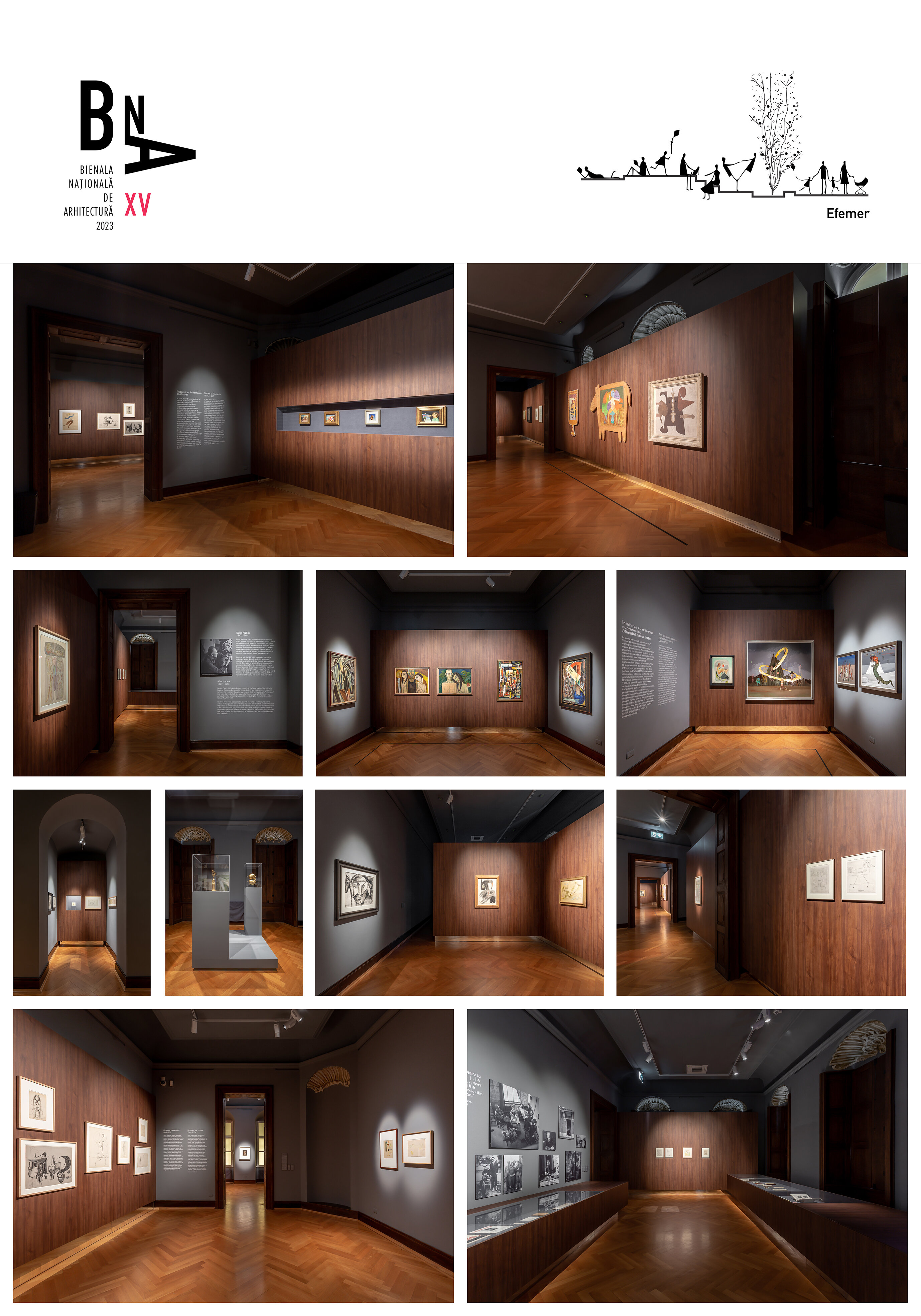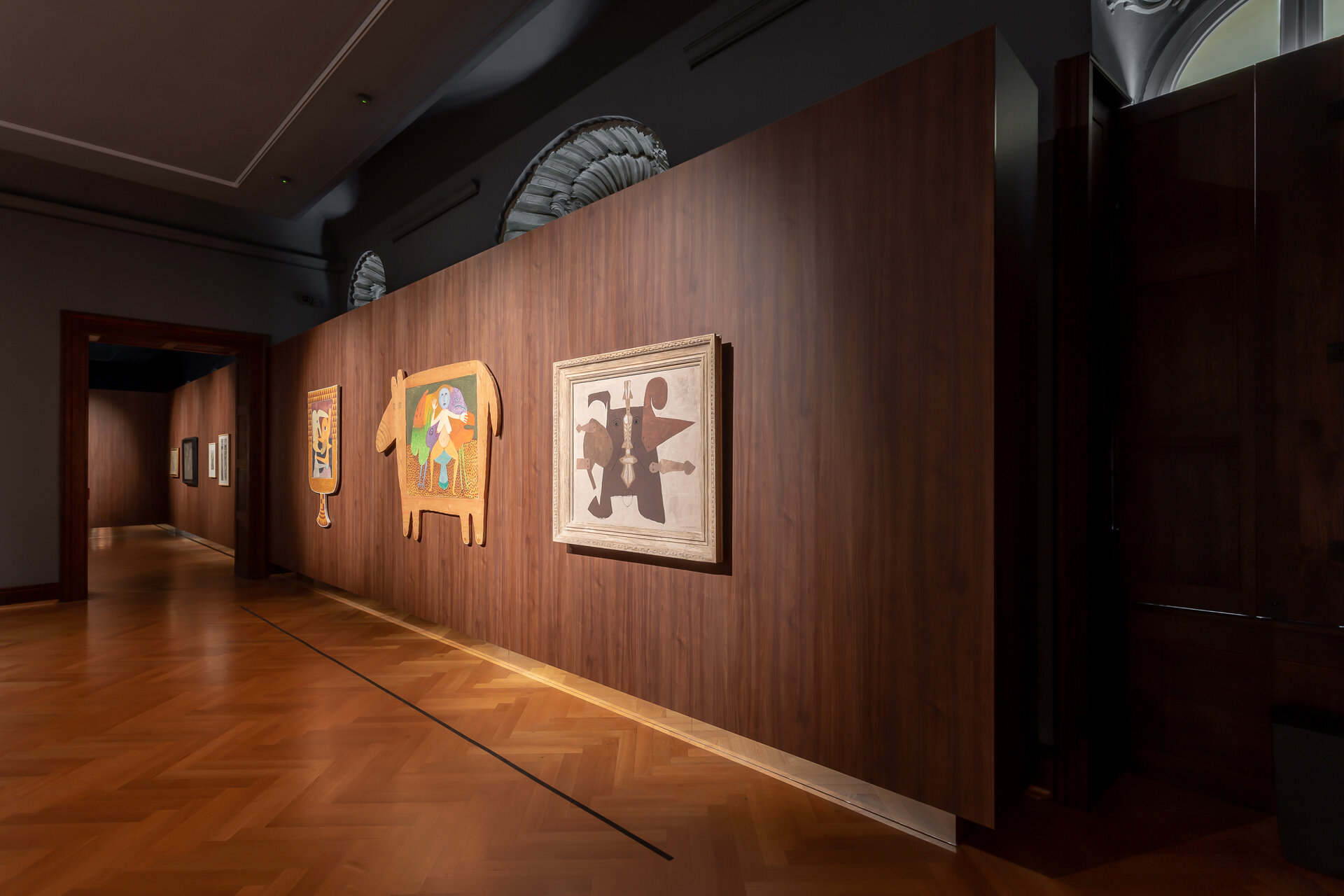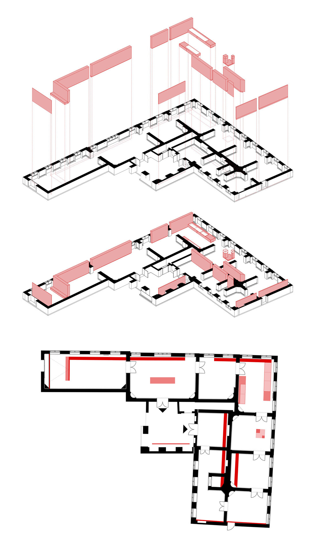 Se propune realizarea unor pereți noi, care să permită ascunderea unor nișe existente, sau să permită expunerea în fața unor goluri existente, astfel creând mai multă suprafață de perete pentru expunerea lucrărilor. Acești pereți noi sunt finisați cu material lemnos, de nuanță apropiată cu maroul închis al tâmplăriilor, citând lambriurile de lemn ale caselor interbelice. Panotarea lucrărilor de artă pe suprafețe de lemn era o practică răspândită în ultimul secol, modalitate întâlnită des și în cazul interioarelor moderniste.