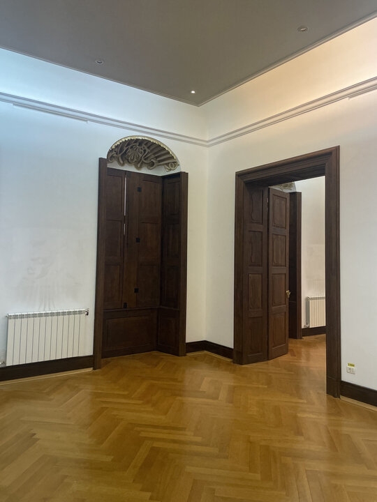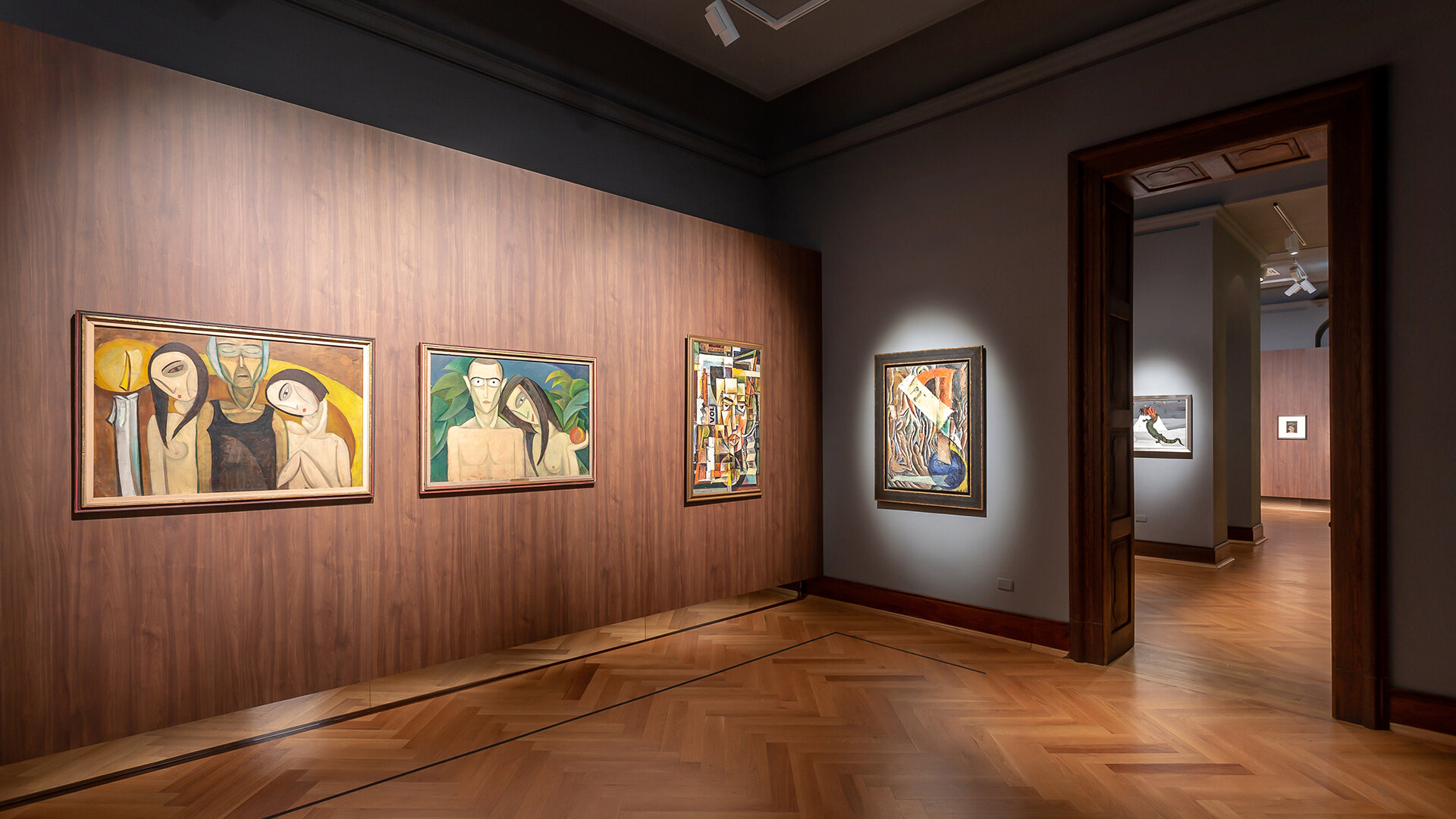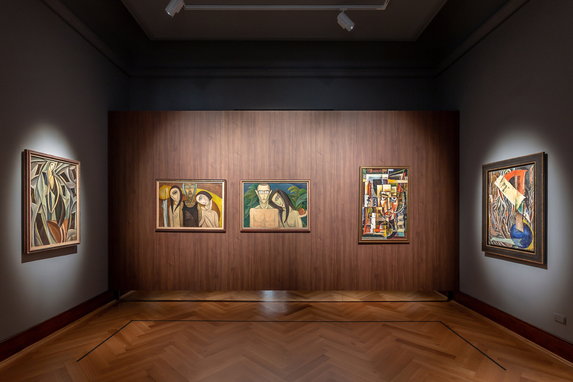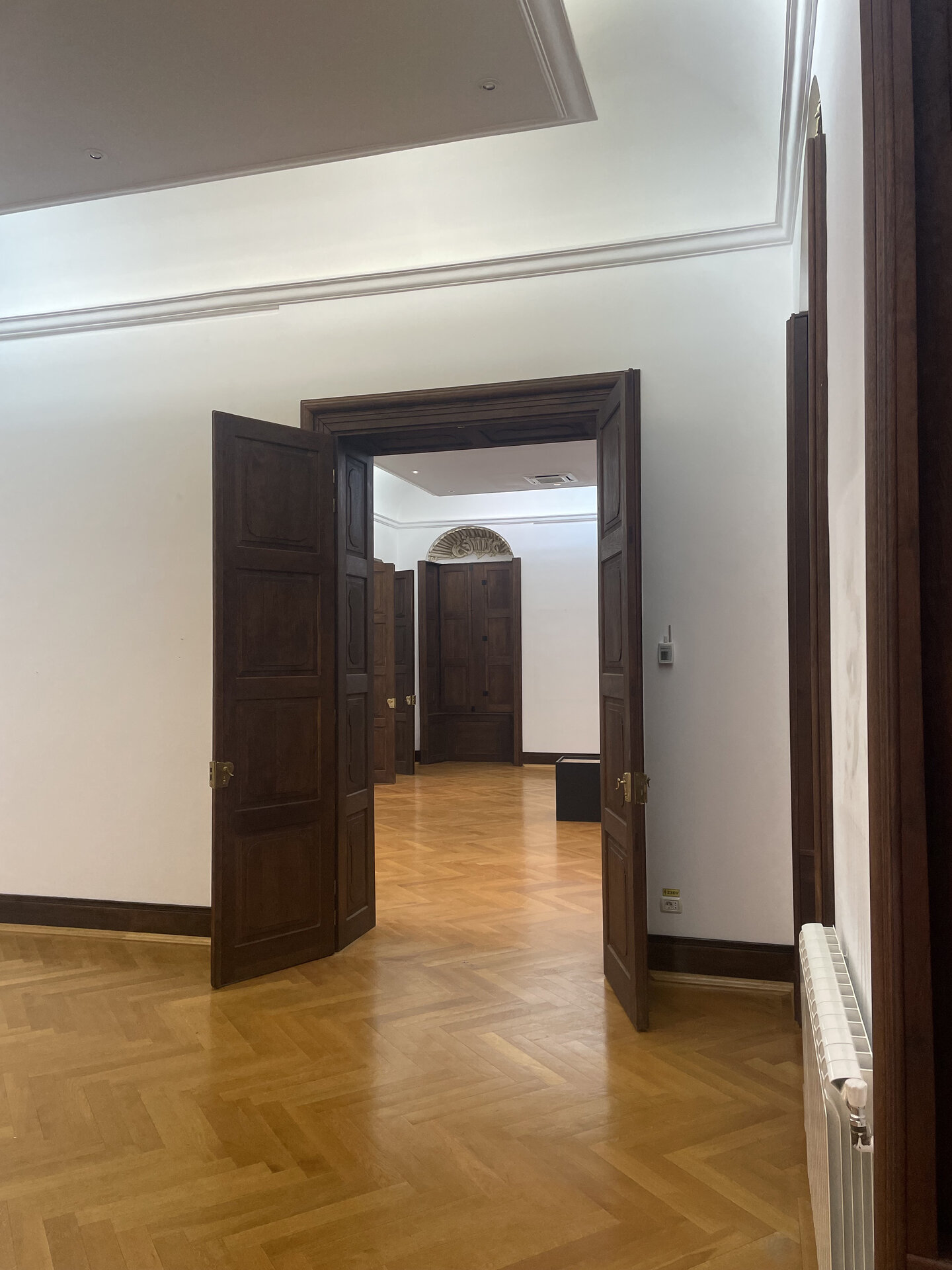 Se propune realizarea unor pereți noi, care să permită ascunderea unor nișe existente, sau să permită expunerea în fața unor goluri existente, astfel creând mai multă suprafață de perete pentru expunerea lucrărilor. Acești pereți noi sunt finisați cu material lemnos, de nuanță apropiată cu maroul închis al tâmplăriilor, citând lambriurile de lemn ale caselor interbelice. Panotarea lucrărilor de artă pe suprafețe de lemn era o practică răspândită în ultimul secol, modalitate întâlnită des și în cazul interioarelor moderniste.