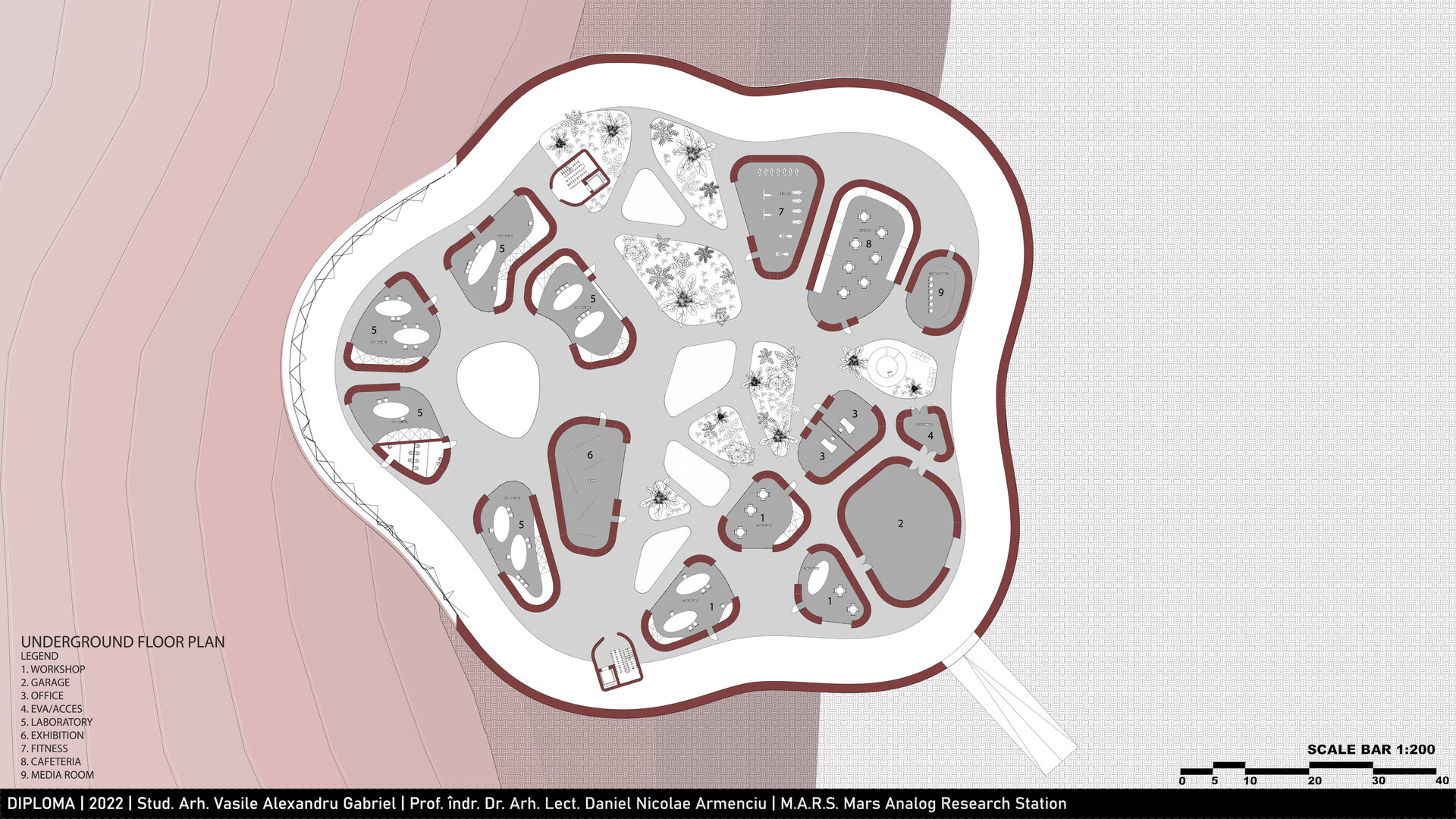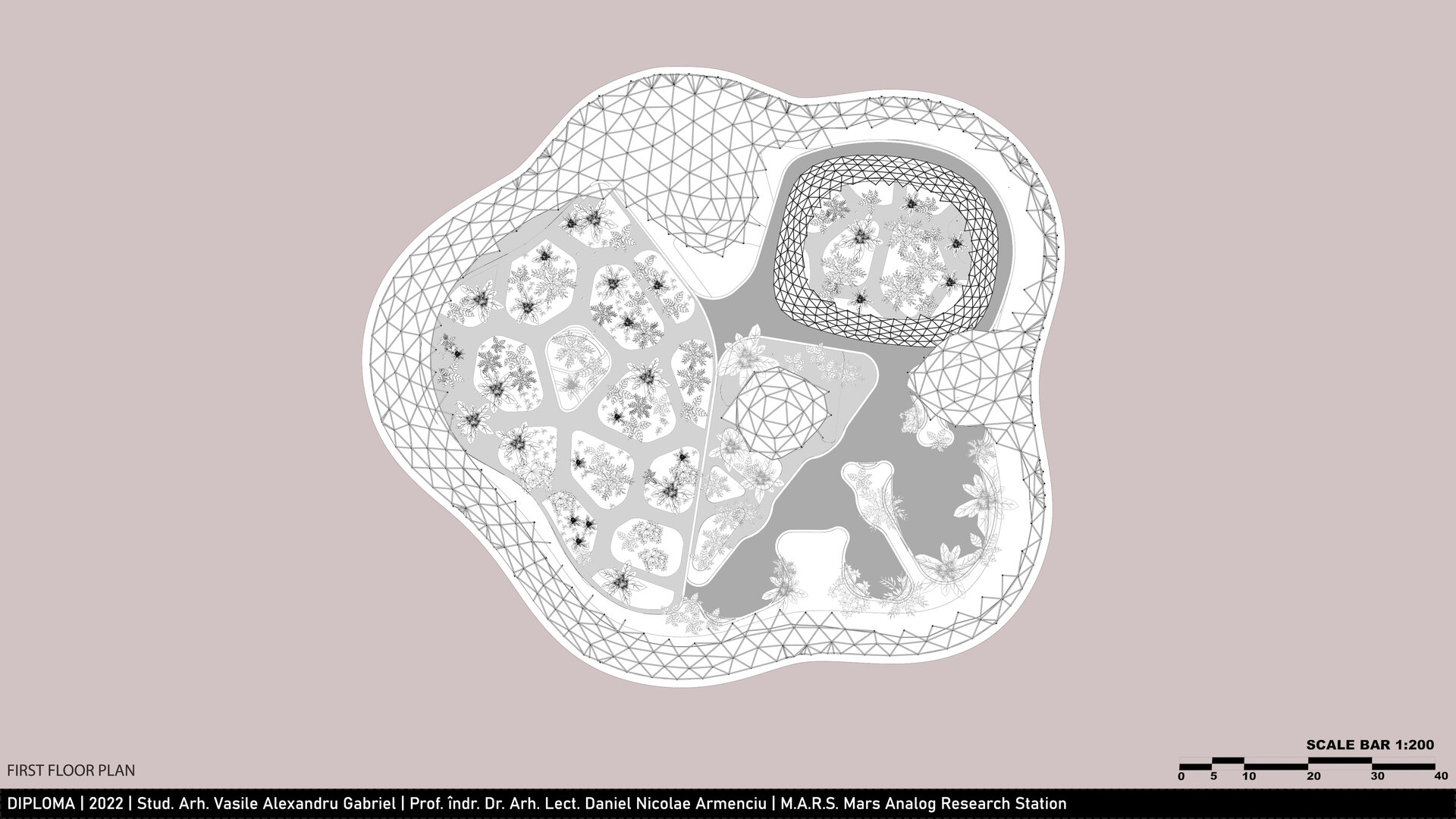 Proiectul îmbină diverse funcționalități pentru a crea un mediu complet și autonom pe planeta Marte. Baza cuprinde spații de locuit adaptate pentru condiții umane, spații de cercetare tehnologică și 3D, zone de producție, cabinete medicale, sere pentru culturi agricole și biodiversitate, precum și spații comune pentru interacțiune și recreere. Caracteristicile definitorii ale stației includ peretele de pământ printat în 3D, care alcătuiește structura bazelor, creând o atmosferă prietenoasă și primordială. Designul structurii cavernoase asigură protecție împotriva radiațiilor și instabilităților climatice, contribuind la un sentiment de siguranță. Vegetația abundentă, distribuită în sere și spații comune, nu doar generează oxigen și creează un ciclu de resurse, dar creează și un peisaj care evocă originile umane în peșteri, sugerează legătura dintre om și natură într-un mod plin de semnificație. În ansamblu, se reinterpretează esența explorării umane din trecut, propunând o simbioză armonioasă între tehnologie avansată și amintiri primordiale cand omul inca traia in pesteri si se aventura intr-o lume necunoscuta, salbatica dar plina de viata si incercari care l-au format si au dat nastere civilizatiei de astazi.