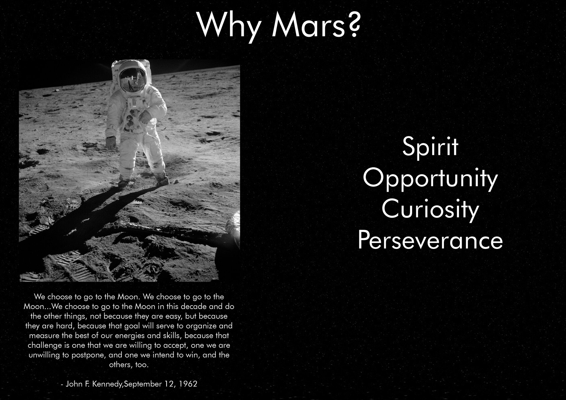 „Noi alegem să mergem pe Lună. Alegem să mergem pe Lună, și să facem și celelalte lucruri, nu pentru că sunt ușoare, ci tocmai pentru că sunt grele, pentru că acest obiectiv va servi să ne organizeze și să ne dea măsura a tot ce e mai bun în energia și abilitățile noastre, pentru că provocarea este una pe care suntem dispuși să o acceptăm, una pe care nu vrem să o amânăm, și una pe care avem de gând s-o câștigăm, la fel ca pe toate celelalte.” „Acum mulți ani, marele explorator britanic George Mallory, care avea să moară pe muntele Everest, a fost întrebat de ce vrea să-l urce. A spus: Pentru că este acolo. Ei bine, spațiul e și el acolo, și avem de gând să-l cucerim, la fel și Luna și planetele, precum și speranțe noi pentru cunoaștere și pace. Astfel, pornim într-o călătorie cerând binecuvântarea Domnului în cea mai periculoasă și grea, dar și cea mai mare aventură a omenirii.” - Fragment din discursul președintelui american John F. Kennedy, de pe Stadionul Rice din Houston, Texas, din 12 septembrie 1962
