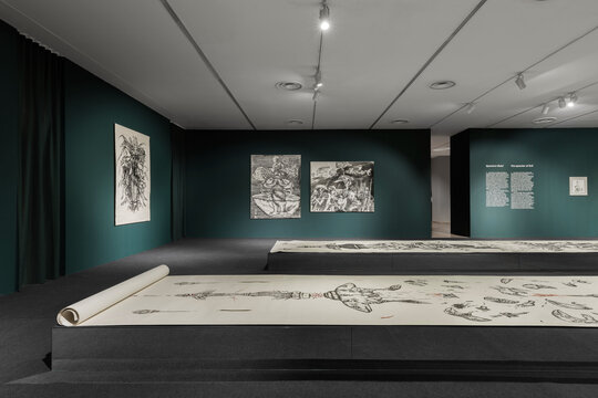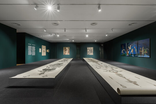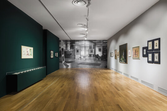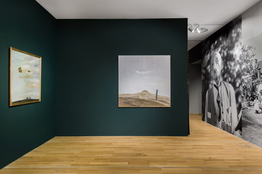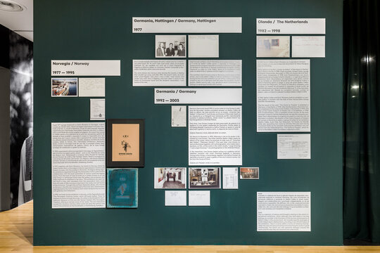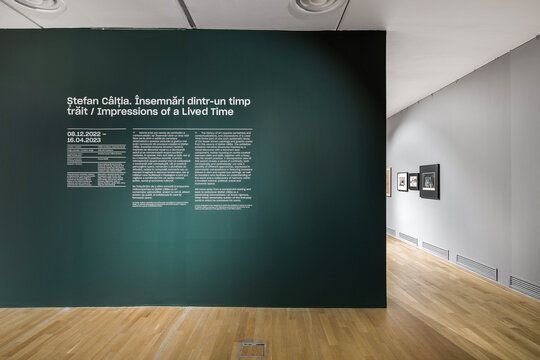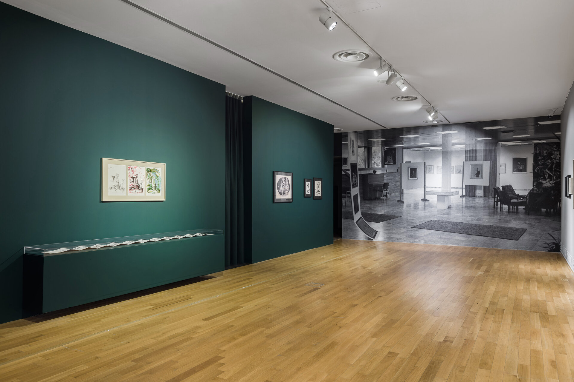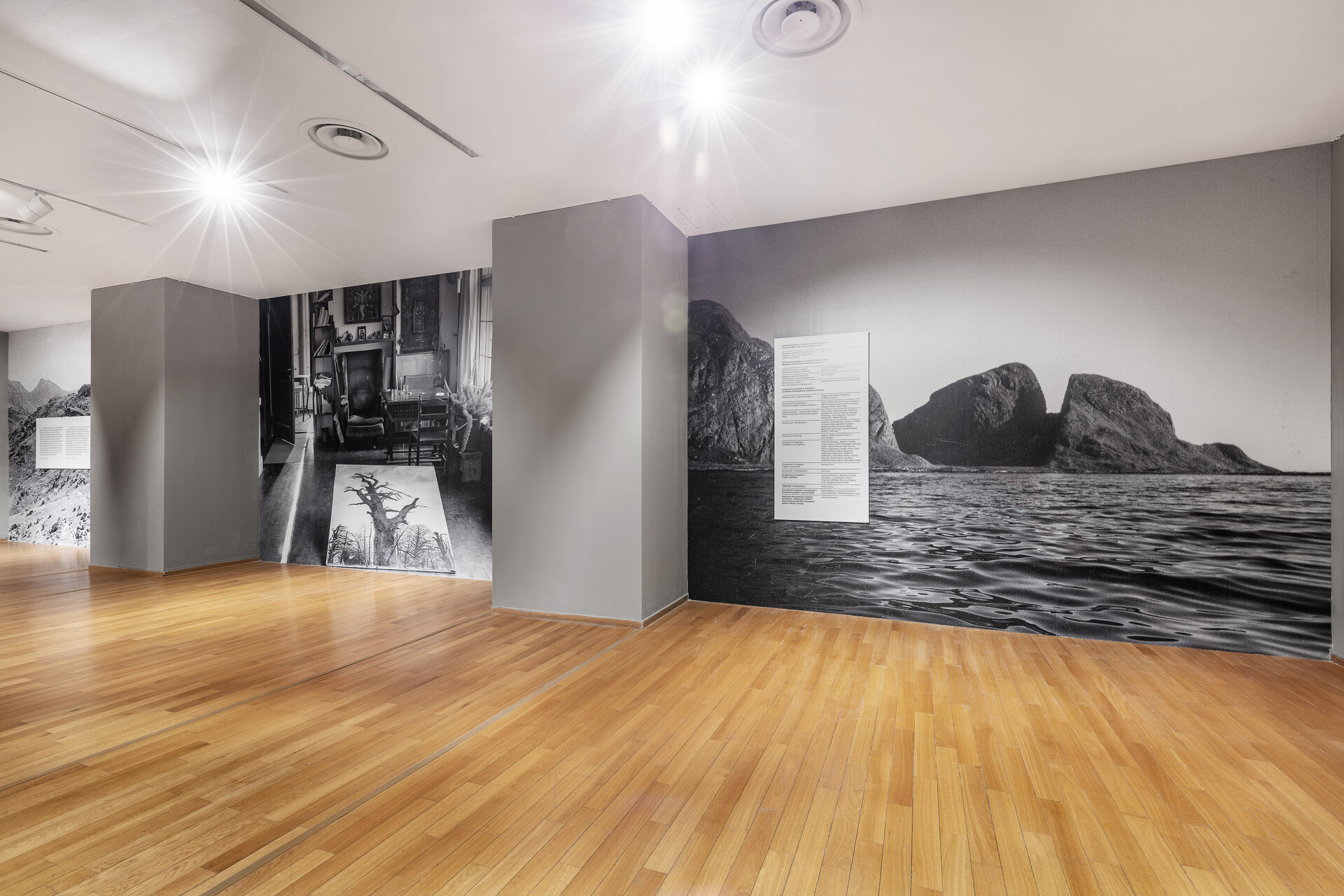 Spațiile din jur sunt acoperite cu tapet alb-negru, reprezentând momente semnificative pentru opera artistului și definind o atmosferă generală de introspecție.