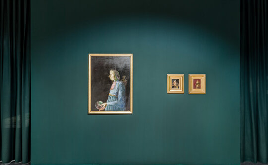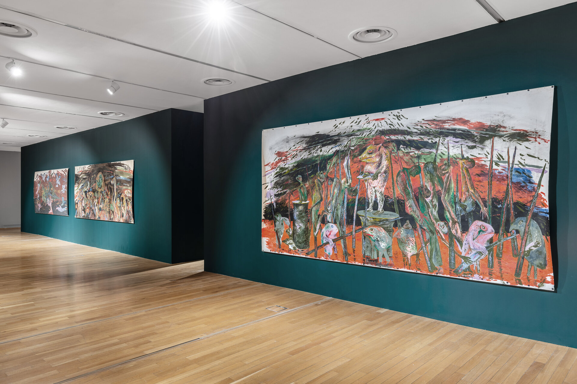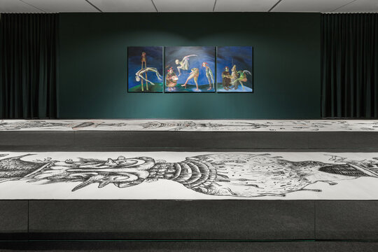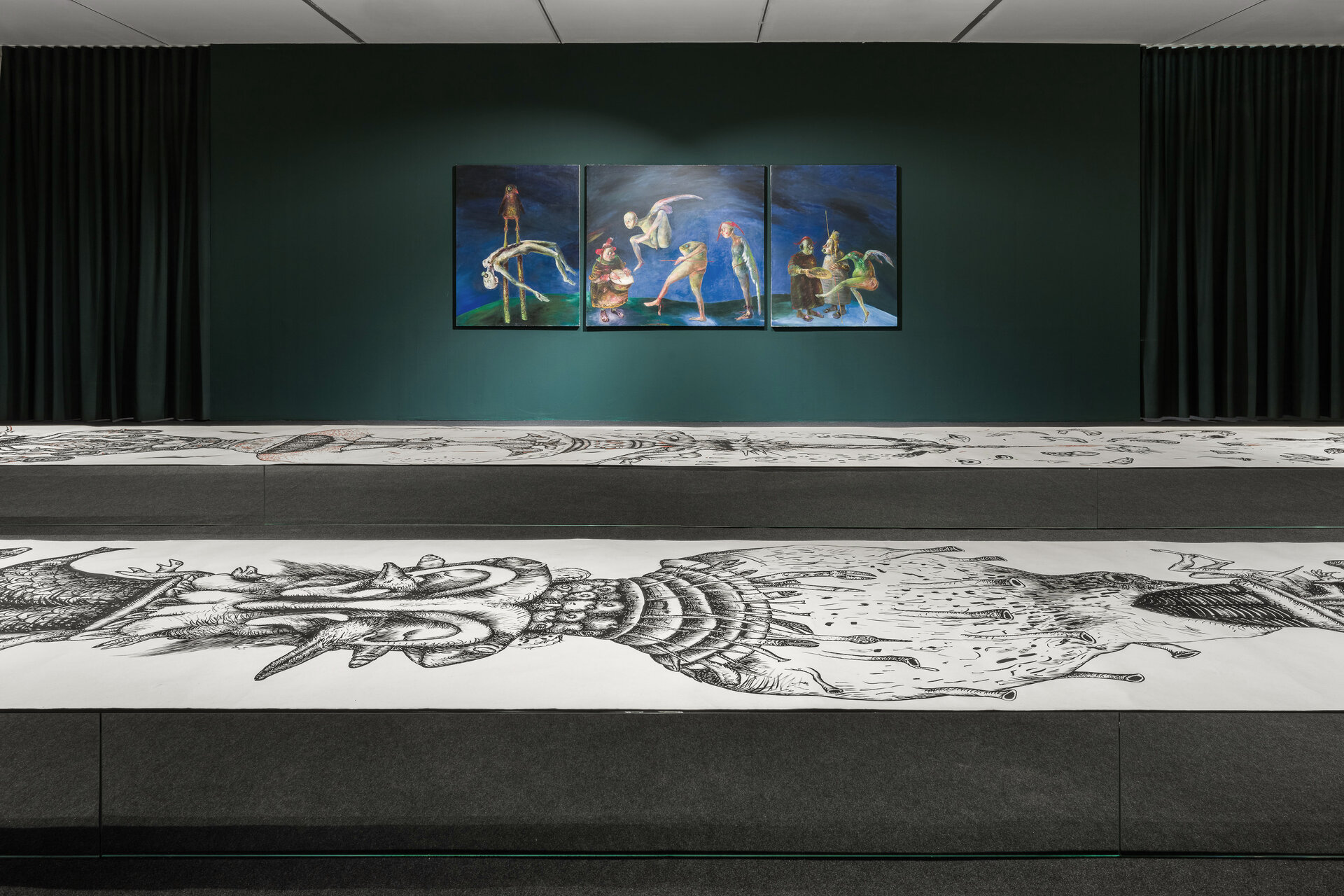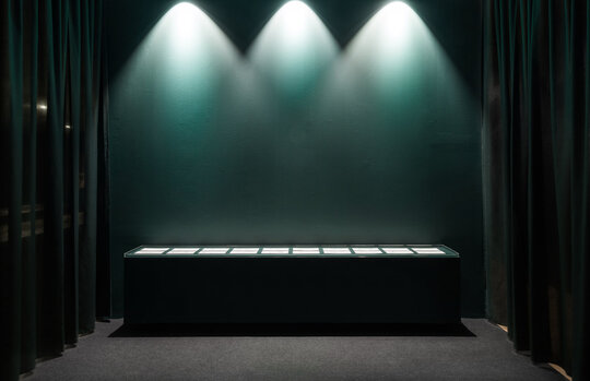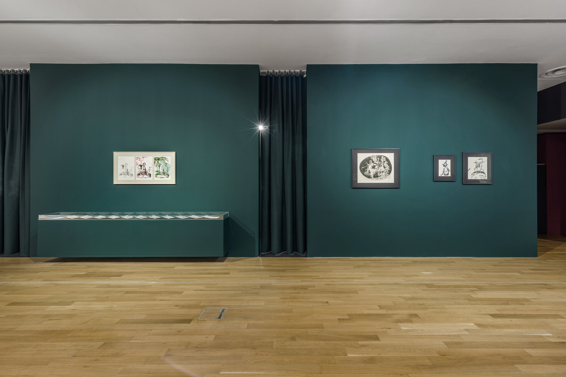 Spațiile din jur sunt acoperite cu tapet alb-negru, reprezentând momente semnificative pentru opera artistului și definind o atmosferă generală de introspecție.