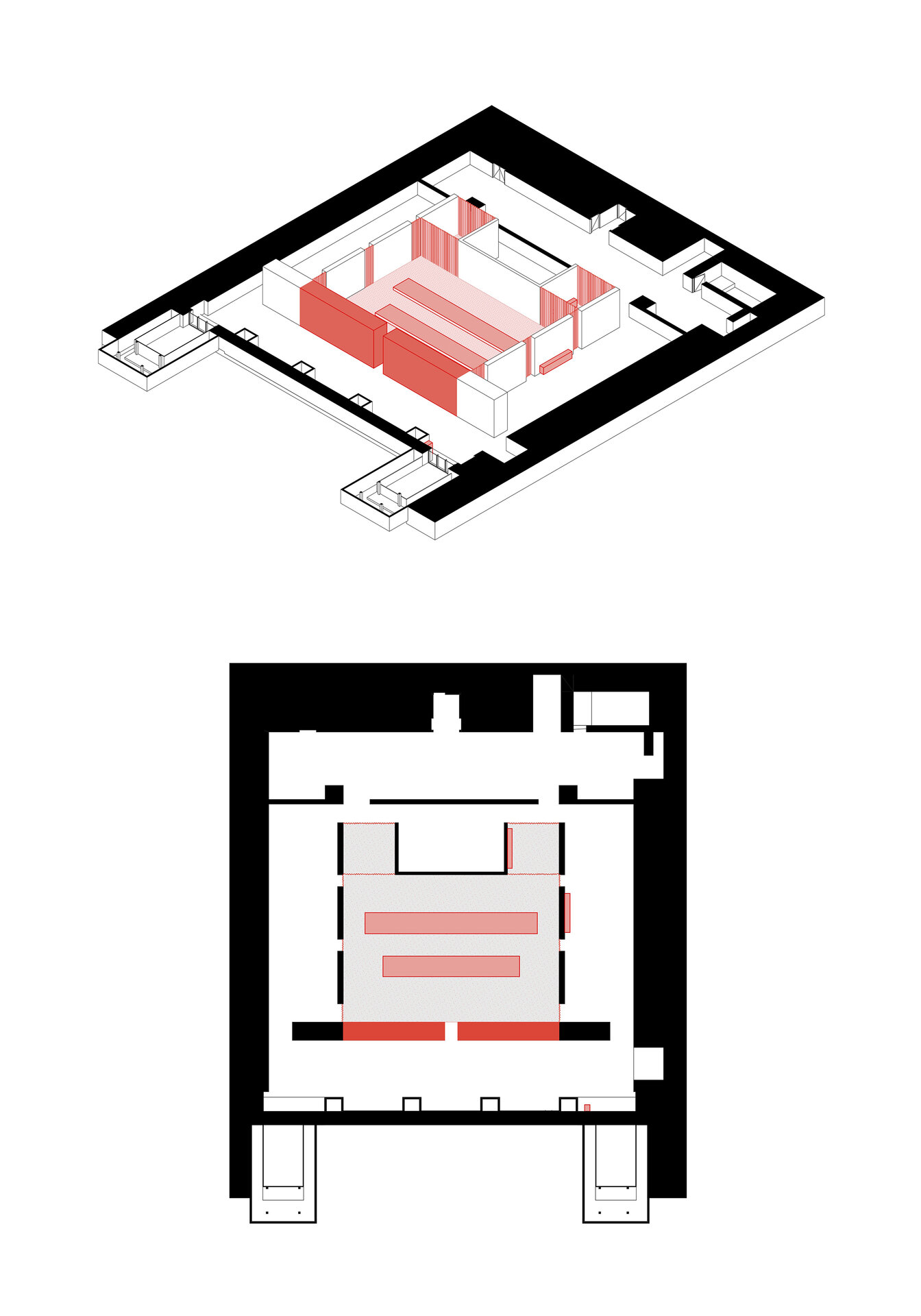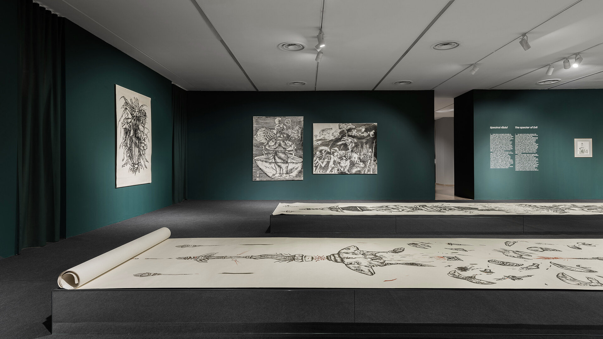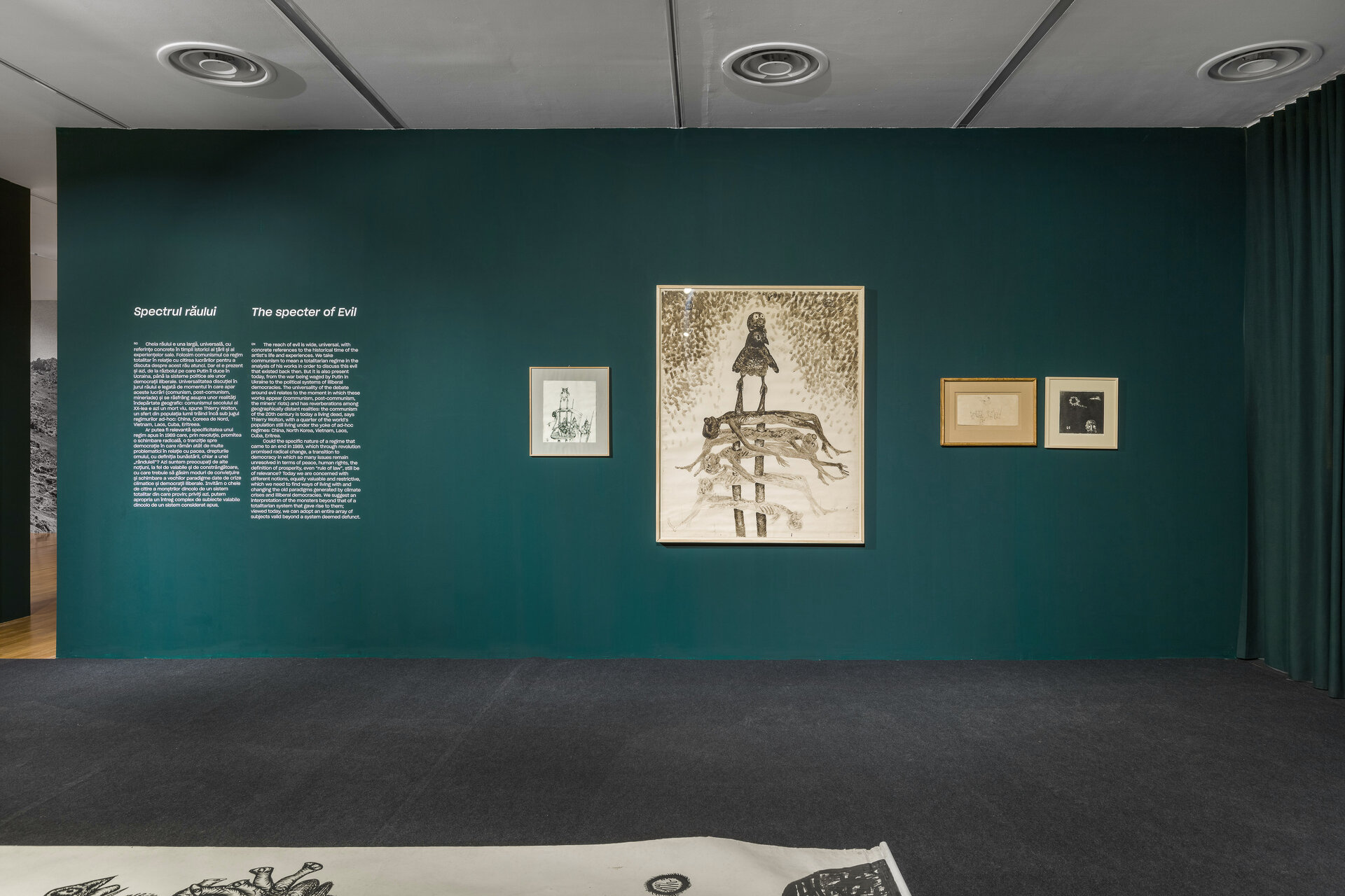 Bazat pe conceptul curatorial, intervenția arhitecturală urmărește capitolele tematice ale expoziției, creând un spațiu independent fiecăruia. Tema principală, Spectrul Răului este spațiul central al expoziției, de unde se poate ajunge spre spațiile fiecărei teme, organizate în jurul acestui mare volum verde închis. Pardoseala în această zonă este acoperită cu o mochetă închisă la culoare, care absoarbe zgomotul pașilor vizitatorilor, și care împreună cu oglinzile laterale ale podiumurilor de expunere, oferă o senzație de plutire.