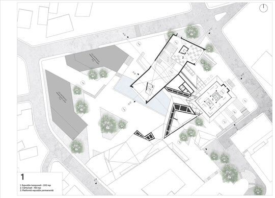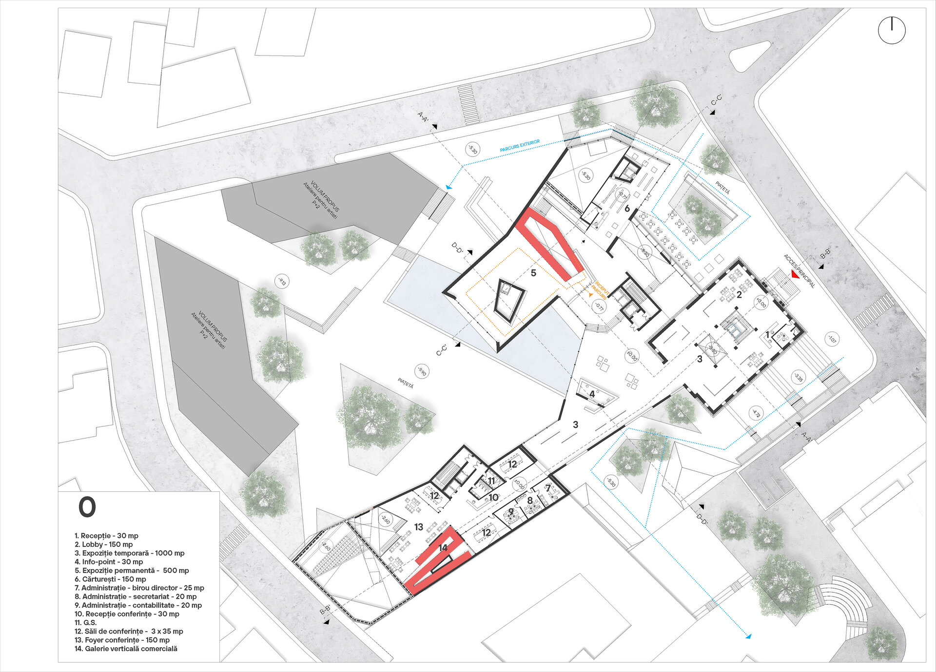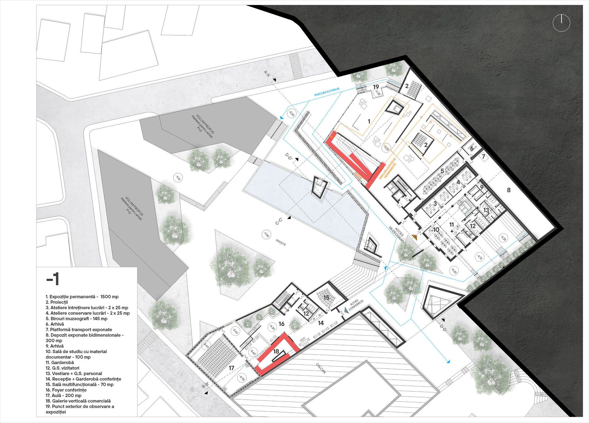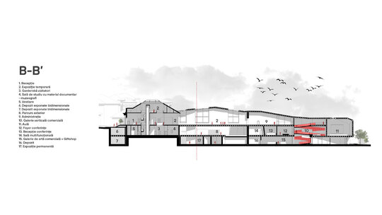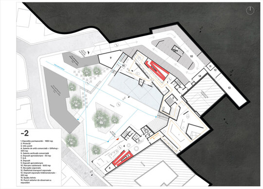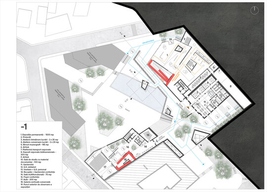 Accesul principal în muzeu se va realiza prin clădirea monument istoric, aceasta adăpostind totodată și zona destinată muzeografilor la un etaj inferior. Din zona de acces întâlnim două artere de circulație, una dintre ele îndreptându-se spre zona de expoziție, iar cealaltă spre zona de conferințe. Parcursul expoziției permanente coboară în subteran, ca la încheierea acestuia să revină în aceeași zonă din care a început, oferind posibilitatea de a se continua și în exterior, în cadrul piațetei create în inima sitului.
