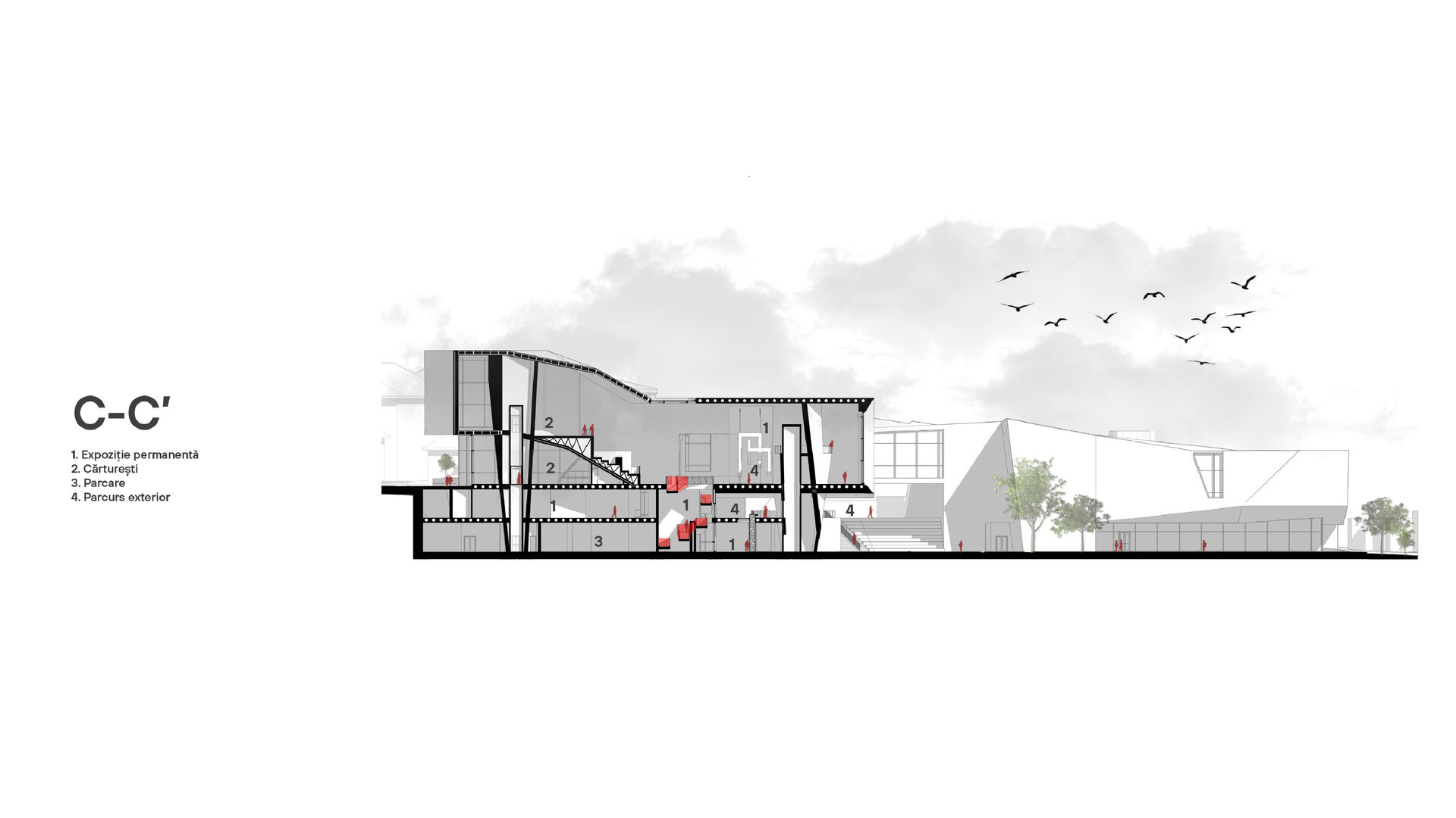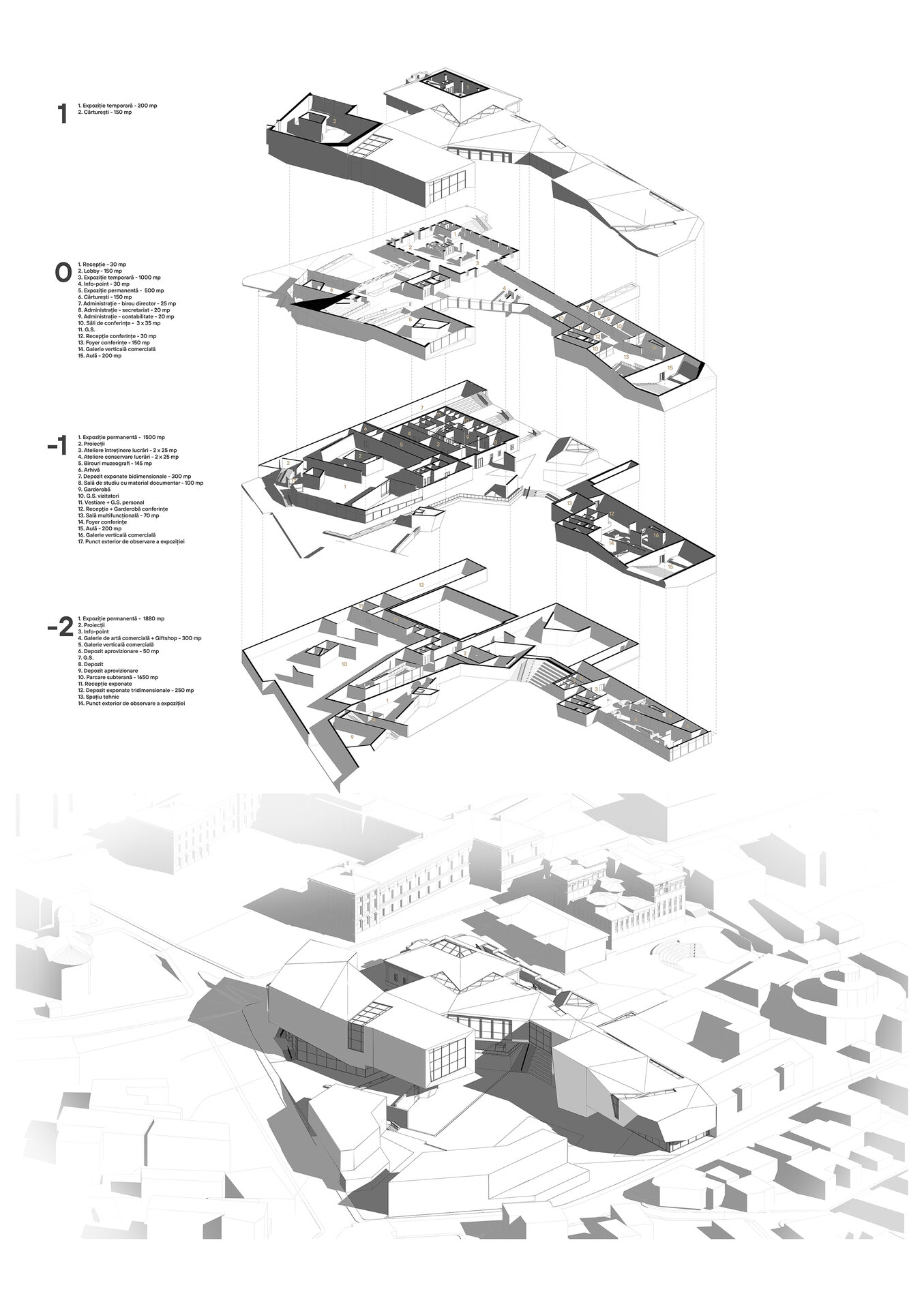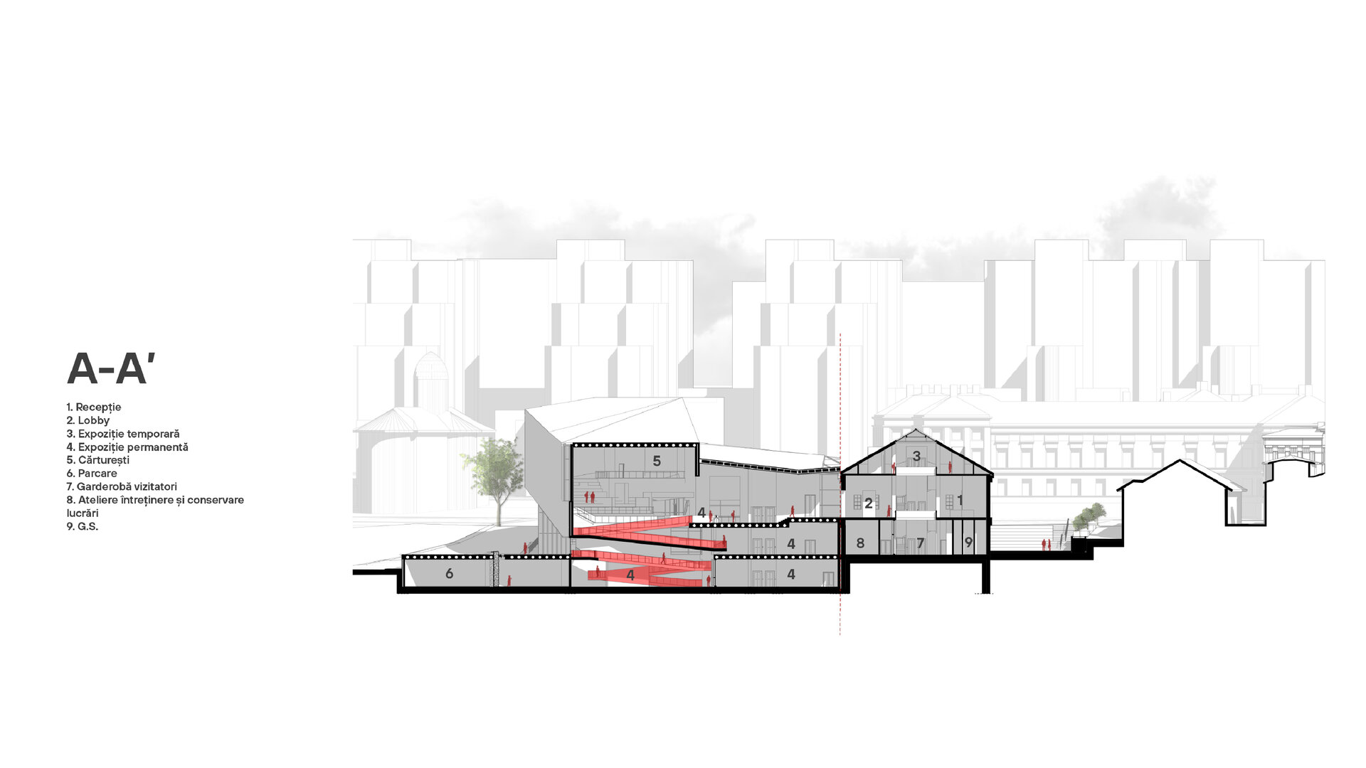 Accesul principal în muzeu se va realiza prin clădirea monument istoric, aceasta adăpostind totodată și zona destinată muzeografilor la un etaj inferior. Din zona de acces întâlnim două artere de circulație, una dintre ele îndreptându-se spre zona de expoziție, iar cealaltă spre zona de conferințe. Parcursul expoziției permanente coboară în subteran, ca la încheierea acestuia să revină în aceeași zonă din care a început, oferind posibilitatea de a se continua și în exterior, în cadrul piațetei create în inima sitului.