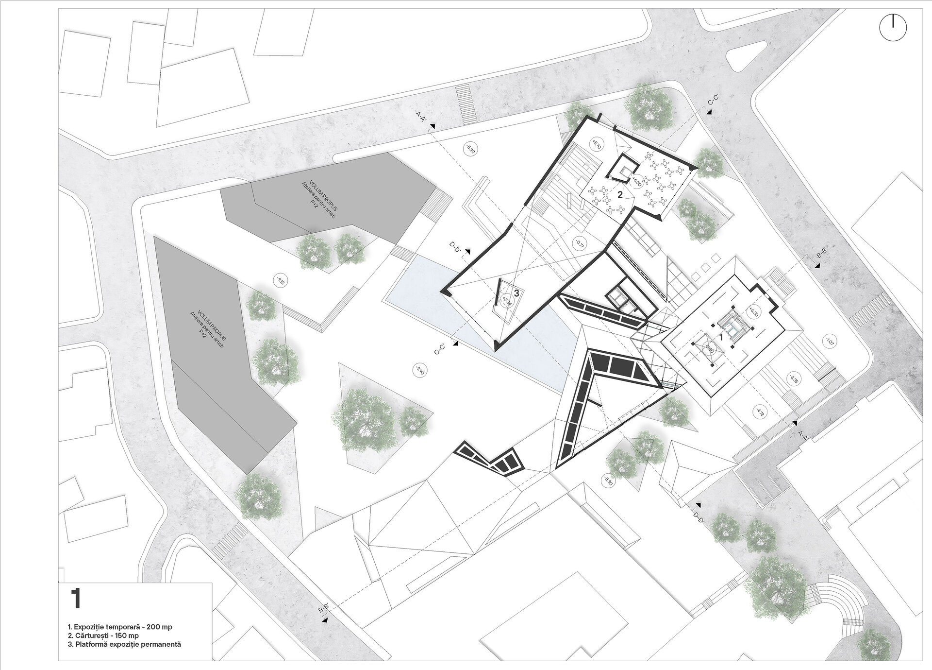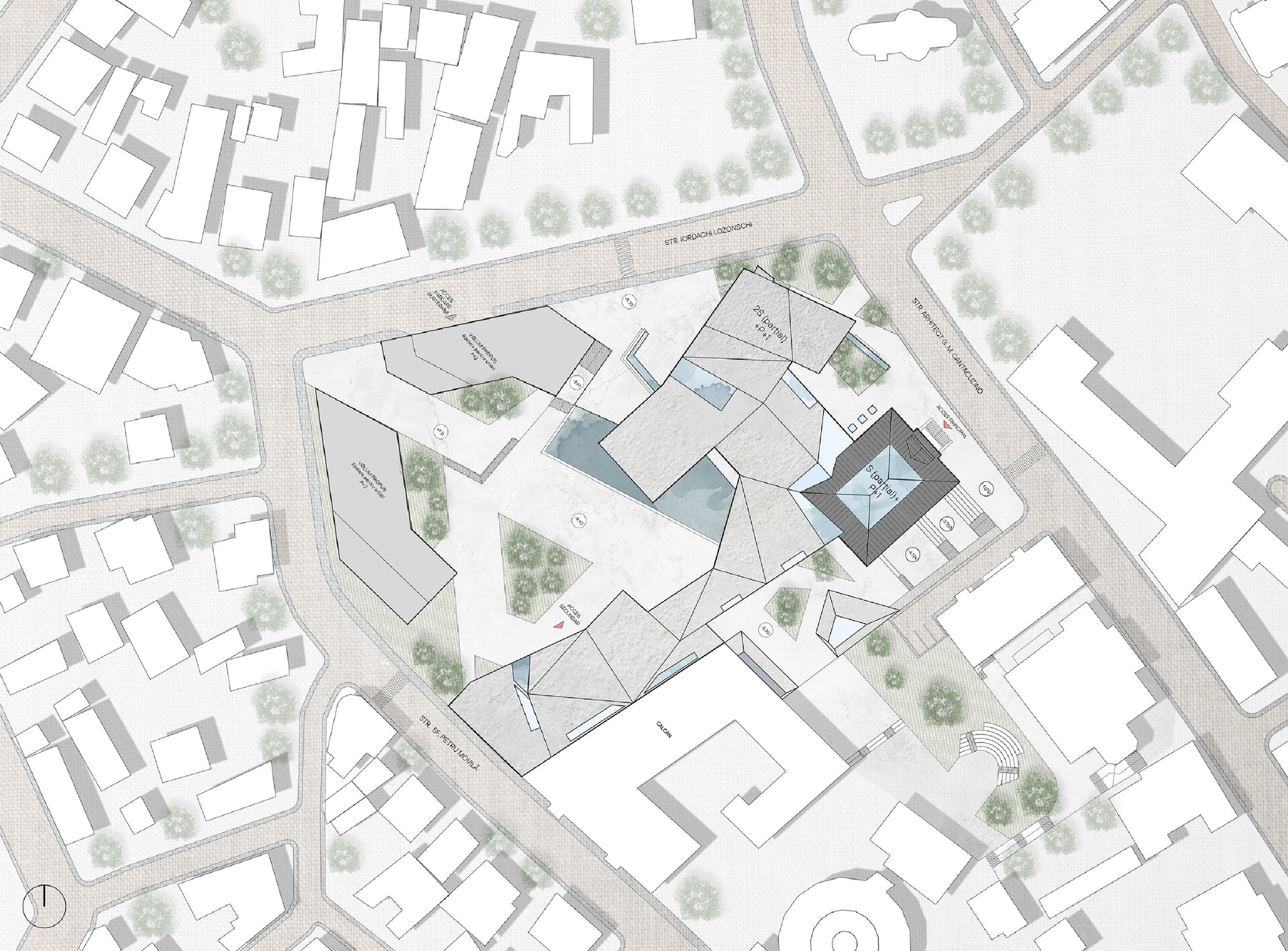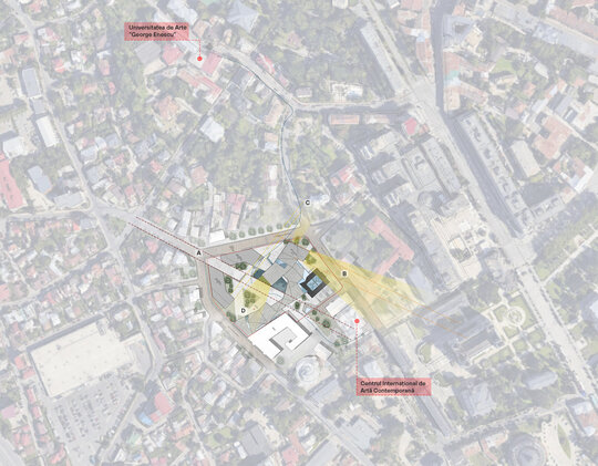 Axele principale de compoziție sunt date de elementele de importanță ridicată din zonă, așadar, am creat o deschidere dinspre strada Sf. Petru Movilă pe directia Centrului Internațional de Artă Contemporană [A], îndreptarea volumului către Mitropolie și Palatul Culturii [B] și crearea unui pietonal al cărui ax se incheie cu Biserica Sf. Gheorghe Lozonschi [C].