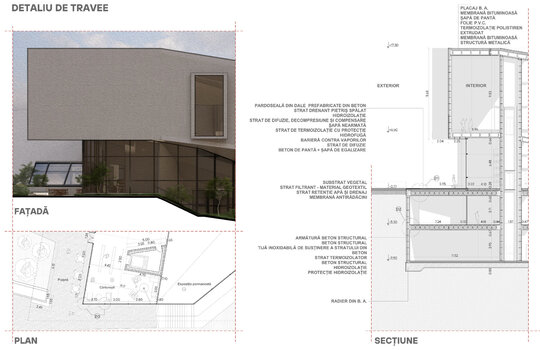 Atât zona comercială, cât și cea de conferințe sunt animate de o galerie verticală adiacentă calcanului, luminată natural de sus, legând spațiile armonios.