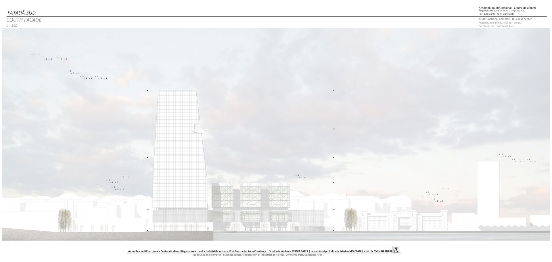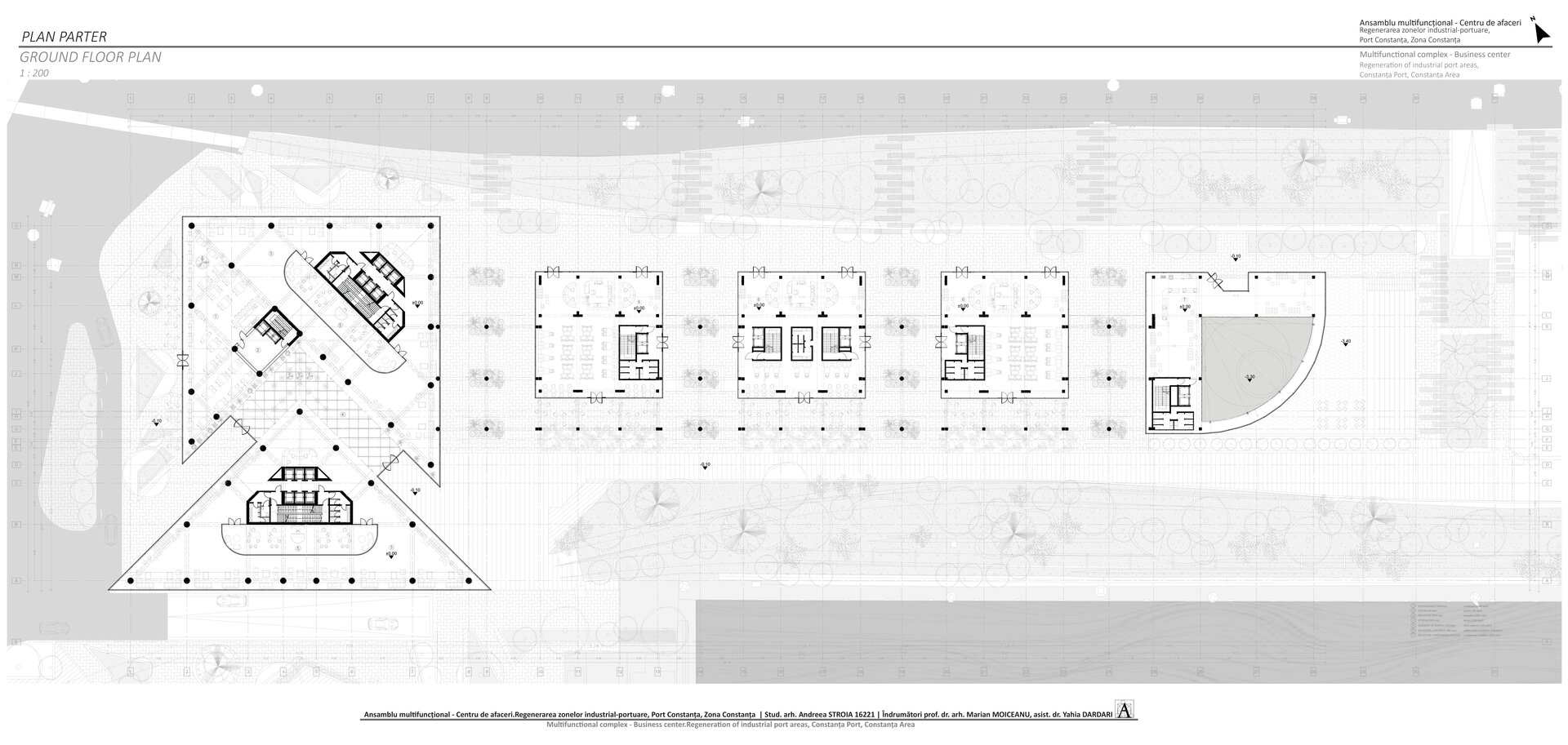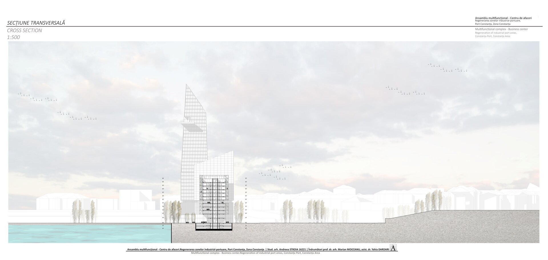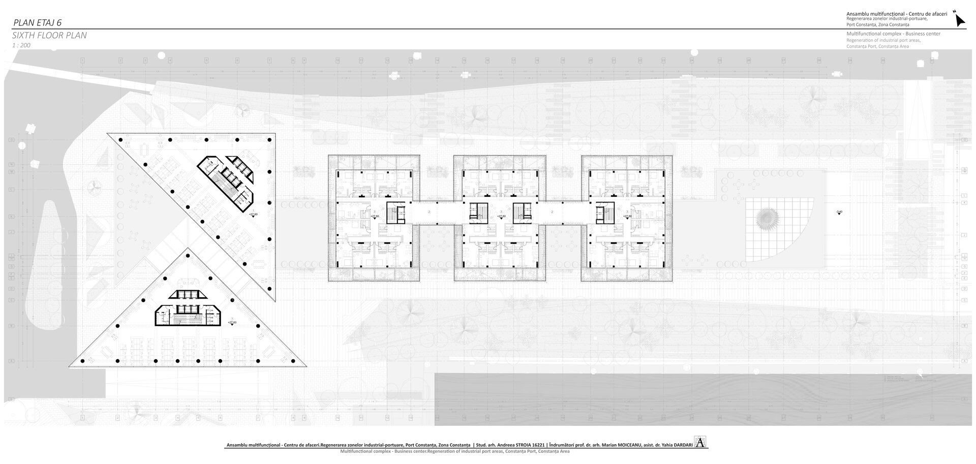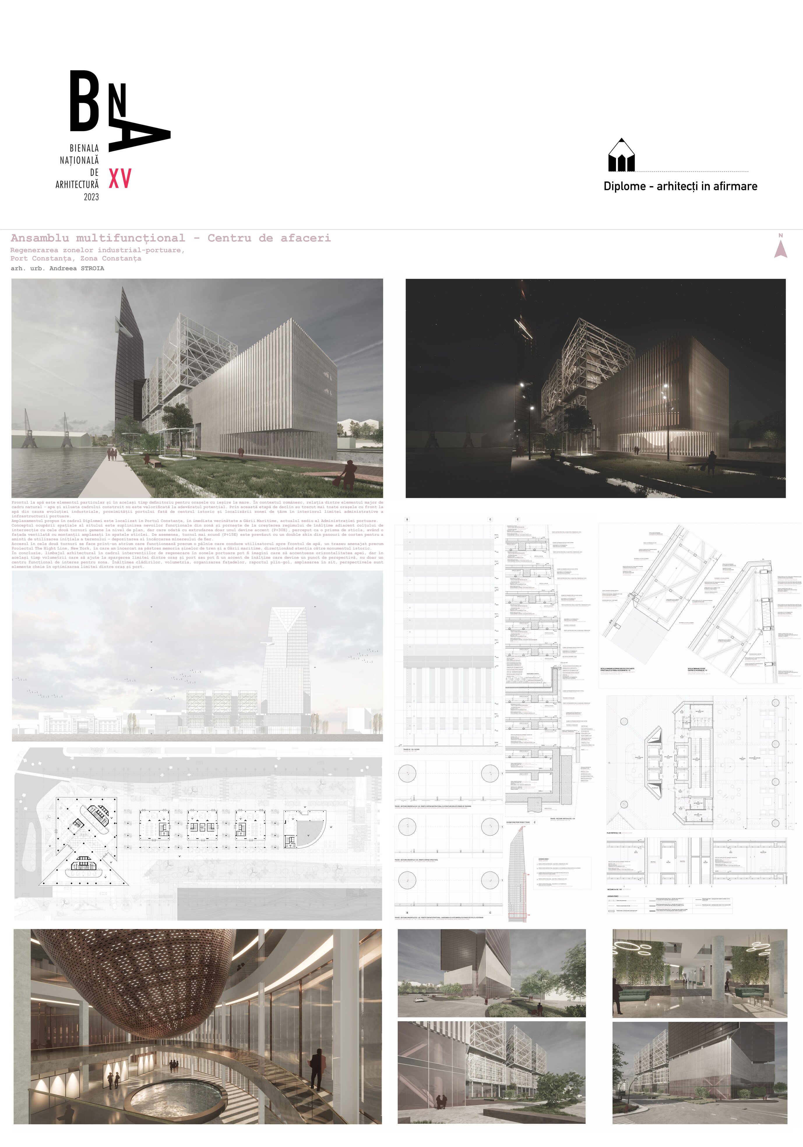 Accesul în cele două turnuri se face print-un atrium care funcționează precum o pâlnie care conduce utilizatorul spre frontul de apă, un traseu amenajat precum Proiectul The Hight Line, New York, în care am încercat sa păstrez memoria șinelor de tren și a Gării maritime, direcționând atenția spre monumentul istoric.