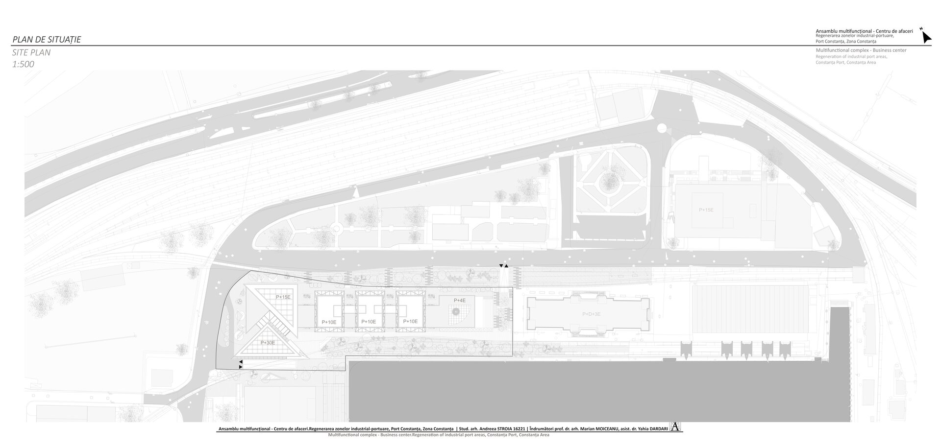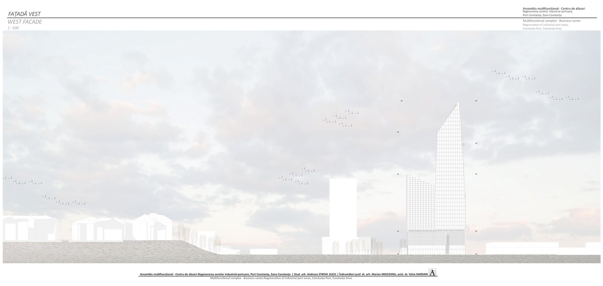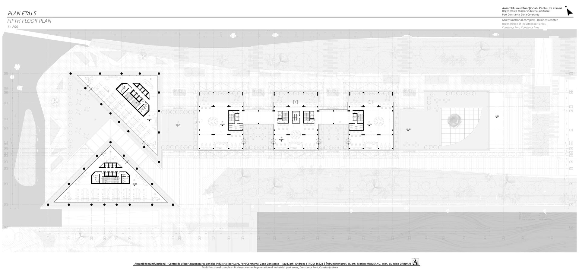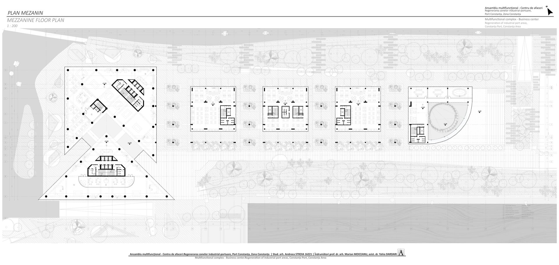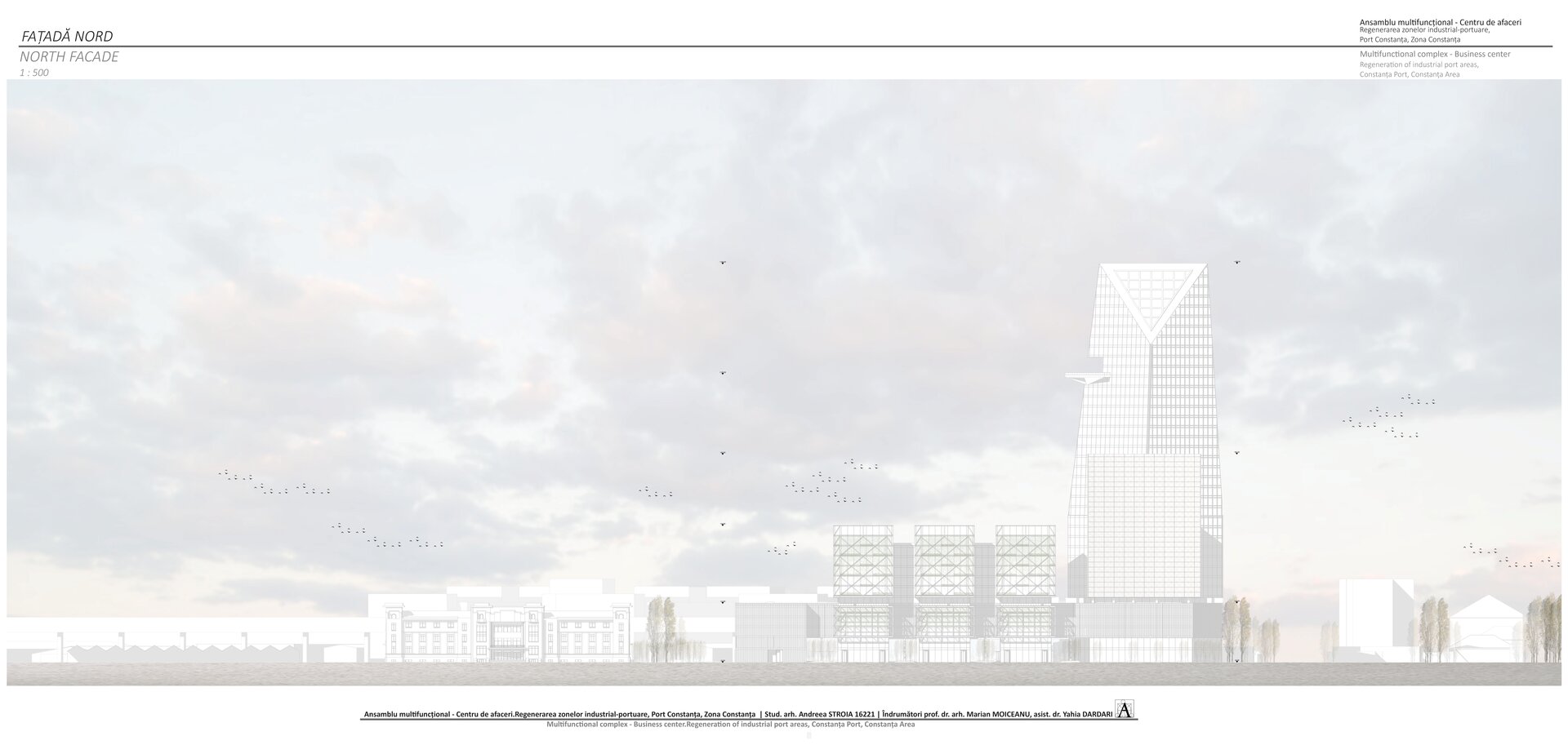 Accesul în cele două turnuri se face print-un atrium care funcționează precum o pâlnie care conduce utilizatorul spre frontul de apă, un traseu amenajat precum Proiectul The Hight Line, New York, în care am încercat sa păstrez memoria șinelor de tren și a Gării maritime, direcționând atenția spre monumentul istoric.