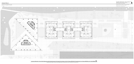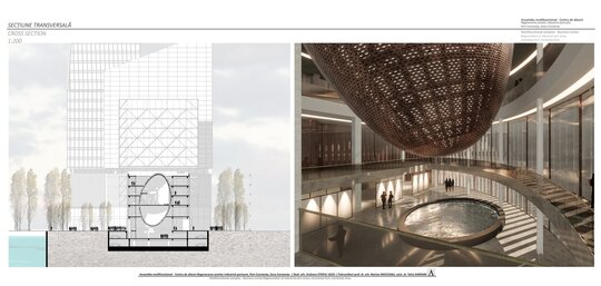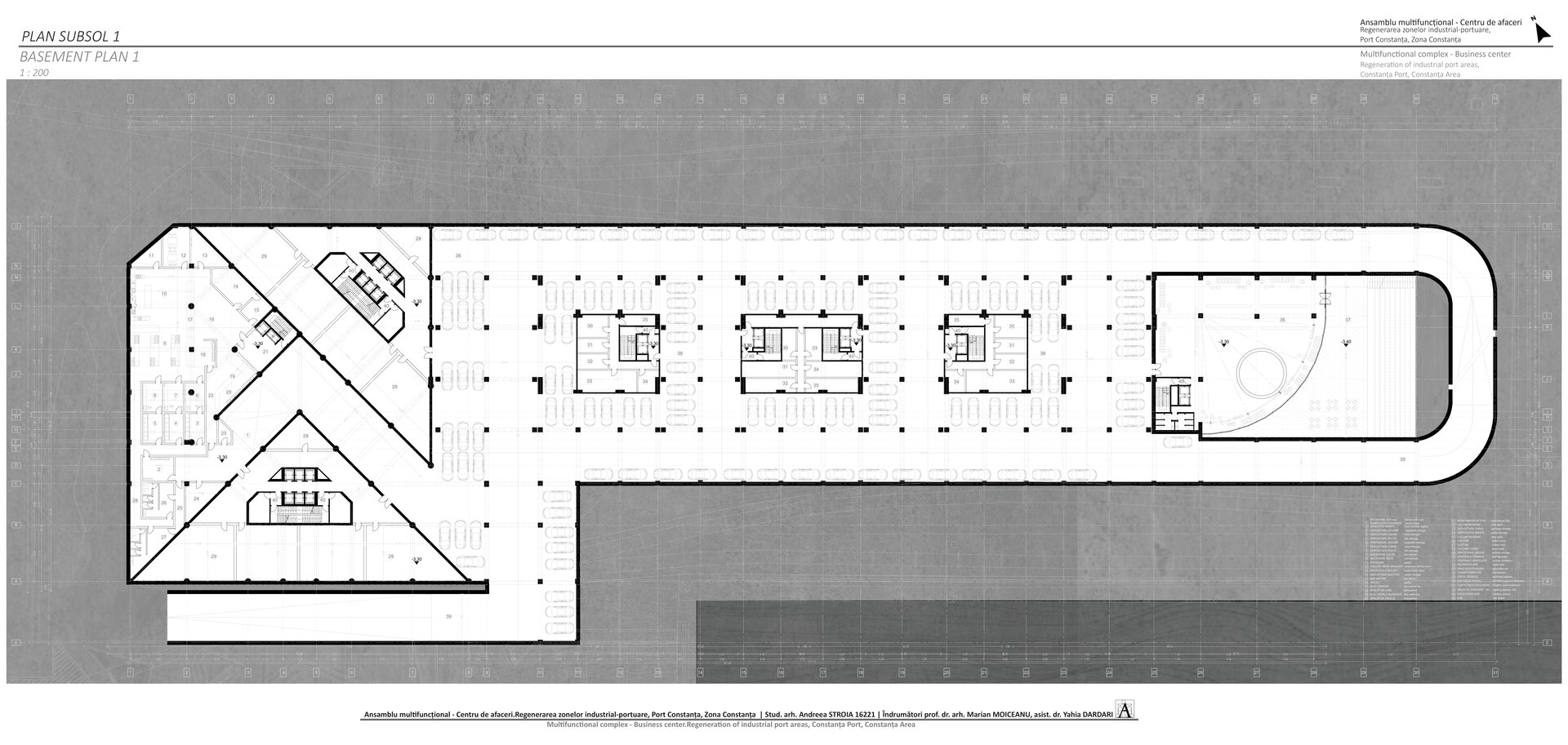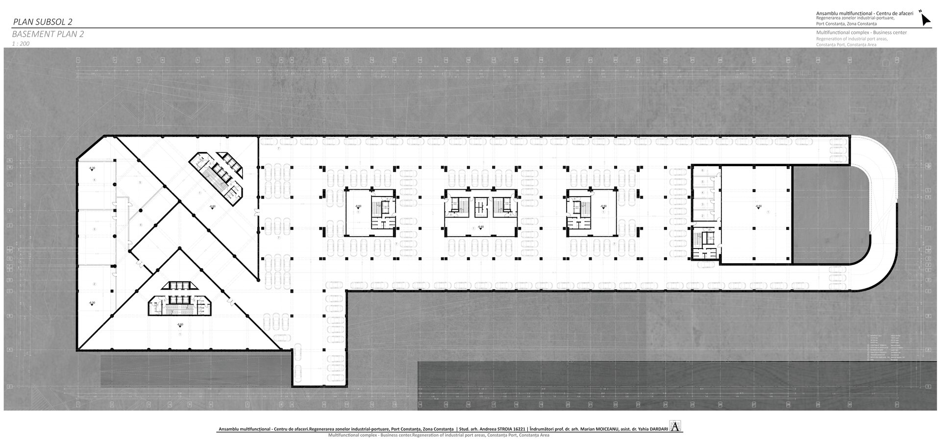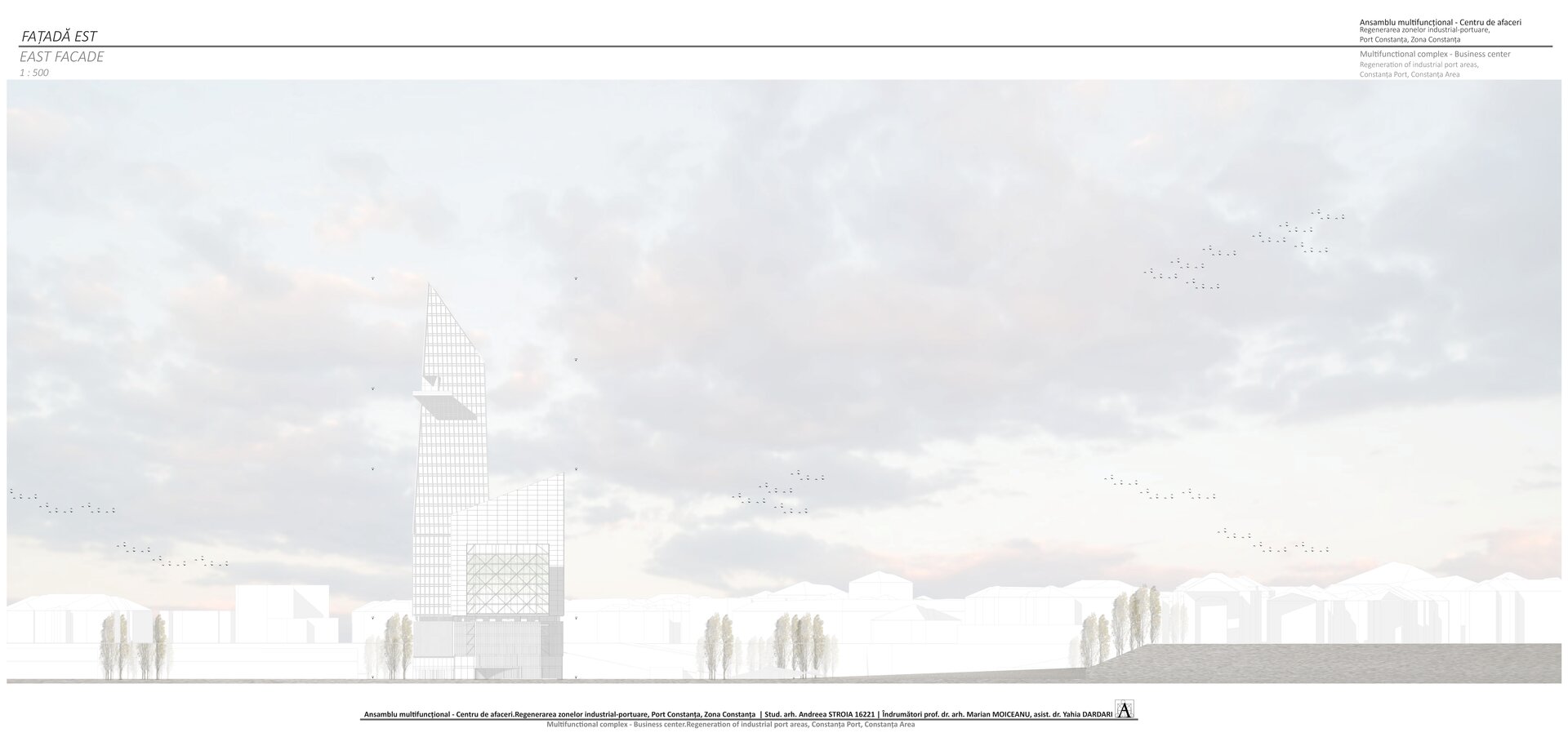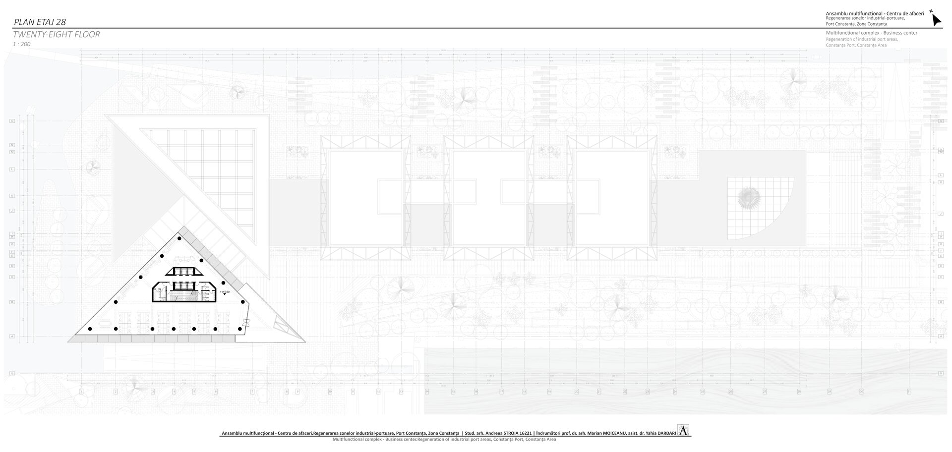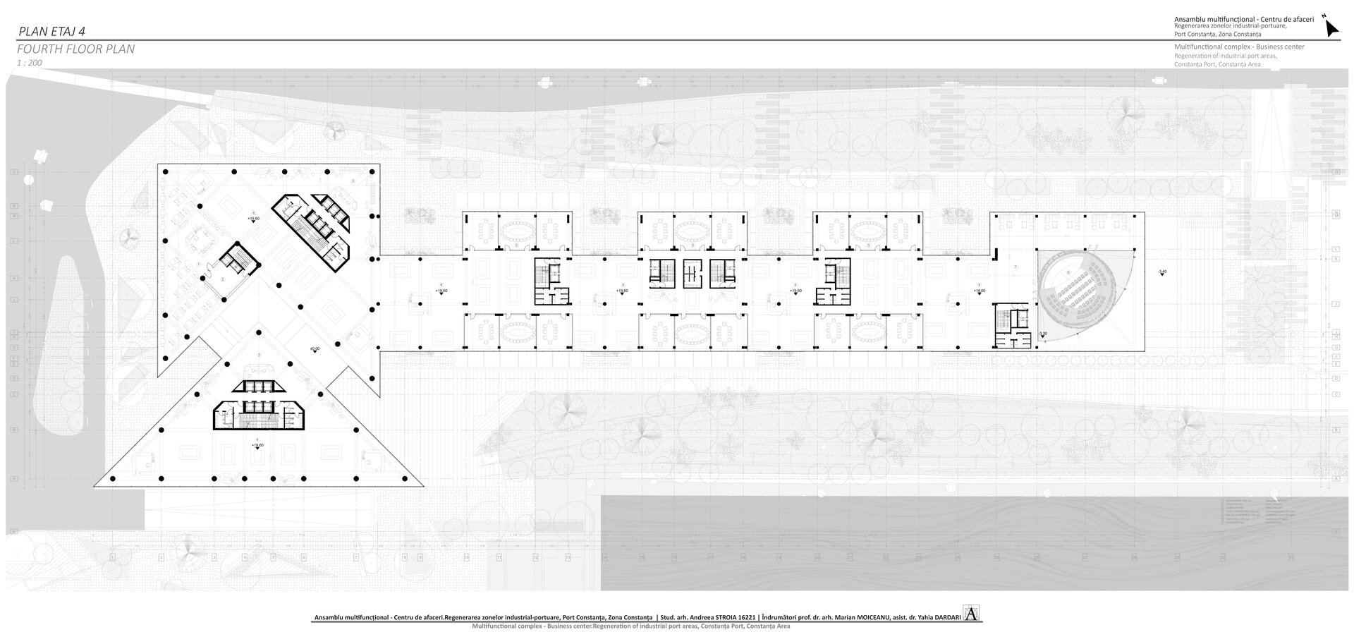 Accesul în cele două turnuri se face print-un atrium care funcționează precum o pâlnie care conduce utilizatorul spre frontul de apă, un traseu amenajat precum Proiectul The Hight Line, New York, în care am încercat sa păstrez memoria șinelor de tren și a Gării maritime, direcționând atenția spre monumentul istoric.