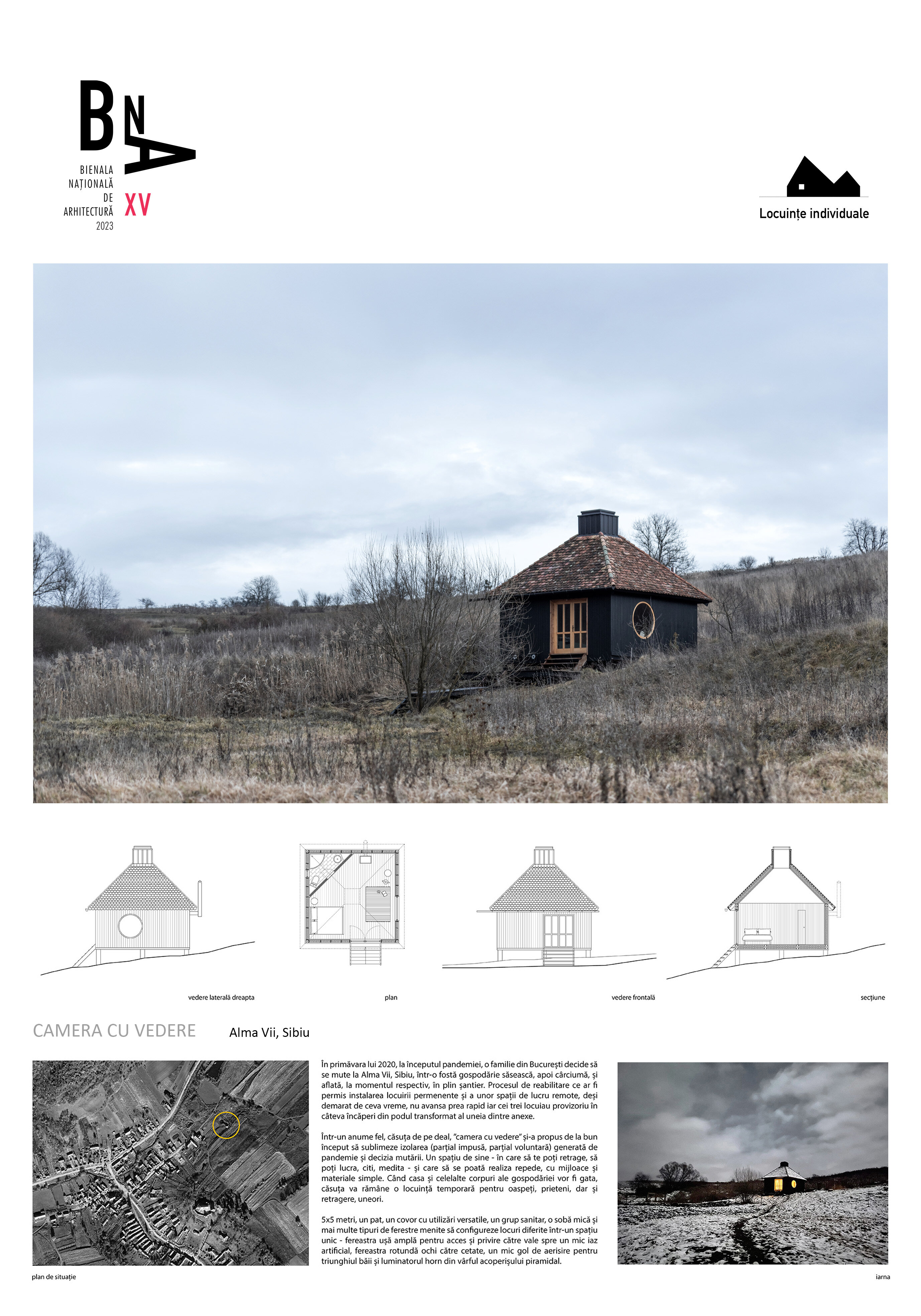Într-un anume fel, căsuța de pe deal, "camera cu vedere" și-a propus de la bun început să sublimeze izolarea (parțial impusă, parțial voluntară) generată de pandemie și decizia mutării. Un spațiu de sine - în care să te poți retrage, să poți lucra, citi, medita - și care să se poată realiza repede, cu mijloace și materiale simple. Când casa și celelalte corpuri ale gospodăriei vor fi gata, căsuța va rămâne o locuință temporară pentru oaspeți, prieteni, dar și retragere, uneori.