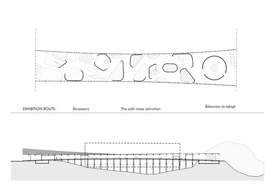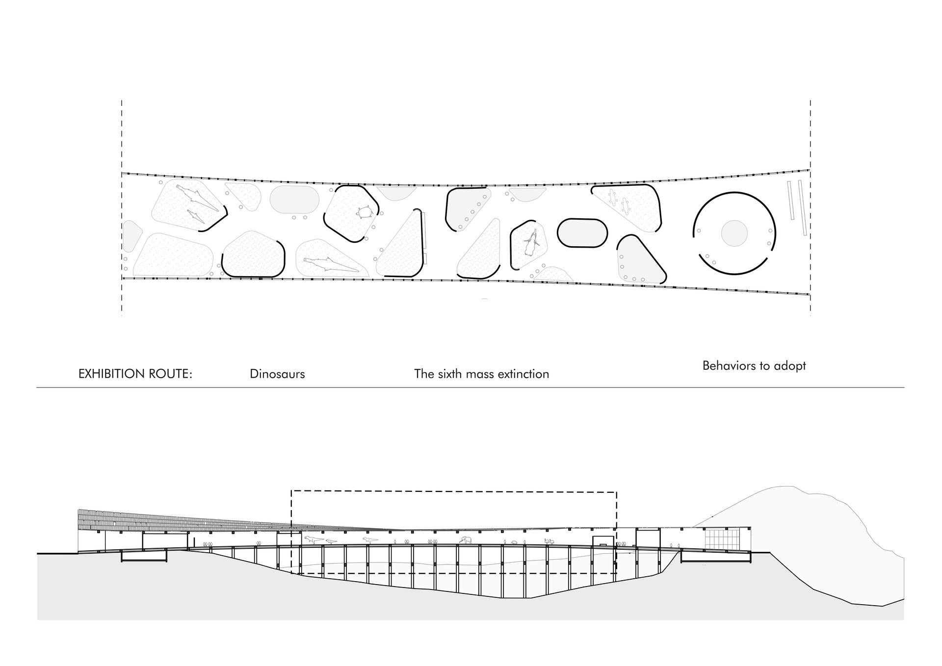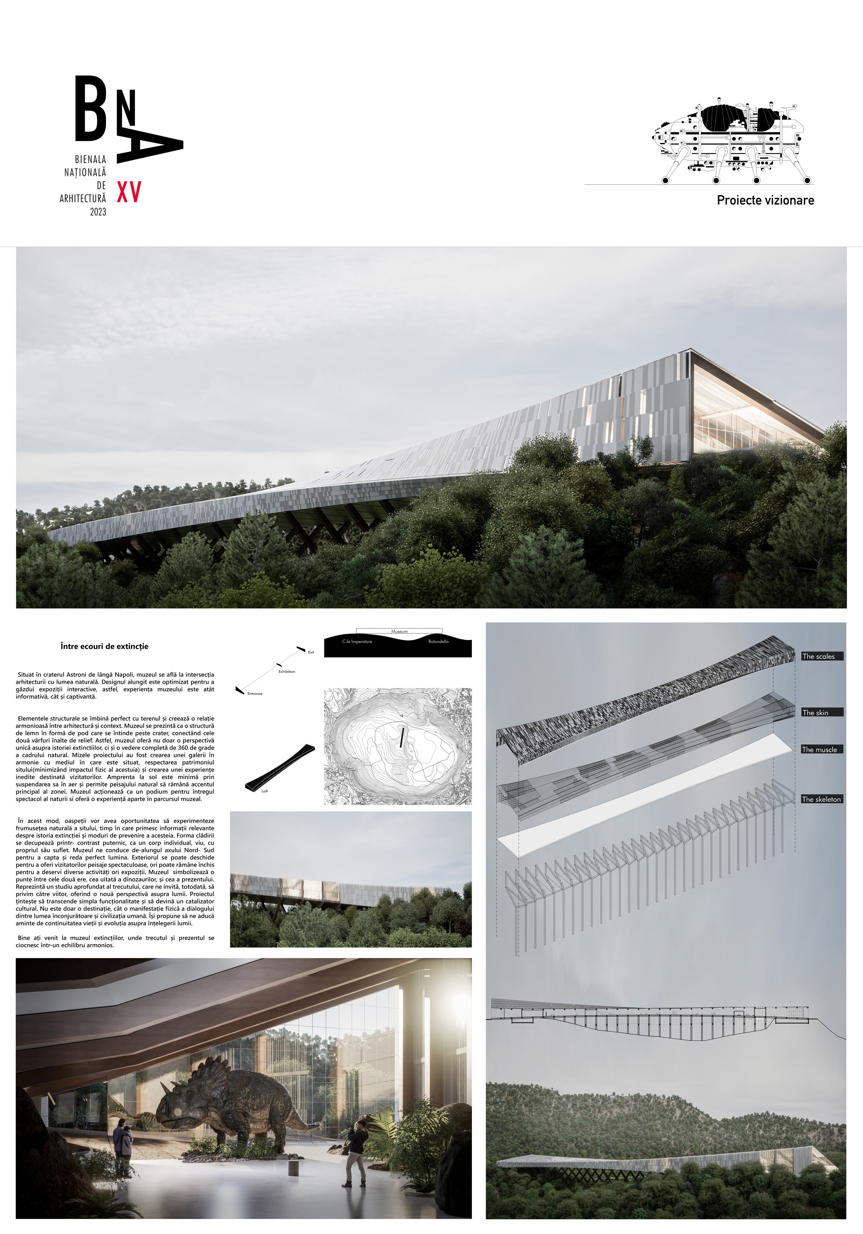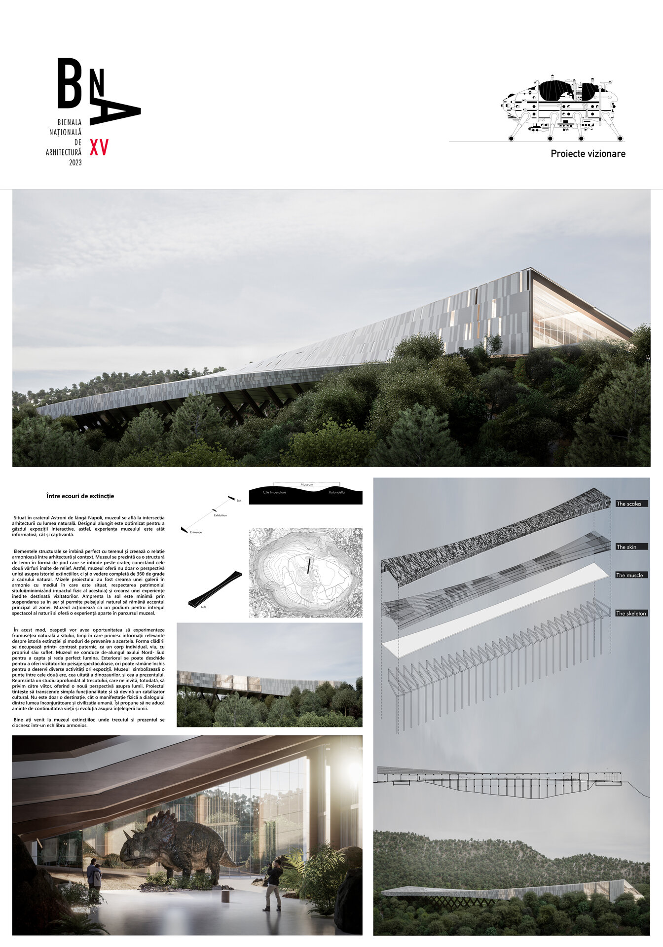 În acest mod, oaspeții vor avea oportunitatea să experimenteze frumusețea naturală a sitului, timp în care primesc informații relevante despre istoria extincției și moduri de prevenire a acesteia. Forma clădirii se decupează printr- contrast puternic, ca un corp individual, viu, cu propriul său suflet. Muzeul ne conduce de-alungul axului Nord- Sud pentru a capta și reda perfect lumina. Exteriorul se poate deschide pentru a oferi vizitatorilor peisaje spectaculoase, ori poate rămâne închis pentru a deservi diverse activități ori expoziții. Muzeul simbolizează o punte între cele două ere, cea uitată a dinozaurilor, și cea a prezentului. Reprezintă un studiu aprofundat al trecutului, care ne invită, totodată, să privim către viitor, oferind o nouă perspectivă asupra lumii. Proiectul țintește să transcende simpla funcționalitate și să devină un catalizator cultural. Nu este doar o destinație, cât o manifestație fizică a dialogului dintre lumea înconjurătoare și civilizația umană. Își propune să ne aducă aminte de continuitatea vieții și evoluția asupra înțelegerii lumii. Bine ați venit la muzeul extincțiilor, unde trecutul și prezentul se ciocnesc într-un echilibru armonios.