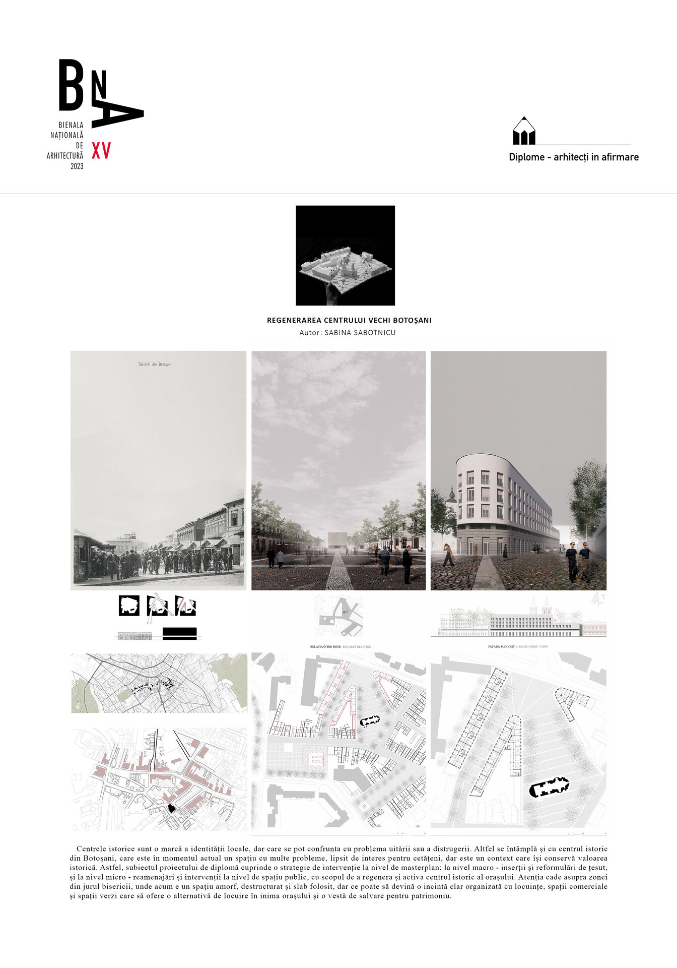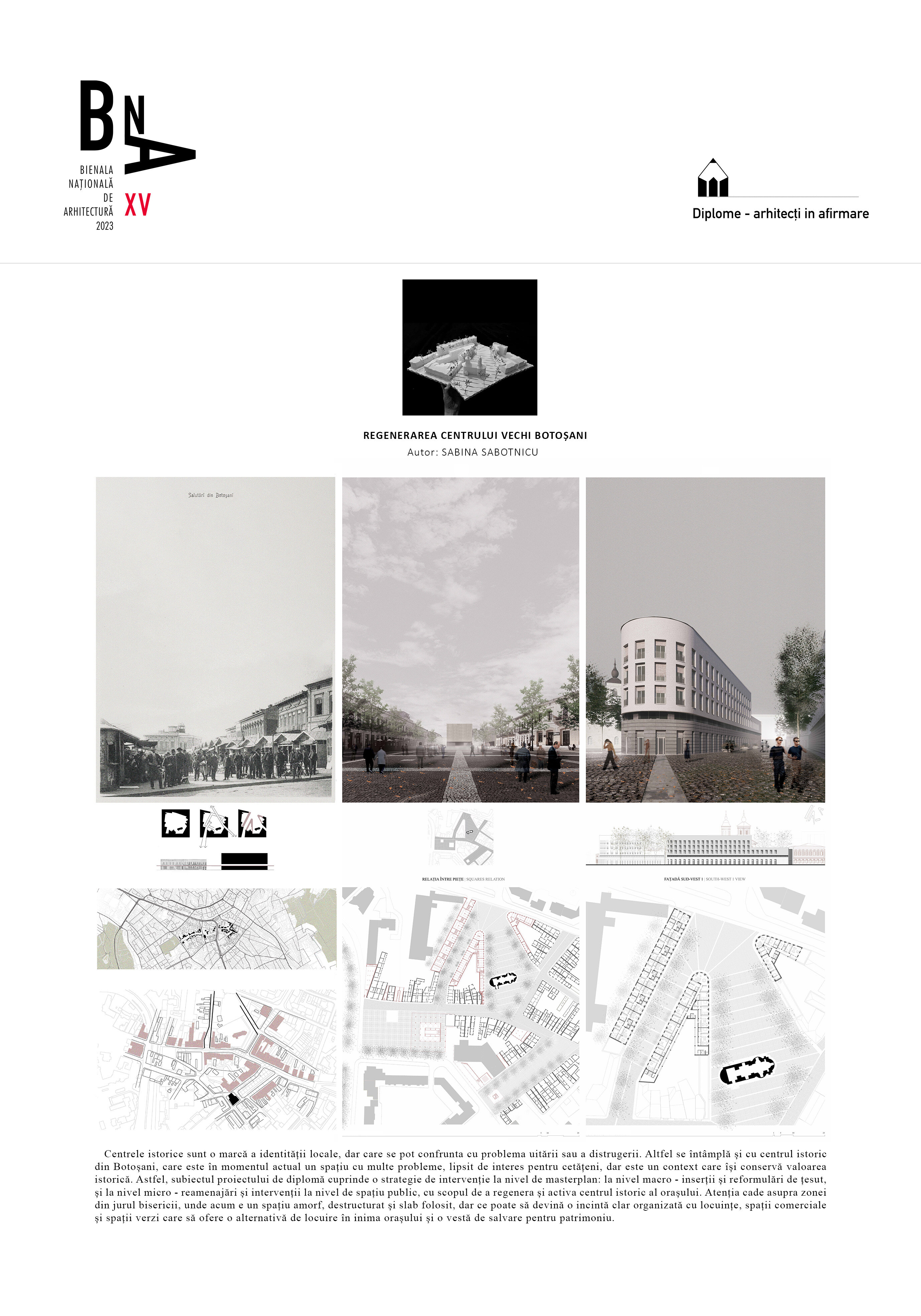 Centrele istorice sunt o marcă a identității locale, dar care se pot confrunta cu problema uitării sau a distrugerii. Astfel se întâmplă și cu centrul istoric din Botoșani, care este în momentul actual un spațiu cu multe probleme, lipsit de interes pentru cetățeni, dar este un context care își conservă valoarea istorică. Subiectul proiectului de diplomă cuprinde o strategie de intervenție la nivel de masterplan: la nivel macro - inserții și reformulări de țesut, și la nivel micro - reamenajări și intervenții la nivel de spațiu public, cu scopul de a regenera și activa centrul istoric al orașului. Atenția cade asupra zonei din jurul bisericii, unde acum e un spațiu amorf, destructurat și slab folosit, dar care poate să devină o incintă clar organizată cu locuințe, spații comerciale și spații verzi care să ofere o alternativă de locuire în inima orașului și o vestă de salvare pentru patrimoniu.