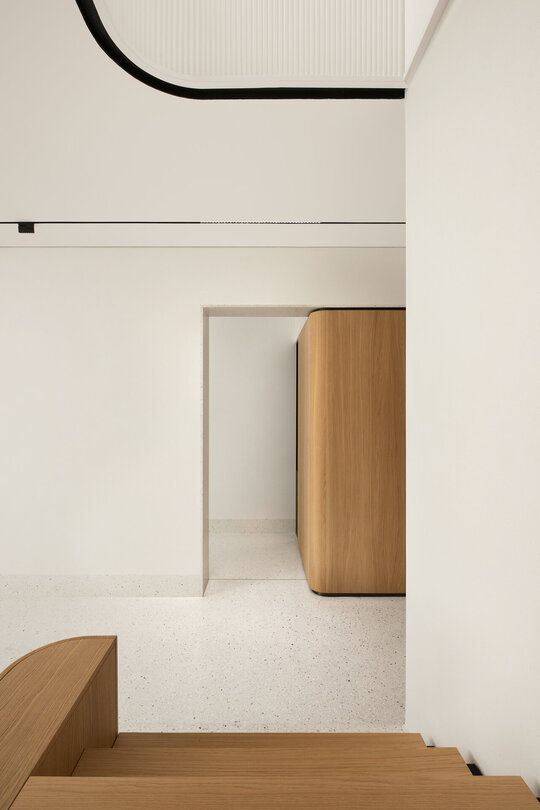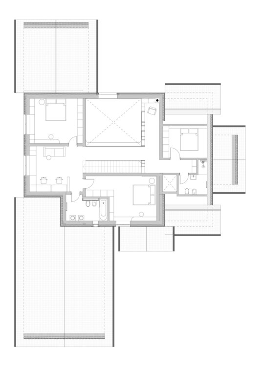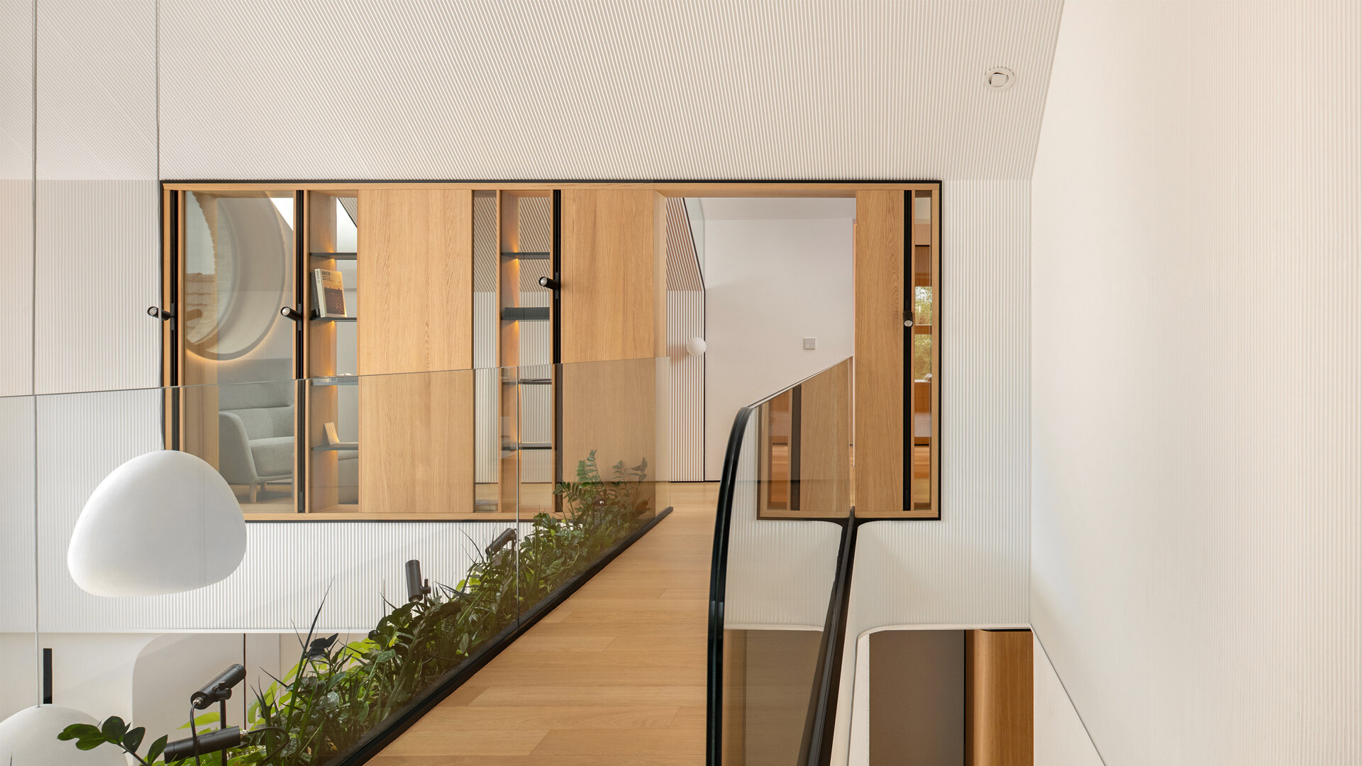Provocarea principală a proiectului a fost găsirea unui limbaj arhitectural care să negocieze orizontalitatea parterului cu verticalitatea salonului central. La început perceput mai degrabă ca un loc al tranziției, acesta a fost transformat într-un loc al conexiunii, al studiului și al reveriei prin intermediul unui element concentrator: un obiect alb texturat de formă arhetipală, în care poți urca, perforat de un „ochi” dedicat soarelui, ce plutește detașat de structură, deasupra salonului central, și care acționează ca un fundal scenografic dedicat jocului luminii și al umbrelor. „Casa plutitoare” devine astfel o entitate separată care comunică cu parterul: un loc al observării, ce exprimă vizual trecerea timpului, invită natura la interior și conferă o scară mai echilibrată salonului. Ea adăpostește lumea copilăriei, a studiului și a vieții lipsite de griji.