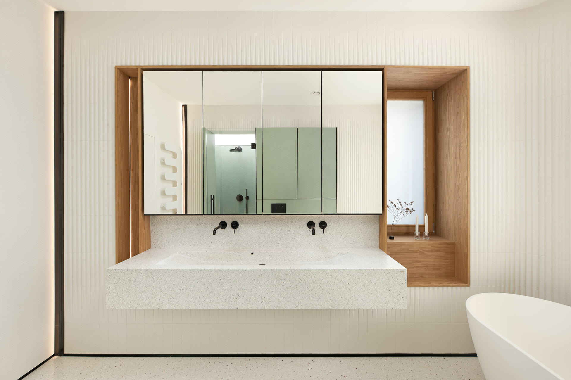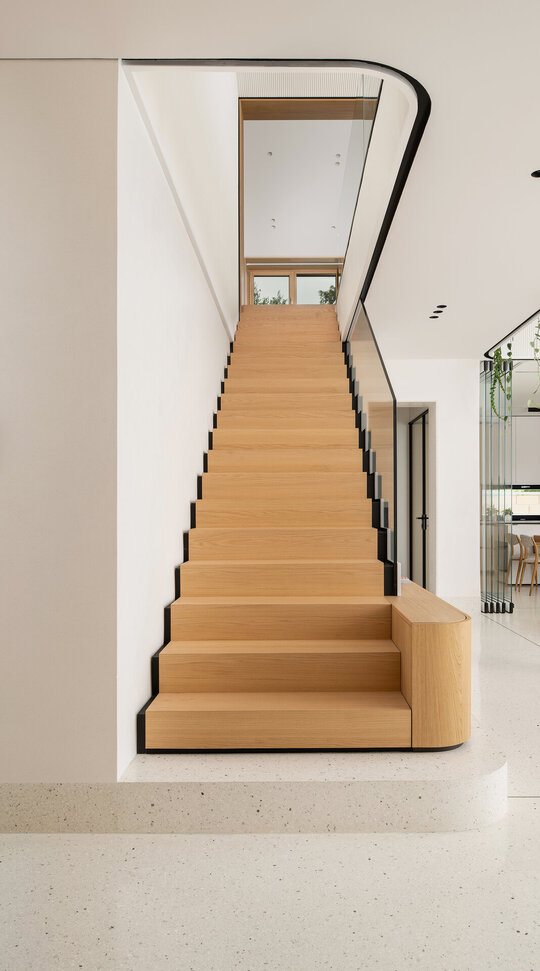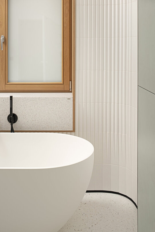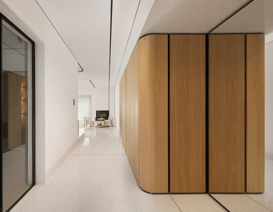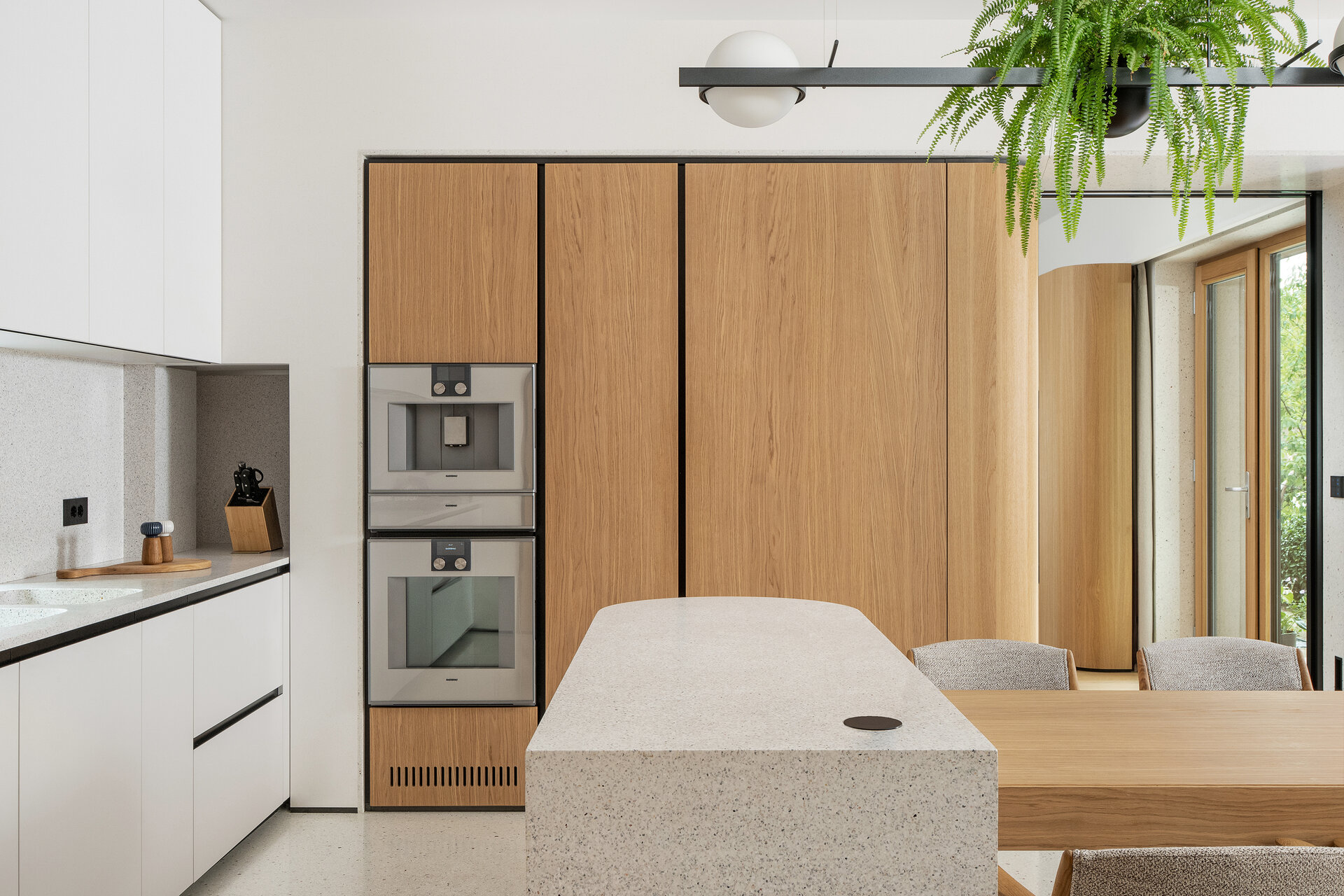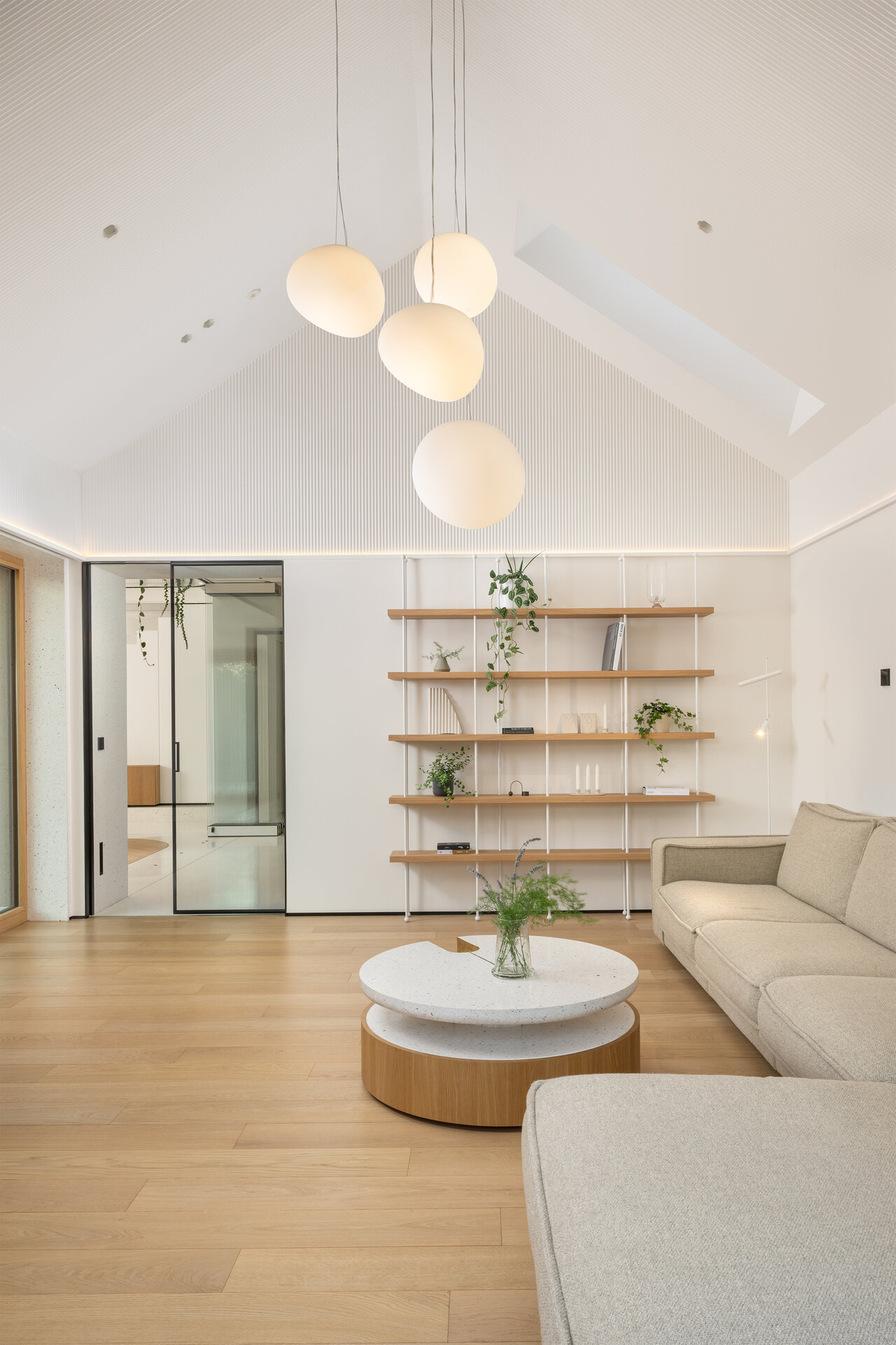 Caracterul vibrat și materialitatea „cojilor plutitoare” din casă nu își trag rădăcina doar din rațiuni estetice; ele potențează și completează sistemul radiant de răcire cu apă integrat în tavane. Corelarea și conlucrarea între disciplinele implicate în execuție au fost esențiale pentru integrarea subtilă a tuturor sistemelor de automatizare, a iluminatului artificial, a ventilației centralizate cu recuperare de căldură și pentru gestionarea atentă a detaliilor ce țin de etanșeitate și eficiență energetică – fără ca acestea să devină o prezență incongruentă cu linia estetică a proiectului și cu manualitatea tehnicilor tradiționale de lucru utilizate