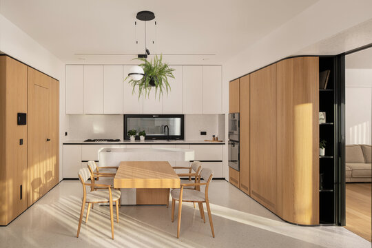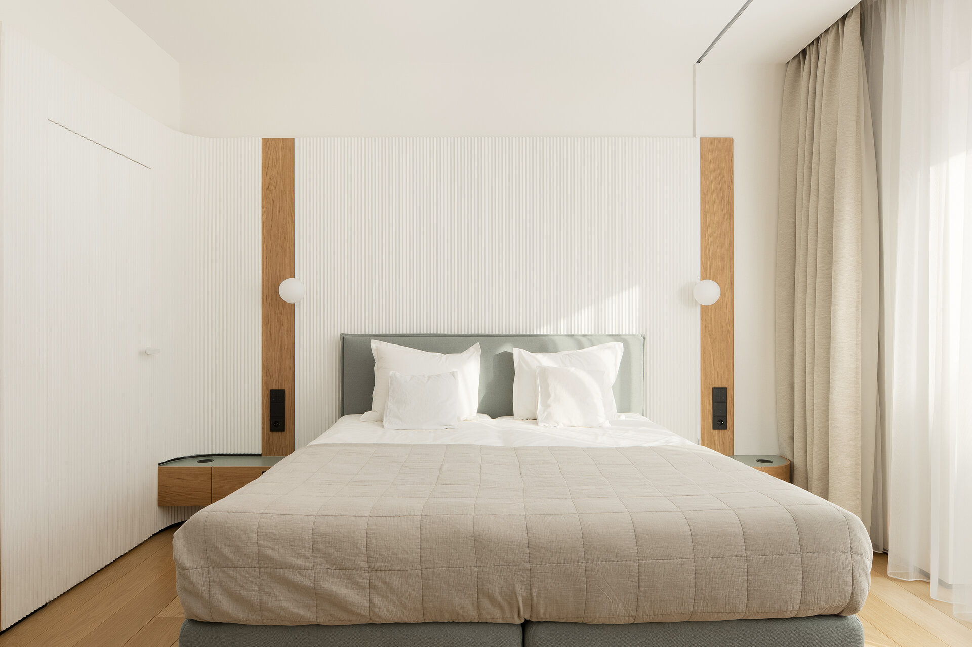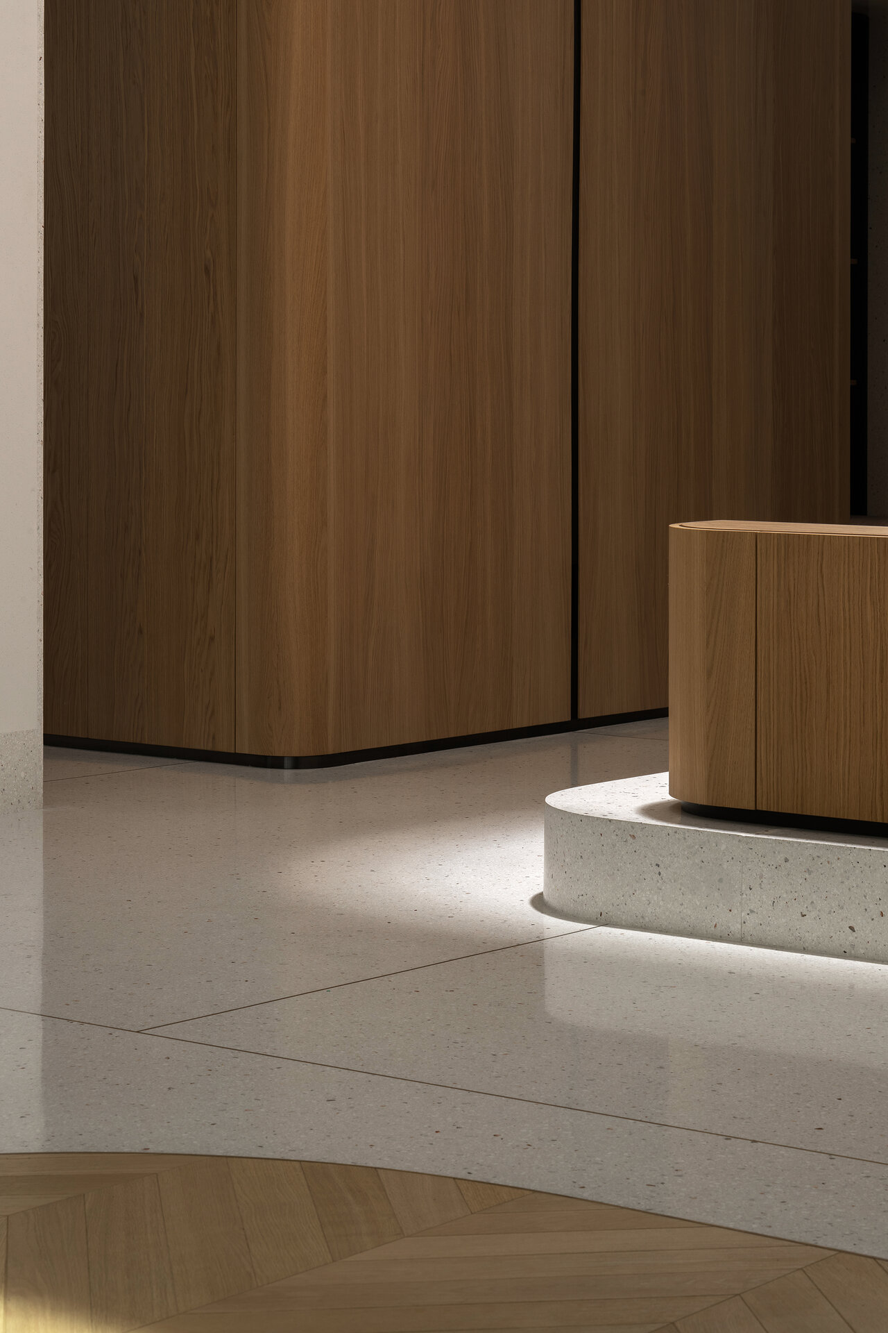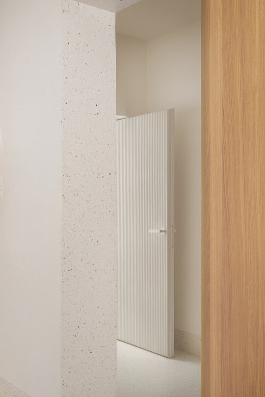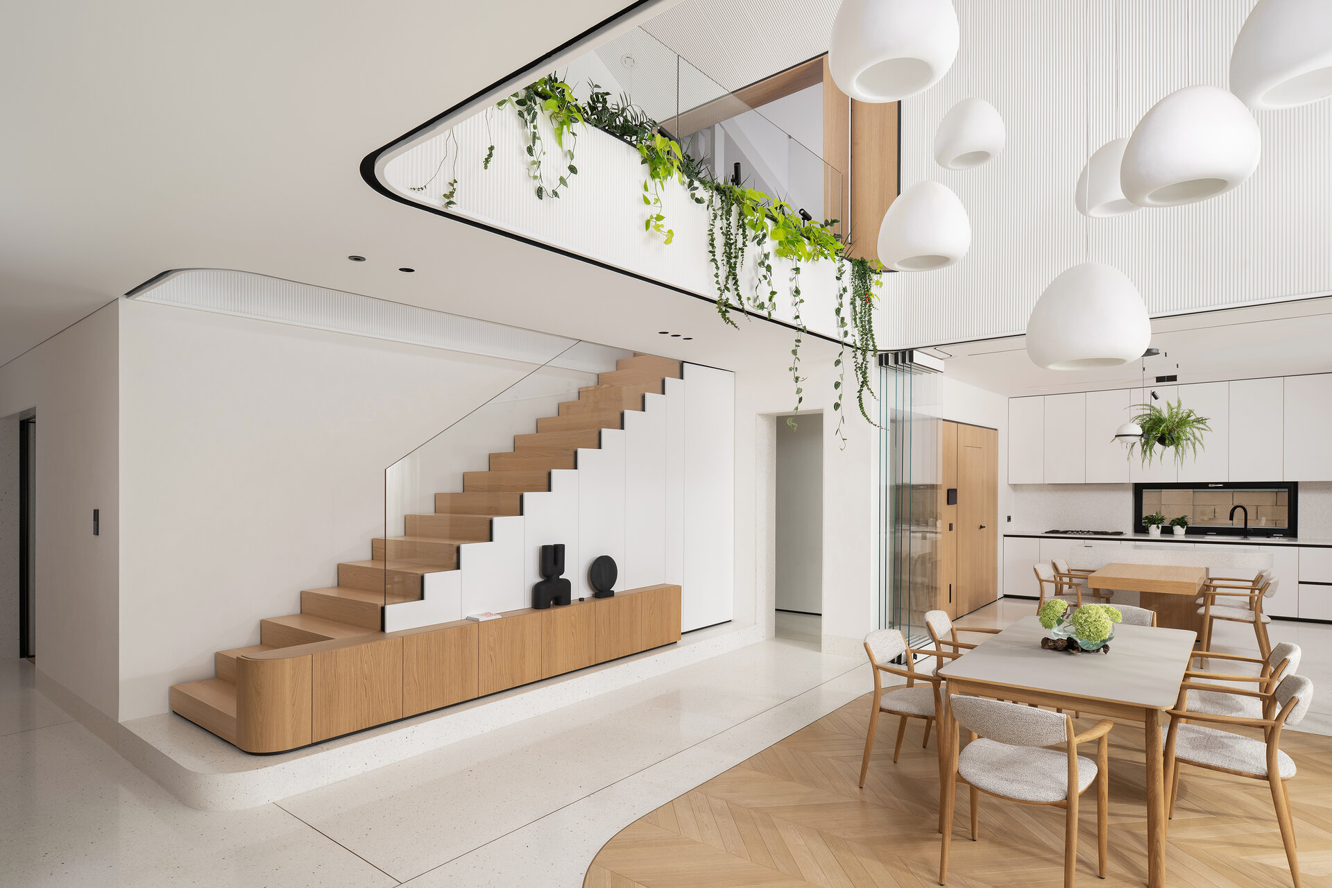 Caracterul vibrat și materialitatea „cojilor plutitoare” din casă nu își trag rădăcina doar din rațiuni estetice; ele potențează și completează sistemul radiant de răcire cu apă integrat în tavane. Corelarea și conlucrarea între disciplinele implicate în execuție au fost esențiale pentru integrarea subtilă a tuturor sistemelor de automatizare, a iluminatului artificial, a ventilației centralizate cu recuperare de căldură și pentru gestionarea atentă a detaliilor ce țin de etanșeitate și eficiență energetică – fără ca acestea să devină o prezență incongruentă cu linia estetică a proiectului și cu manualitatea tehnicilor tradiționale de lucru utilizate